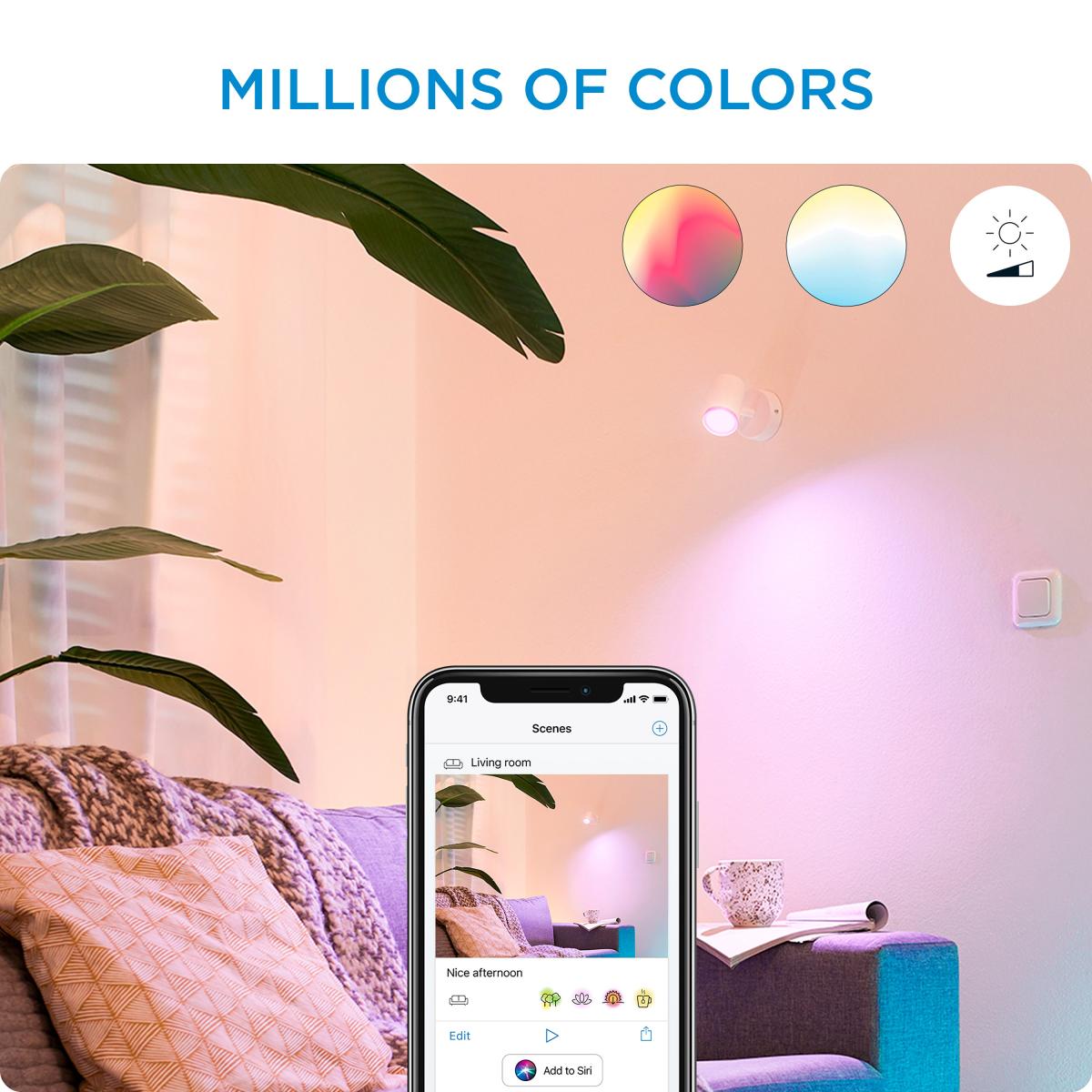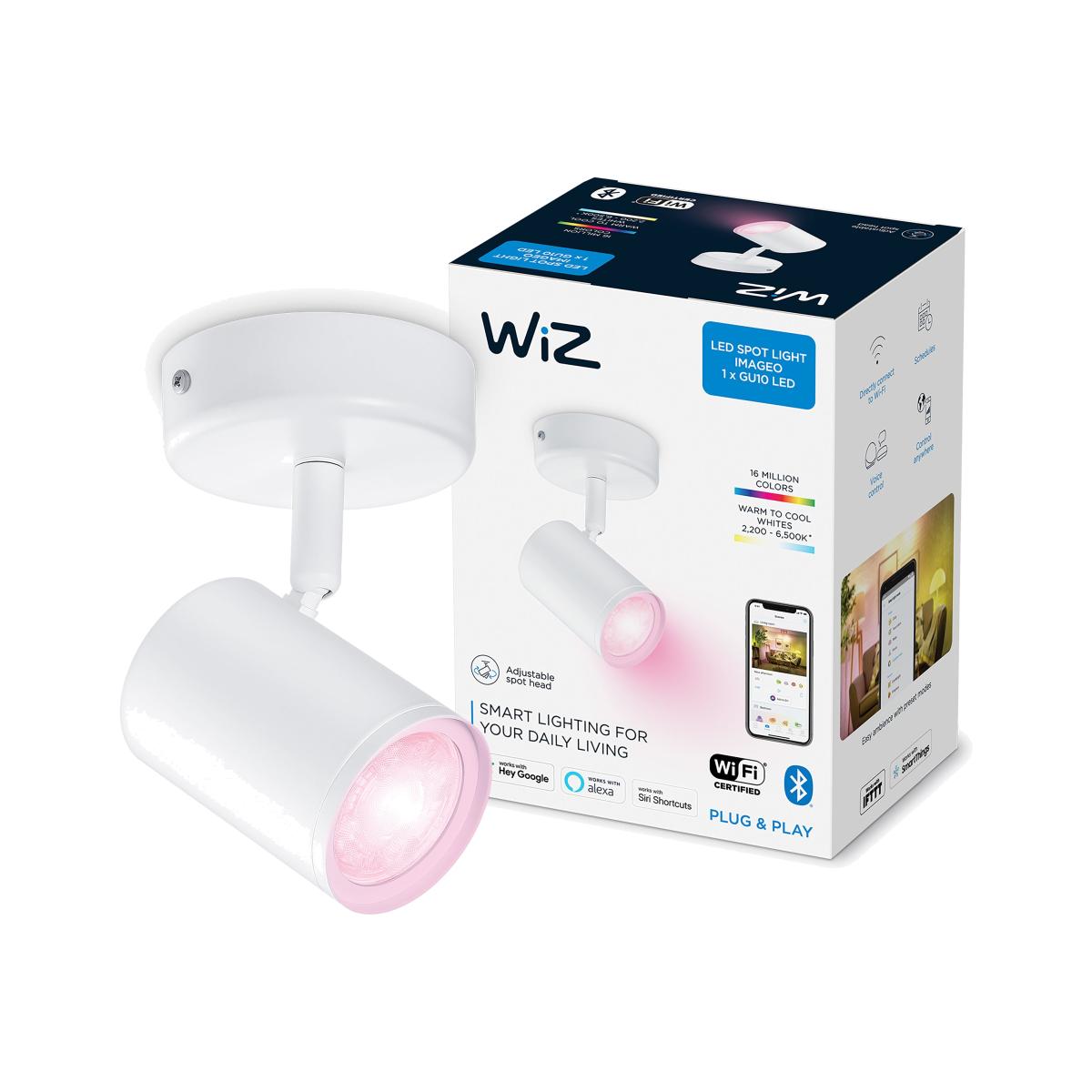 Bring some colour into your life with Wi. Z Imageo Smart 1 Light LED Adjustable Spotlight. With millions of colour options and changing light modes, you can set the right ambiance for any moment. The adjustable spotlight lets you direct the light exactly where you need it, and with its tunable warm to cool white light, you can create the perfect mood. Smart lighting is made simple with this easy to set up lighting solution. Smart Features: Experience the advanced technology of Philips' smart lighting system with Bluetooth and Zigbee compatibility. Enjoy the ability to choose from over 16 million colours to perfectly match your mood and style. With the convenience of being able to control your lights from anywhere, you have complete control over your home lighting, even when you're not there. Create groups to control multiple lights at once, giving you the ability to set the perfect ambiance in your entire home with just a few taps on your smart device. Whether you want to turn all the lights off, or adjust the brightness in your living room, you can do it all with ease using your smartphone or tablet.