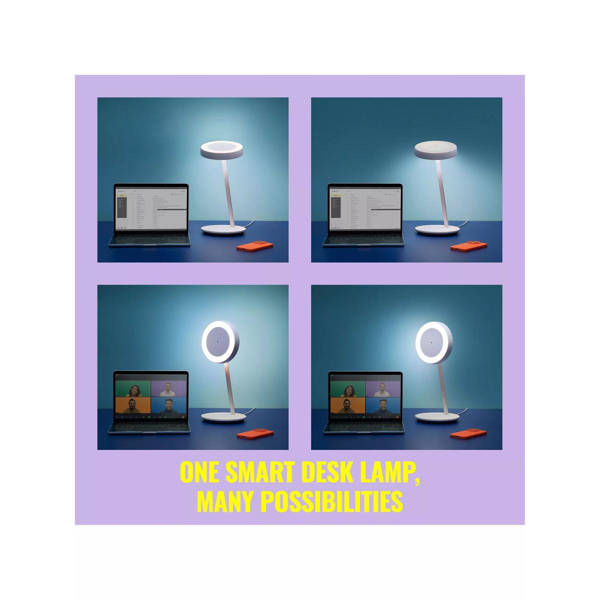 One light with so many uses. The multifunctional WIZ Portrait Smart Desk Lamp offers dual light zones, ideal for task lighting at your desk, video calls and even a relaxing bedside light. Simply rotate the head to switch from desk lighting to video call lighting. A specially designed diffuser generates soft, adjustable ring light to make you look your best online. The embedded brightness sensor detects ambient light levels and automatically adjusts task lighting to reduce eye strain when working long hours.