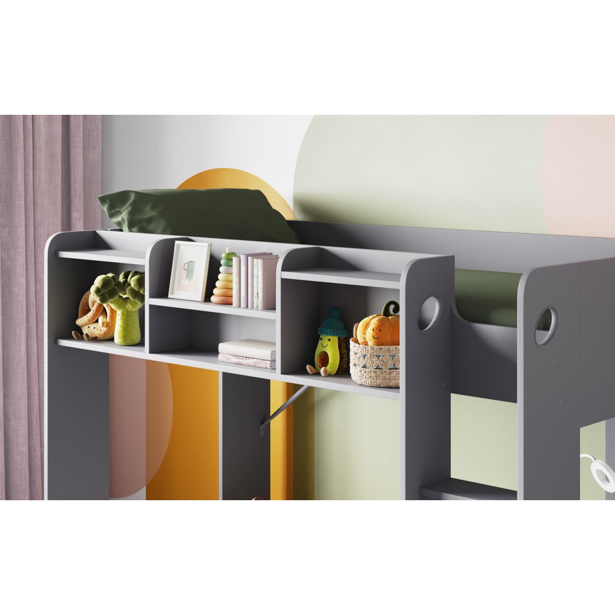 Introducing the Wizard L Shaped Bunk Bed Grey from Flair Furnishings. This unique bunk bed has been carefully designed and created to meet the needs of children and adults alike. Safety is the main priority with this bed, the ladder has been specially designed with this in mind to ensure easy and safe access to and from the top bunk sleeping area. The wide steps allow for greater foot stability, whilst the easy-to-use and comfortable ladder handles ensure your child has something solid to hold onto whilst climbing up and down. Another great feature of this bed is the vast storage space on offer, with ample shelving around the sleeping and space underneath the bed, making this bed frame a fantastic space saver. The L-shaped design gives the bed frame a unique, modern feel whilst also making this bed frame the perfect choice for children sharing a bedroom, or accommodating guests for sleepovers. Finished in a solid easy-to-clean grey finish the bunk bed is sure to fit perfectly within any bedroom setting.