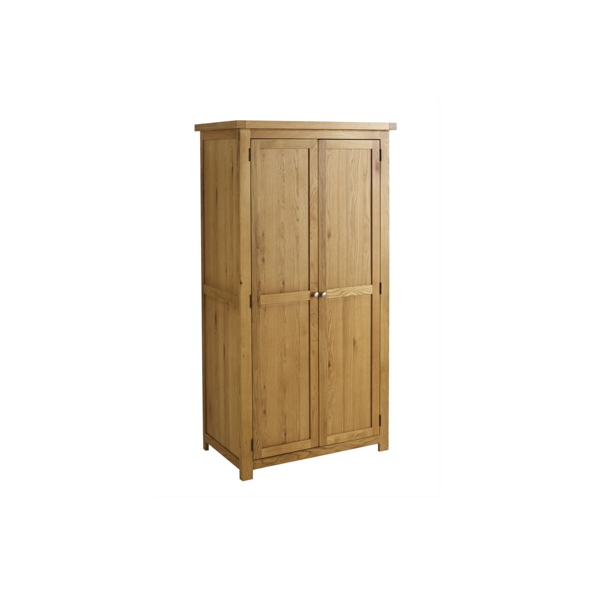 This Chunky, solid oak range highlights the prominent grain of the wood creating a rustic feel. Providing cup style handles creating versatility within its style, the Woburn range is suitable for a wide range of interior schemes. This 2-door wardrobe is spacious behind double doors, featuring a single rail, ideal for organising clothing. Why not re-style your bedroom today!