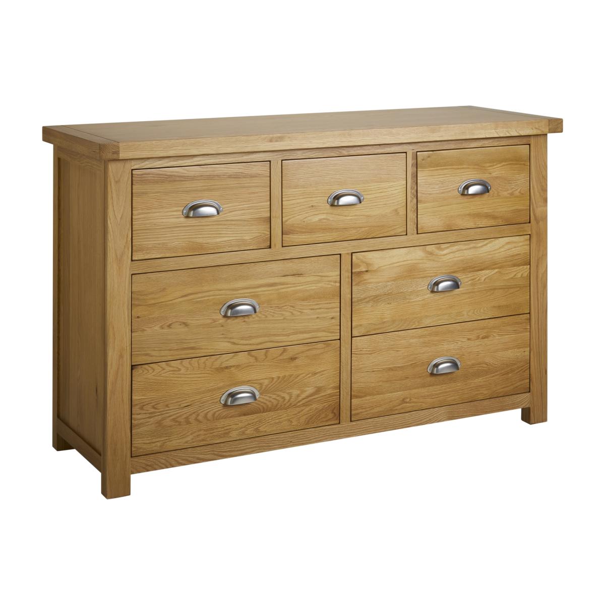 This Chunky, solid oak range highlights the prominent grain of the wood creating a rustic feel. Providing cup style handles creating versatility within its style, the Woburn range is suitable for a wide range of interior schemes. Featuring four large drawers and three smaller drawers, this 43 chest provides a generous amount of space to store clothes, linens and accessories. Why not re-style your bedroom today!