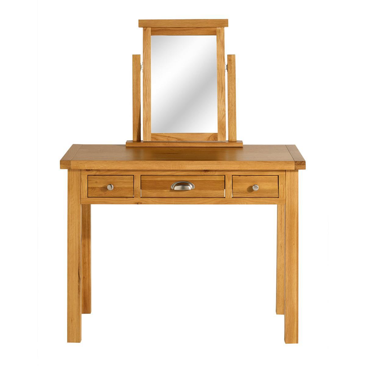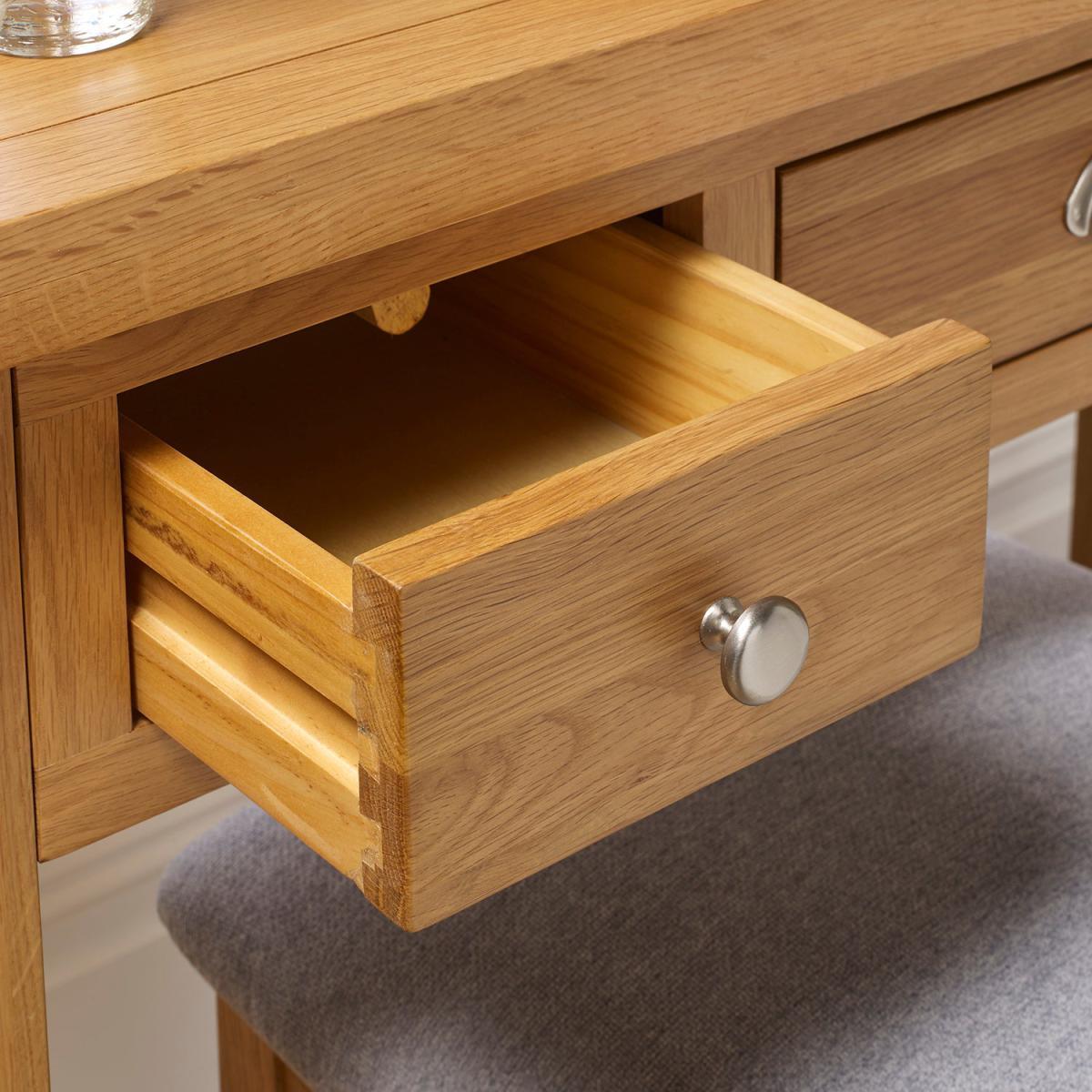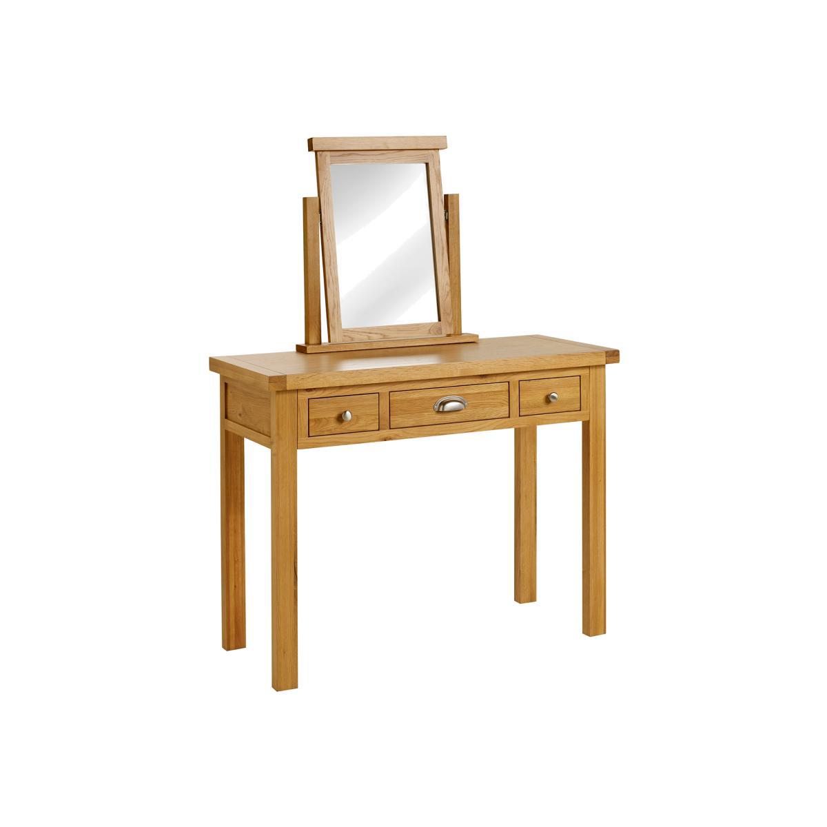 The Woburn Oak 3 Drawer Dressing Table offers practicality and 3 drawers for space to store away your accessories and beauty products. This 3-drawer dressing table looks great alone or teamed up with the Woburn mirror and stool. This Chunky, solid oak range highlights the prominent grain of the wood creating a rustic feel. Providing cup style handles creating versatility within its style, the Woburn is suitable for a wide range of interior schemes. Please note, unfortunately we cannot deliver this item to the Channel Islands.