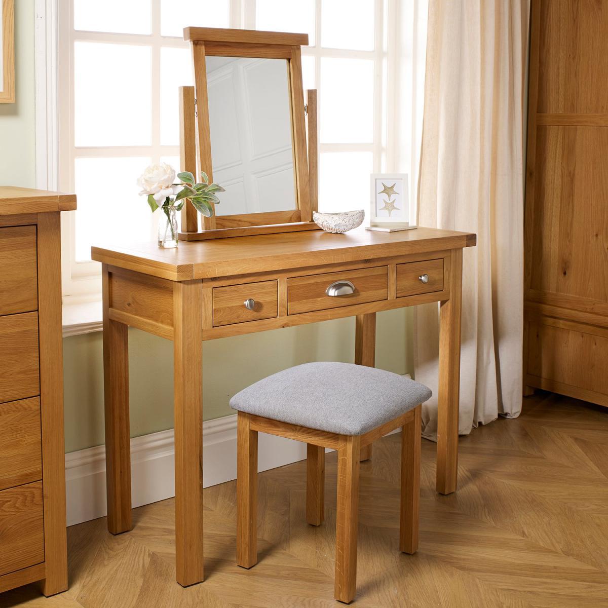 The Woburn Oak three-drawer dressing table is a versatile and timeless piece perfect for adding a warm, natural touch to a range of interiors, from traditional to contemporary. I love how its classic oak finish brings a sense of warmth and practicality, making it suitable for bedrooms with neutral, rustic, or even Scandinavian styles. Practical styling tips include pairing it with minimal vintage accessories or simple ceramic dishes for organisation, and placing a soft, textured stool underneath to keep the look light and inviting. It works especially well in light-filled spaces where the wood’s grain can be appreciated, but it can also be styled with colourful accessories for a more eclectic look. A great choice for adding function without sacrificing style.