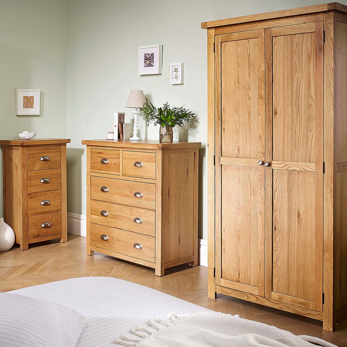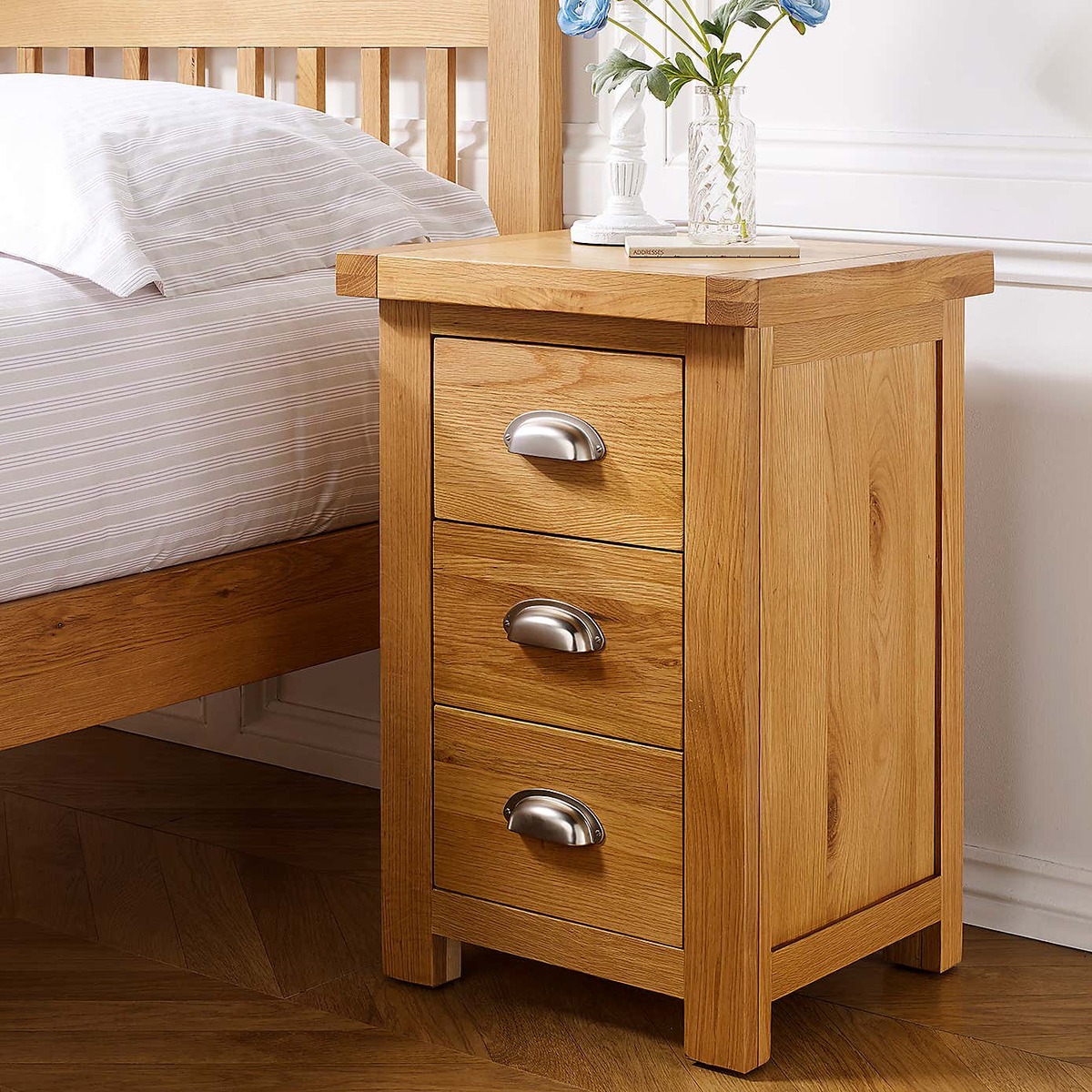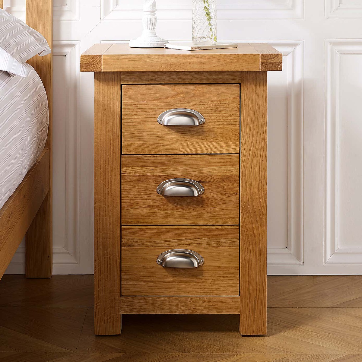 The Woburn Oak Large 3 Drawer Bedside works well in both traditional and contemporary interiors owing to its warm oak finish and clean lines. I love how versatile it is-adding natural texture to a minimalist scheme or complementing rustic and country-style bedrooms. Practical styling tips include keeping the top clutter-free with a small lamp, a clock, or a favourite book, while organising bedside essentials in the drawers ensures a tidy look. Its neutral tone makes it easy to pair with various colour schemes, and for visual interest, consider layering with textured or patterned accessories nearby. The understated yet functional design makes it a practical choice that seamlessly fits into most bedroom setups.