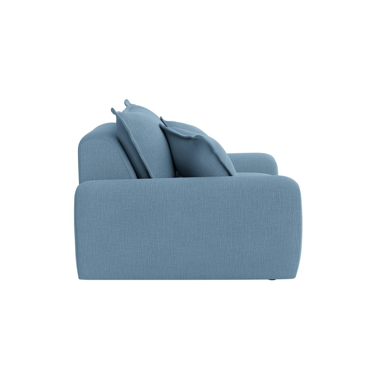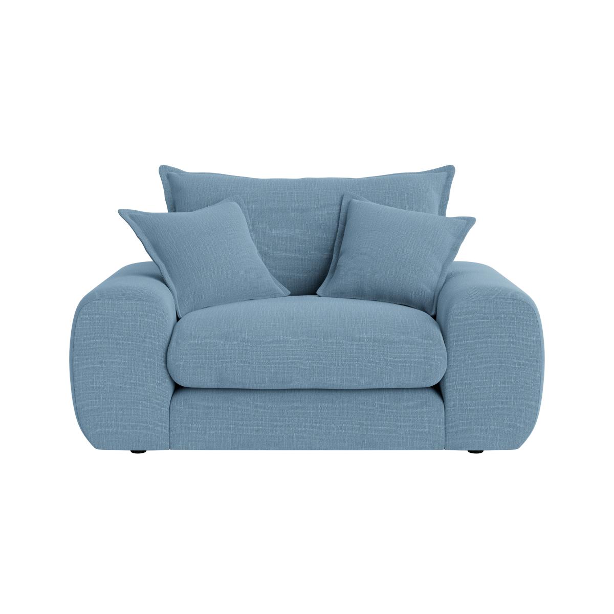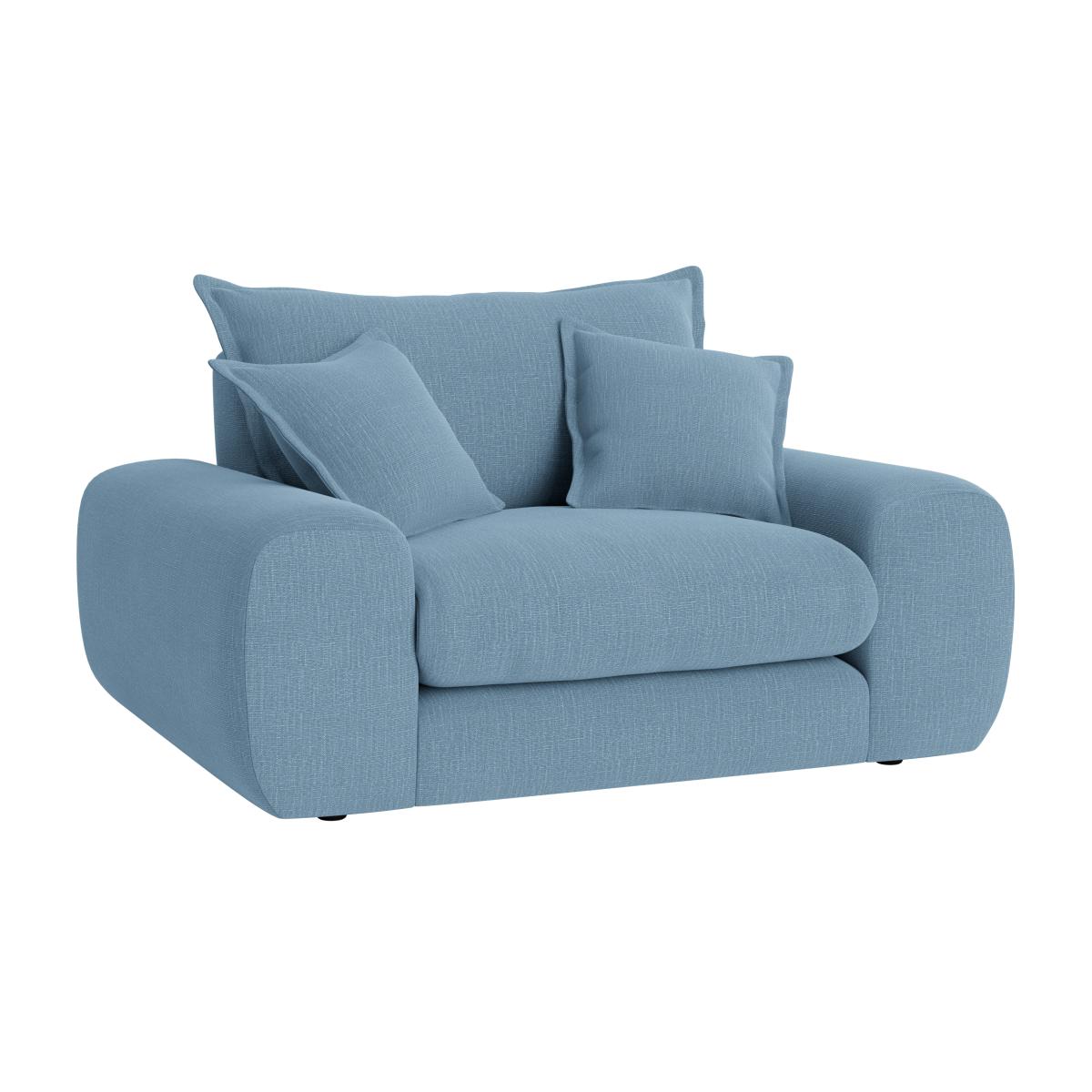 I love this love seat for its compact yet cosy design, making it a versatile piece that can slot into a variety of interiors. Its rounded shape and soft cushions lend a relaxed, inviting vibe that works well in casual living rooms, cosy corners, or even a Scandinavian-inspired space. The soft blue fabric adds a touch of colour without overpowering the room, and it pairs beautifully with neutral tones or other pastel accents. For styling tips, consider layering with textured cushions or throws to add depth, and place it near a simple coffee table or beside a minimalistic shelving unit to keep the look fresh and uncluttered. Its practical size makes it perfect for smaller spaces while still providing a comfy spot to unwind.