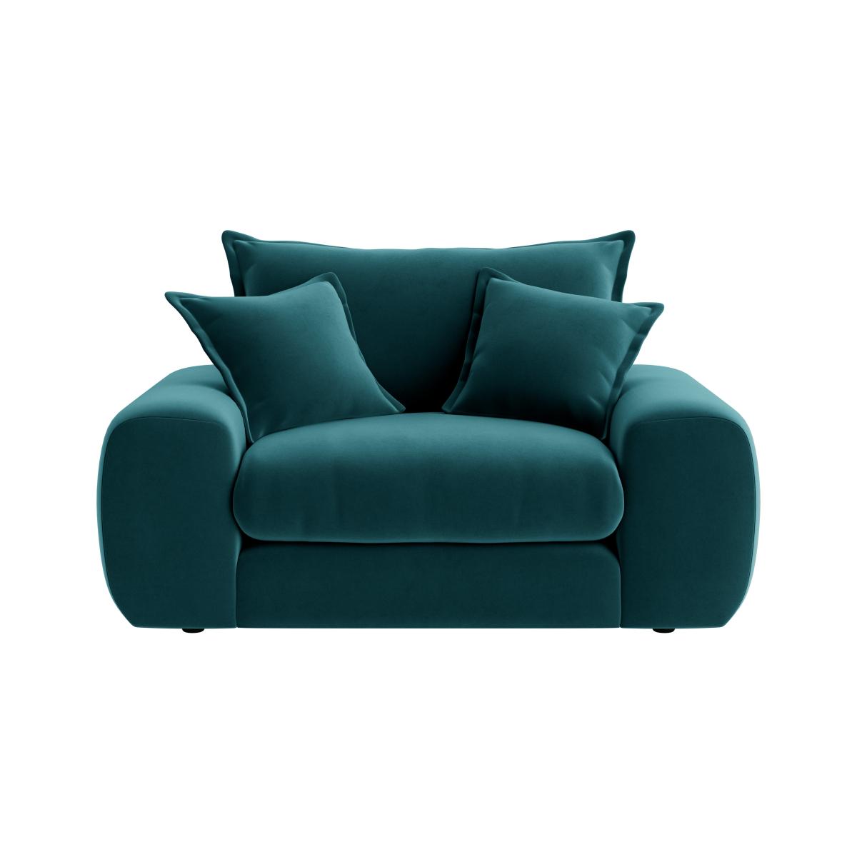 I love this love seat for its inviting shape and contemporary yet timeless appeal. It works well in both modern and cosy transitional interiors, making it versatile for various decor styles. The rich teal colour adds a pop of colour without overwhelming a space, and pairing it with neutral or soft patterned cushions can elevate the look. Practical styling tips include placing it in a corner with a floor lamp nearby for cosy reading nooks, or pairing it with a lightweight coffee table to keep the look clean and functional. Its plush form invites relaxation, while the solid colour and simple silhouette keep it stylish and easy to incorporate into a variety of schemes.
