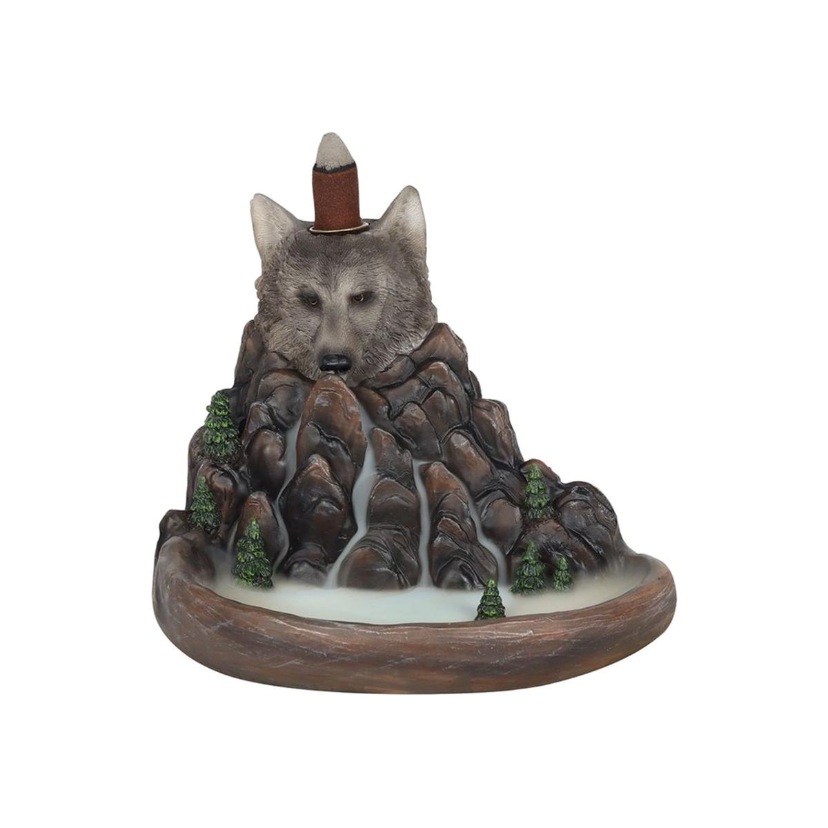 A grey wolf head emerges from tall, rocky cliffs on this unique resin backflow incense burner. To use, place a backflow cone on the wolf's head and watch the smoke stream down the mountainside and pool in the tree-dotted valley down below.