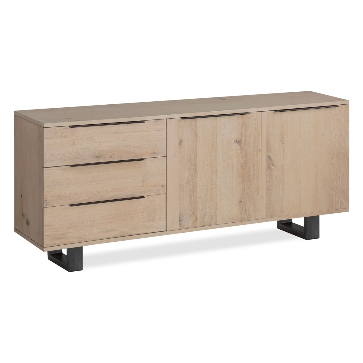The compelling Wolfe Large Sideboard, with its unique and natural imperfections, is elegantly sophisticated with a strong emphasis on character. This sideboard is striking and perfect for any contemporary designed home. Having a spacious double cupboard and 3 handy drawers, with contrast recessed handles and all mounted on sleek design metal legs, this unit will be perfect to hide away all your living needs.
