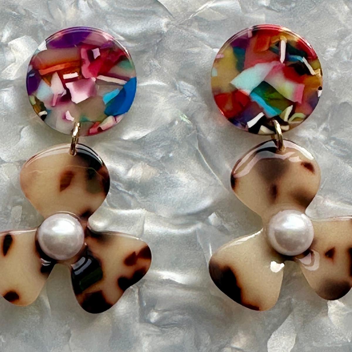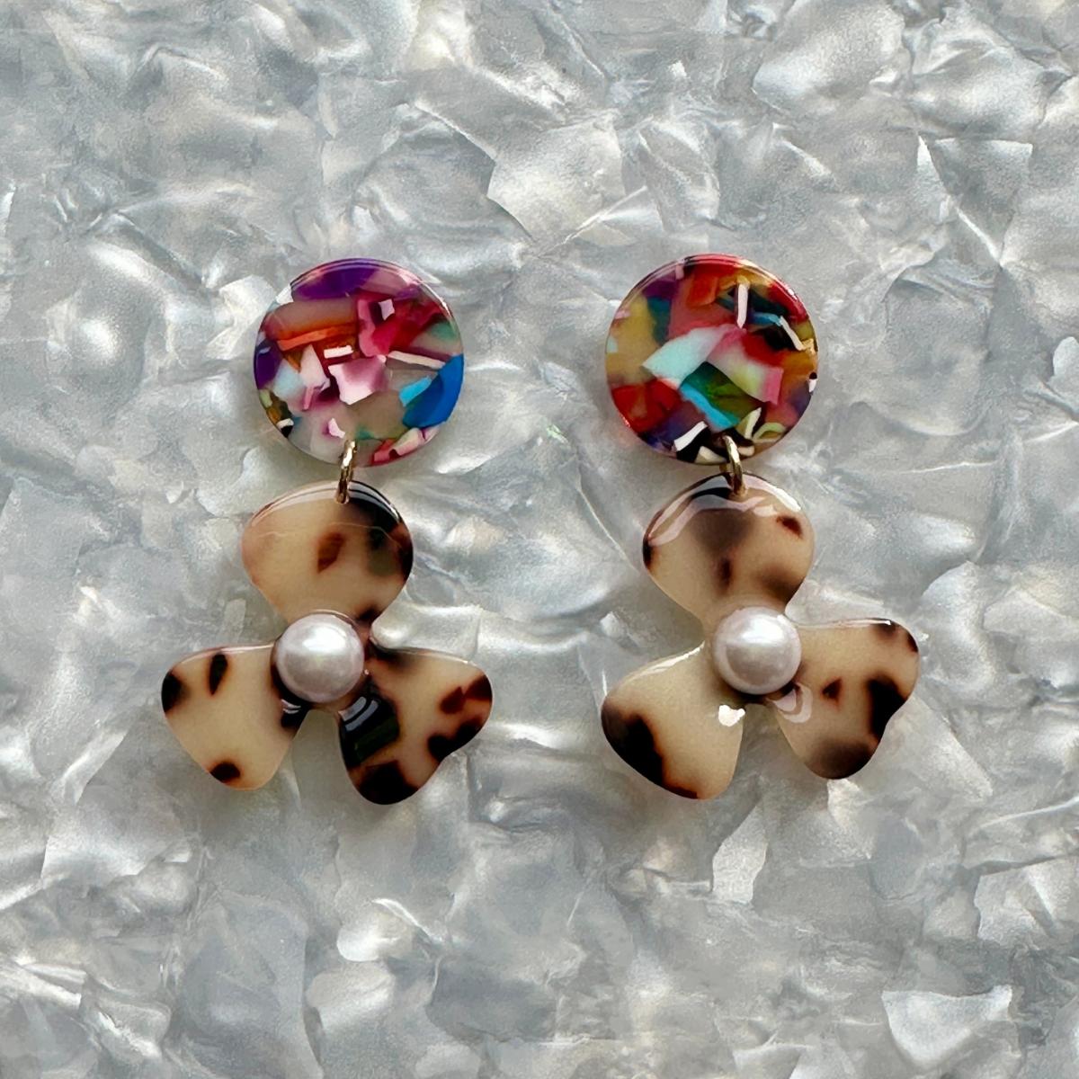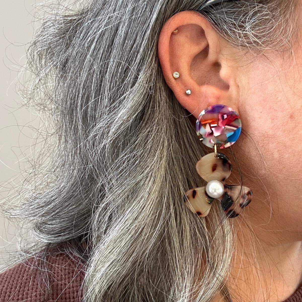 Our three-petal pearl water poppy drop earring is a must-have for any stylish babe. This lightweight, sweet pair features a blond tortoise acrylic flower with a white pearl-studded center, and a contrasting rainbow hand-swirled acrylic stud. Designed for Closet Rehab. Handmade in Pittsburgh, PA. Made in the USA.
