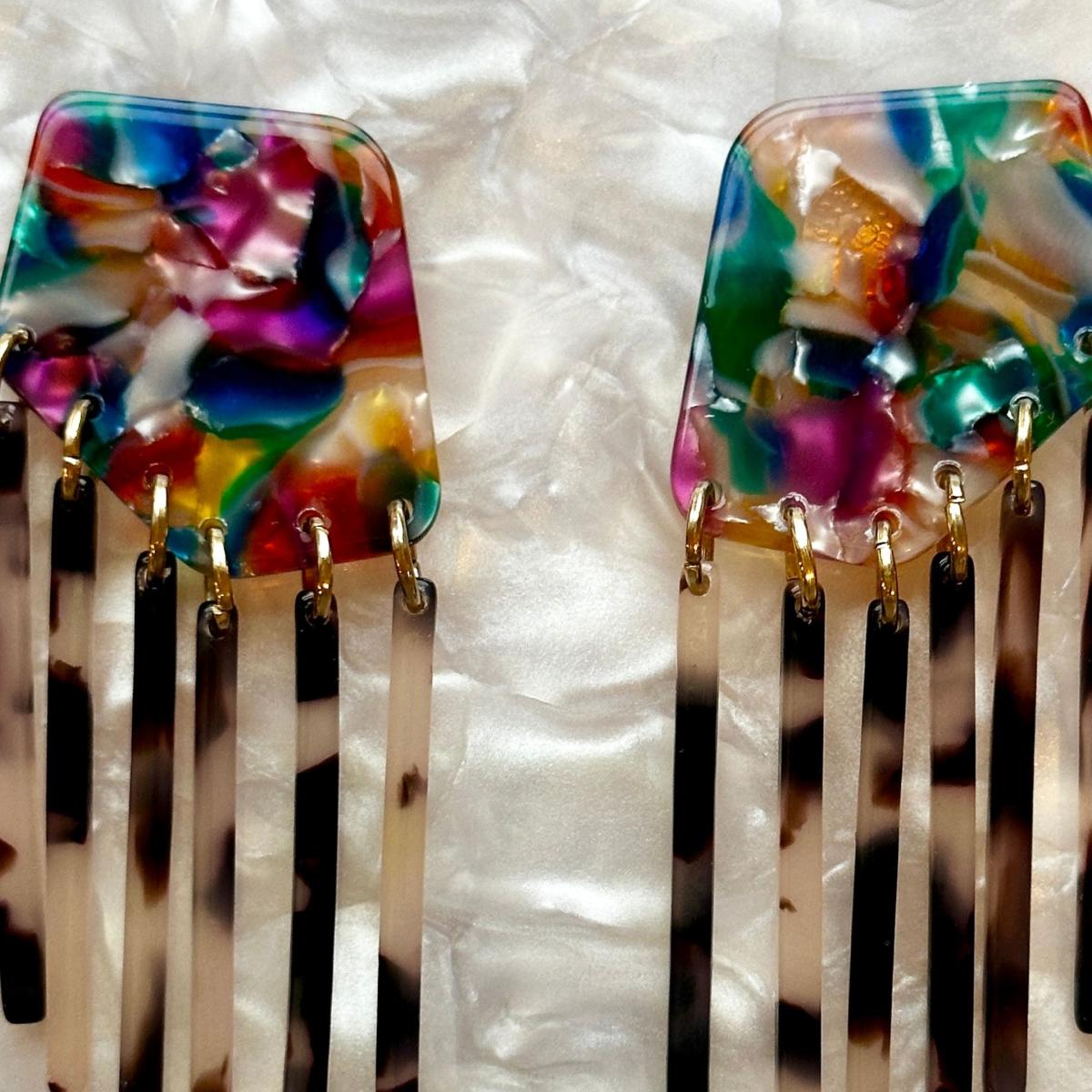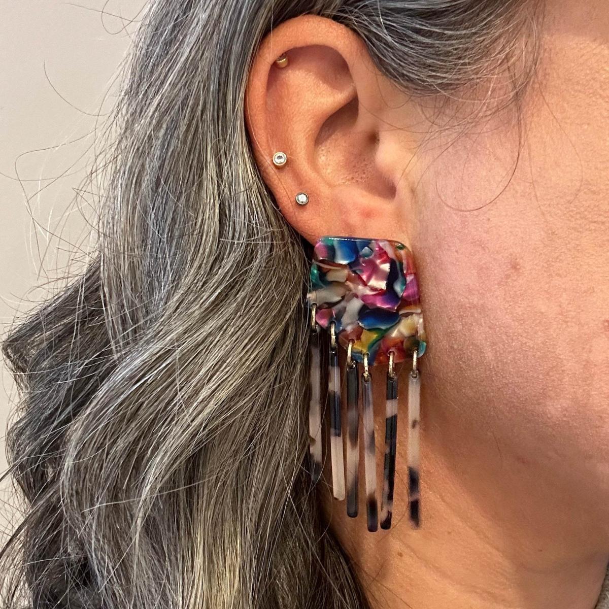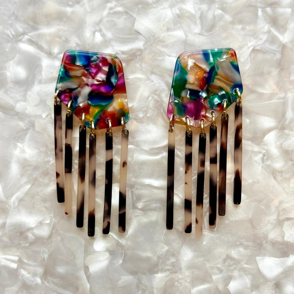 These lightweight acrylic fringe earrings feature a shield shaped stud in a rainbow mix of red, orange, yellow, green, and blue hand-swirled acrylic with a complimentary blonde tortoise flirty fringe detail.  These earrings were specially designed for Closet Rehab. Please check out our entire collection.