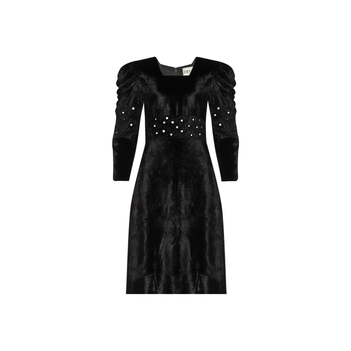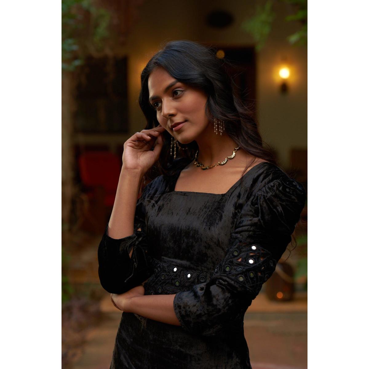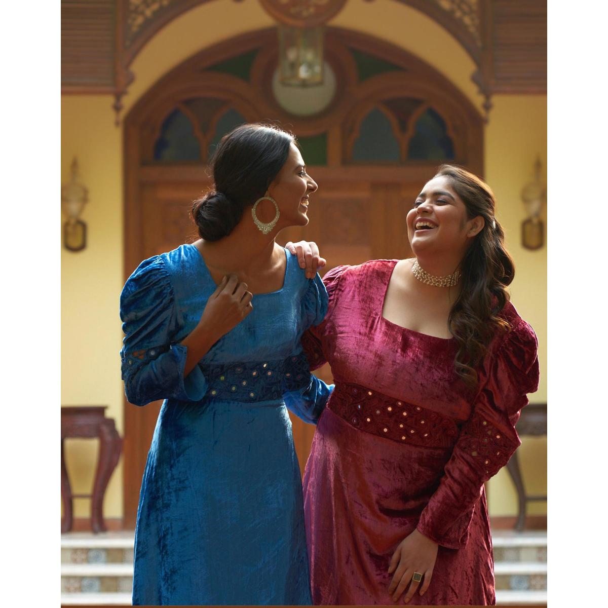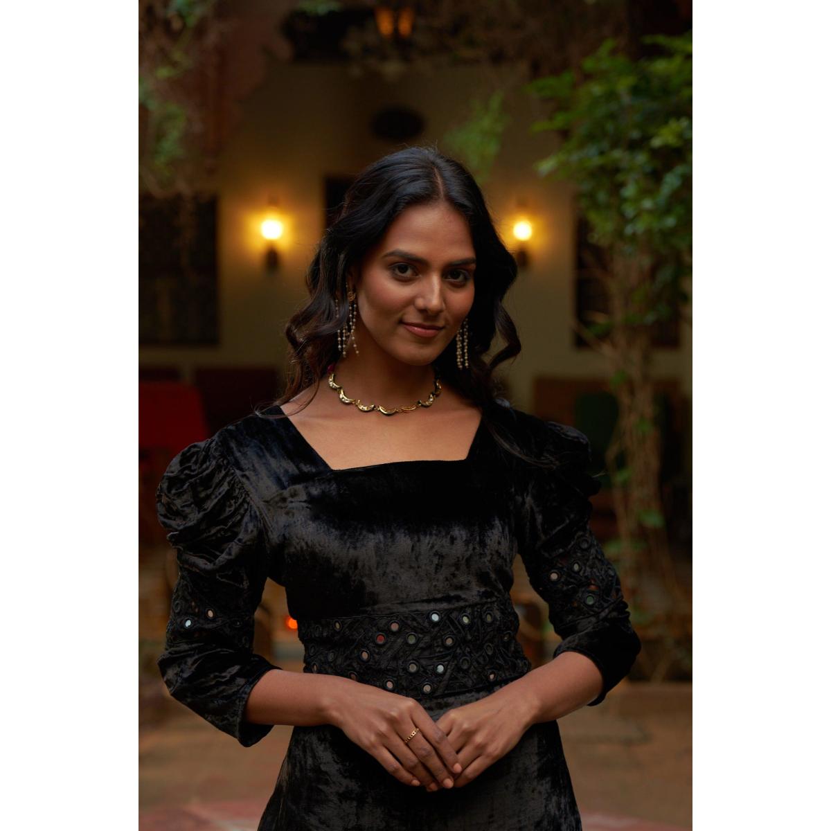 This dress combines the luxury of velvet with the age old mirror embroidery technique from India. Hidden inseam pockets Cutwork and mirror embroidery Square neckline Shell: 100% viscose velvet Lining: 100% viscose Dry clean or hand wash only. Free shipping and returns. Read our shipping policy for more details. Transcend is a female and Bipoc owned business that pays living wages to everyone in its supply chain and and gives back 2% of revenue to directly benefit the artisans who created the pieces.