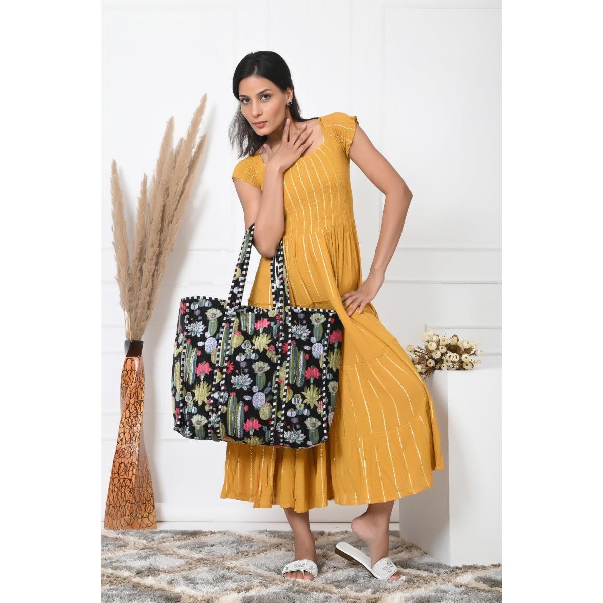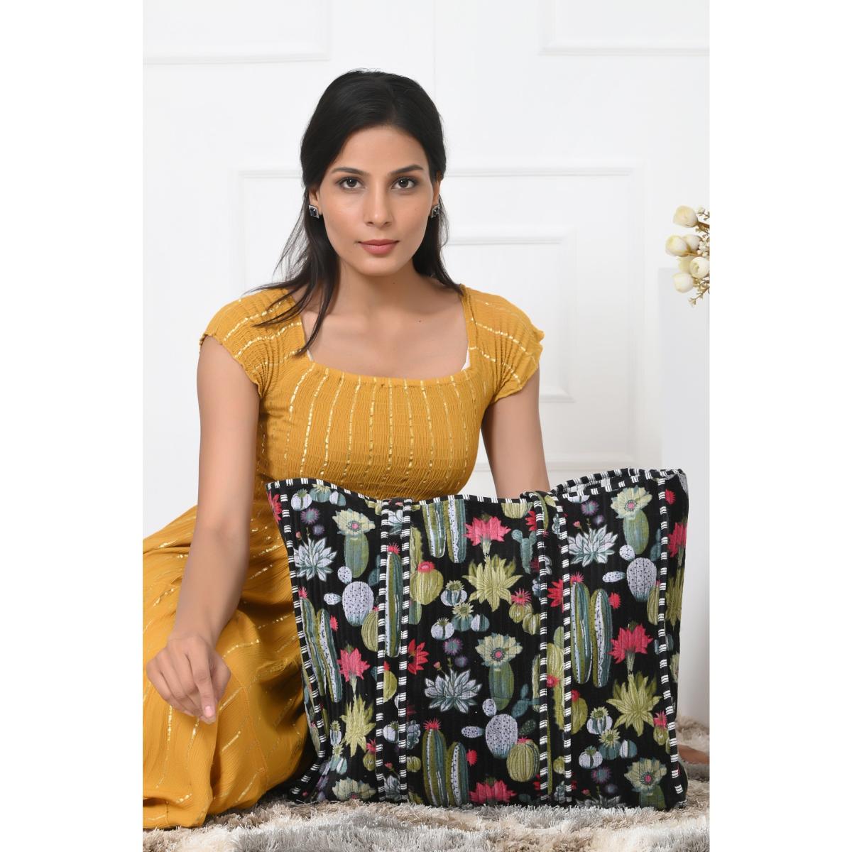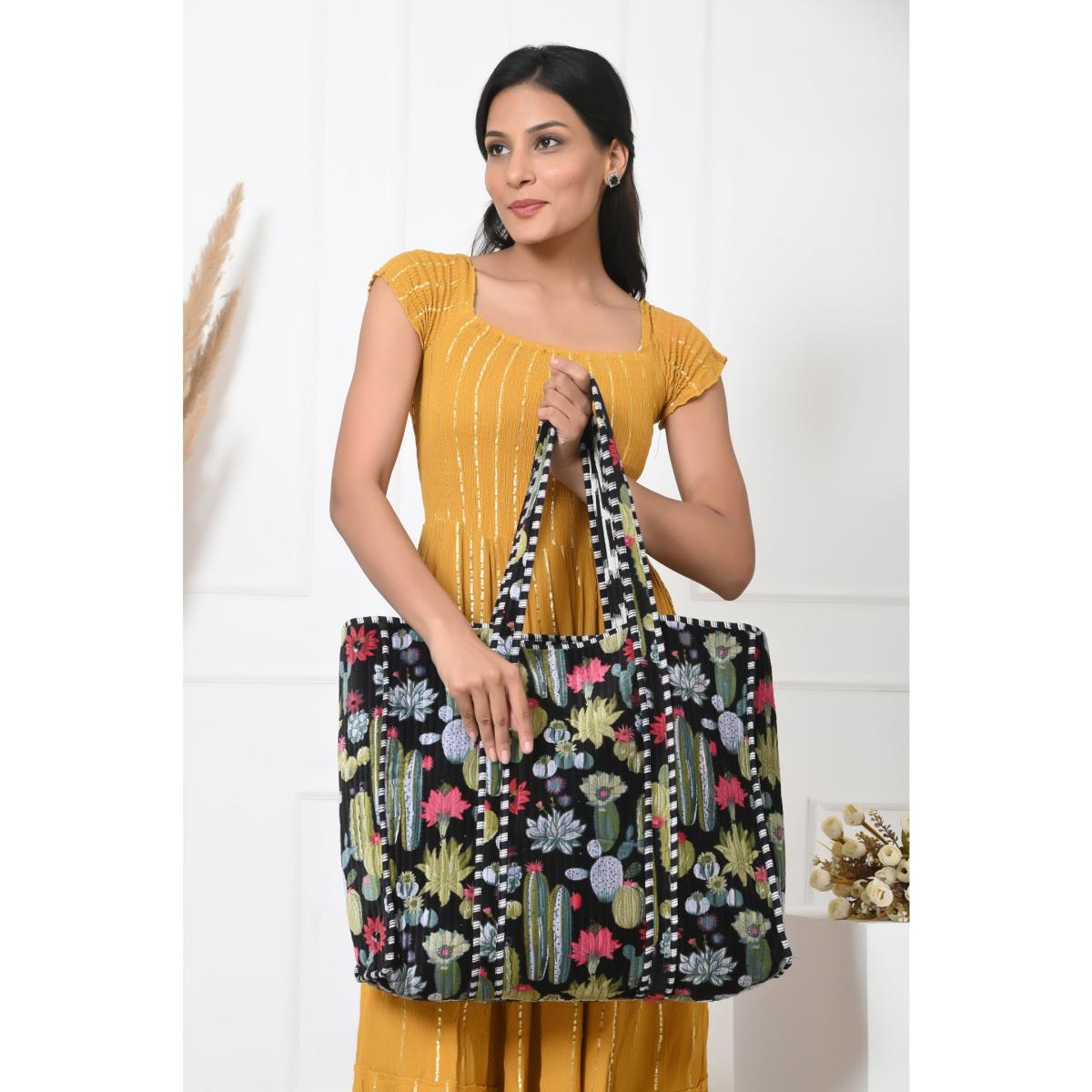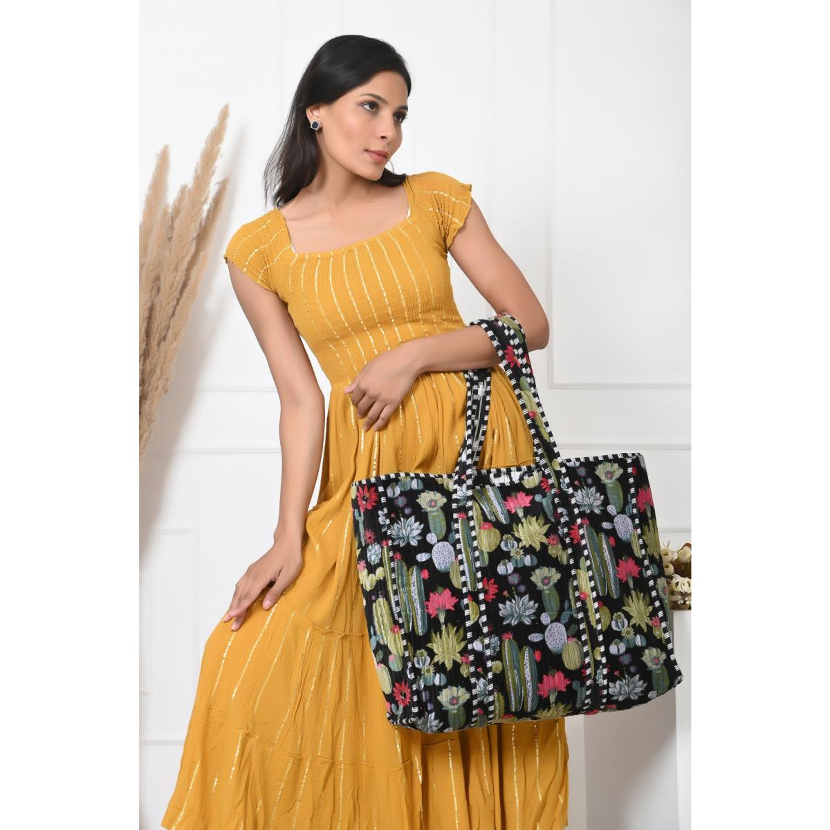 Introducing our Tote-ally Amazing Tote!Step into a world where elegance meets functionality with our meticulously handcrafted tote bags, a labor of love from Indian artisans using luxurious quilted cotton. These versatile totes are designed to elevate your everyday adventures while supporting sustainability. At a generous 18 x 18 inches, our bags offer ample space to carry all your essentials. With a convenient 25-inch shoulder strap, transportation is comfortable and hassle-free.