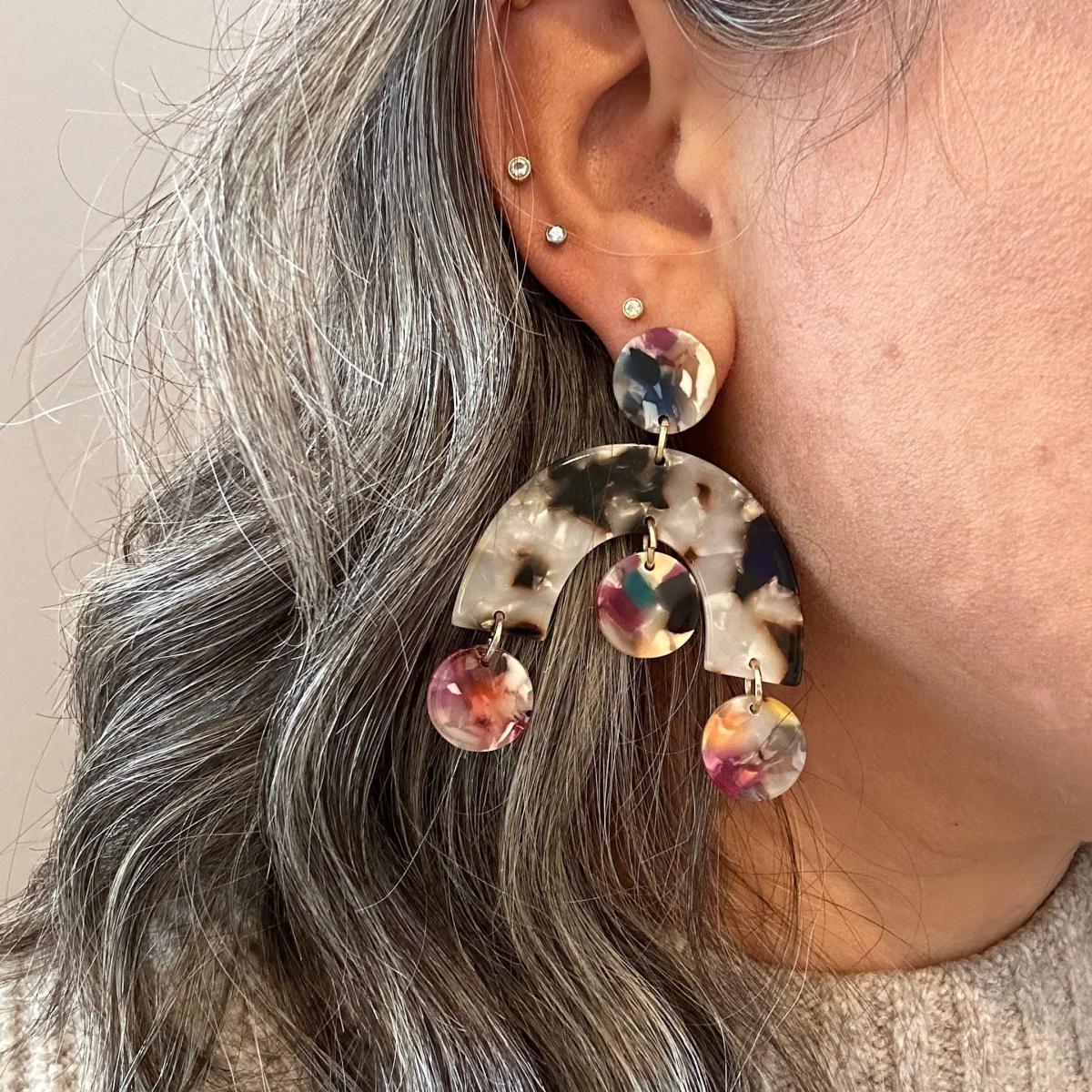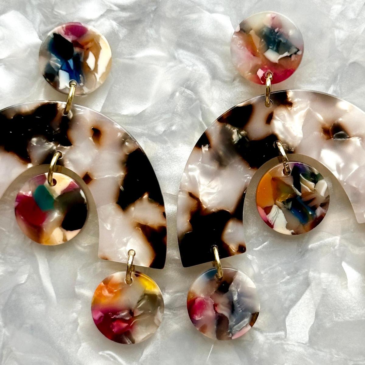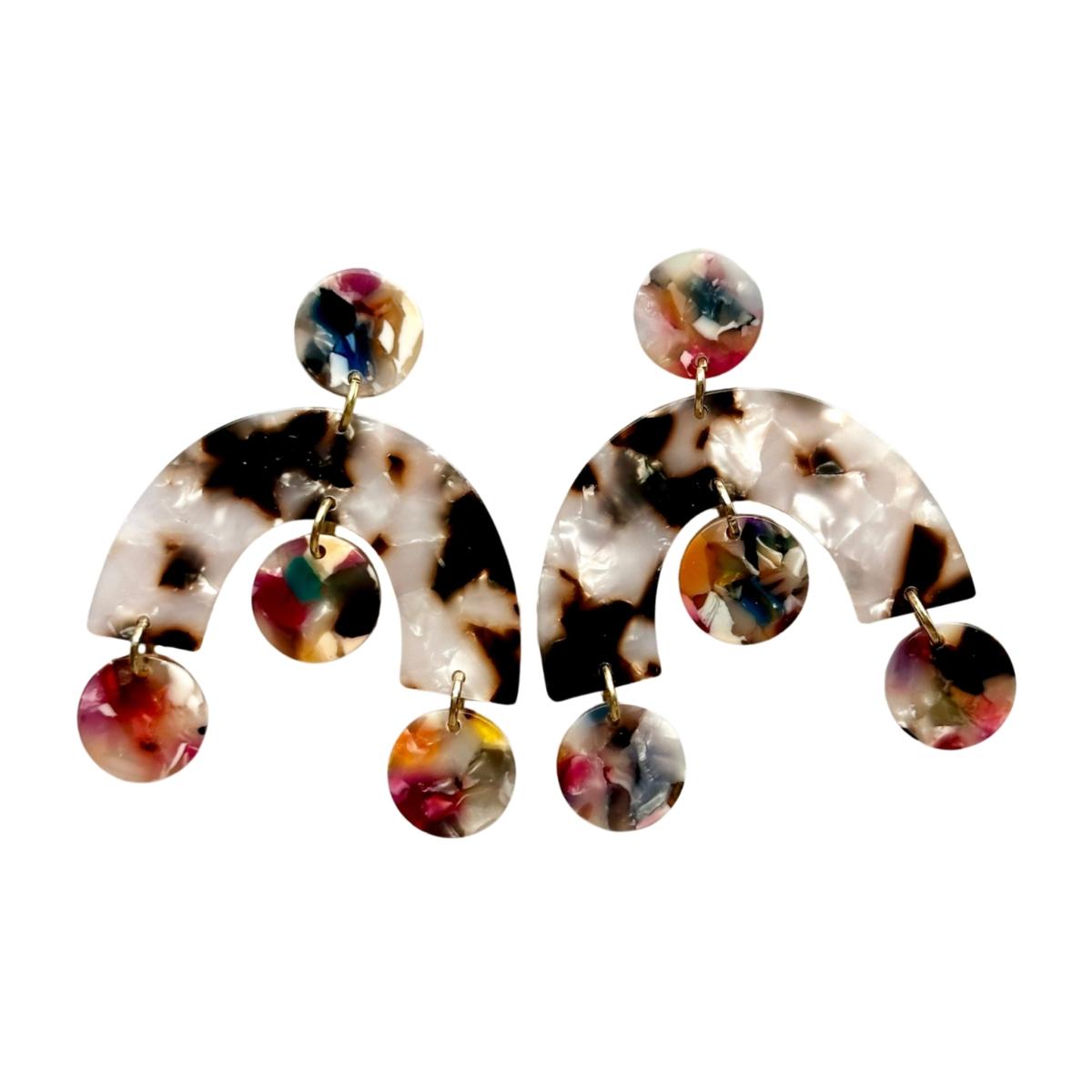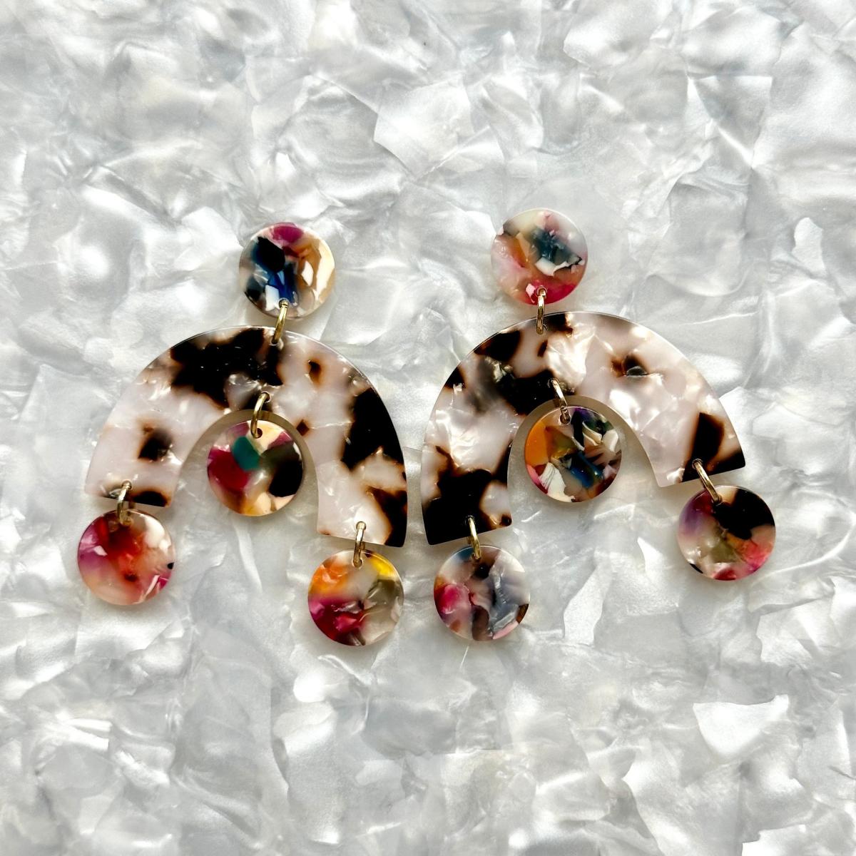 These lightweight acrylic arch drop earrings feature an arch drop in a pearly tortoise acrylic with light multicolor accents. These earrings were specially designed for Closet Rehab. Please check out our entire collection.