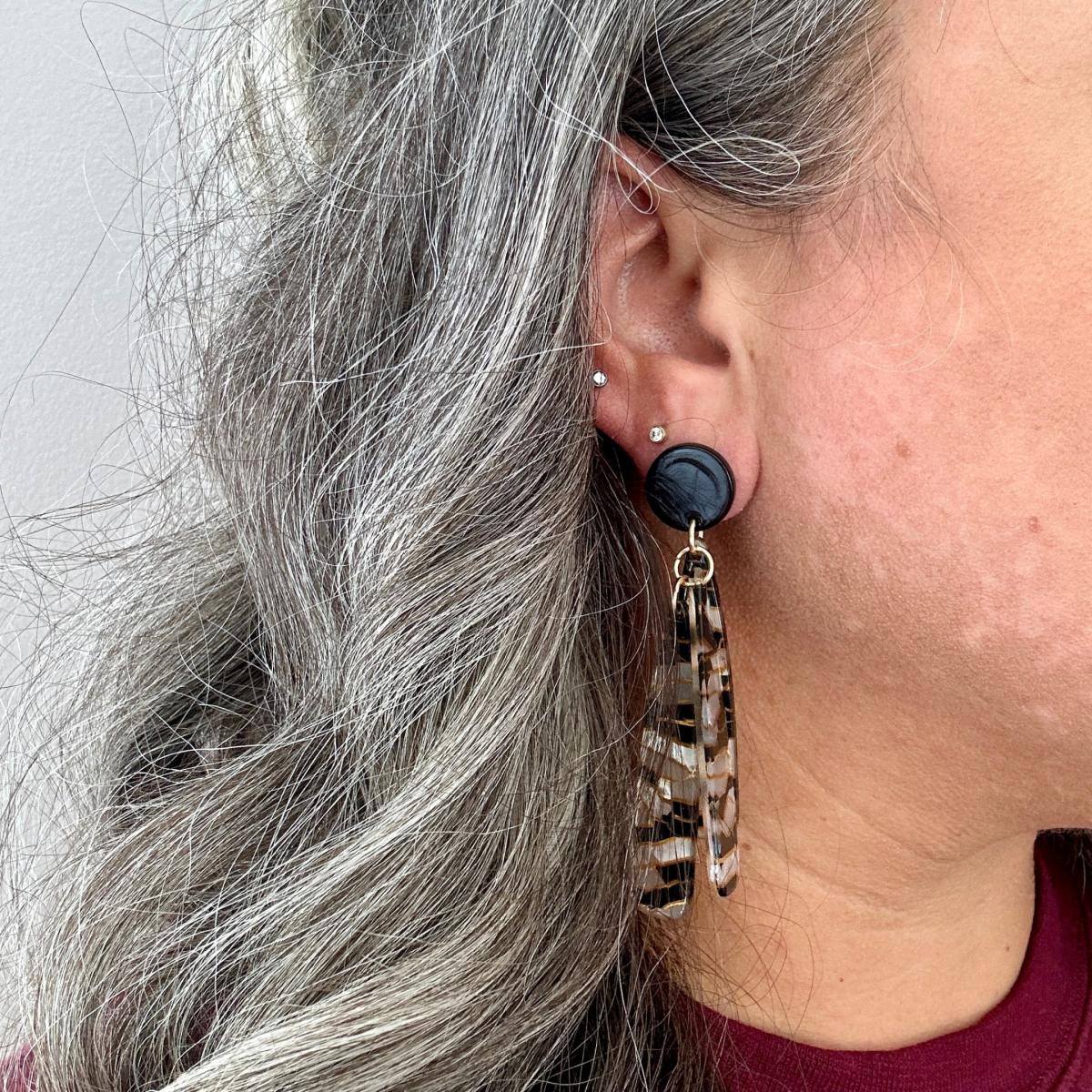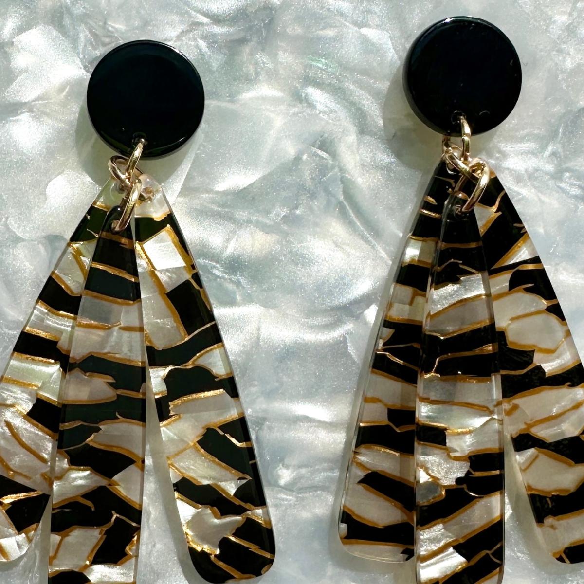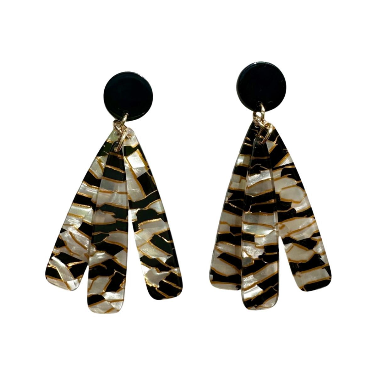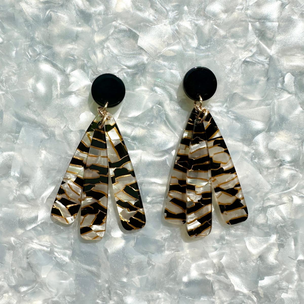 Add a feminine and flirty touch to your look with our petal drop earrings. These unique earrings feature a playful trio of black, white and gold crackle acrylic petals dangling from a complementary black mini circle stud. Designed for Closet Rehab. Handmade in Pittsburgh, PA. Made in the USA.