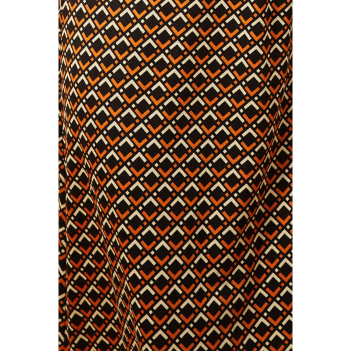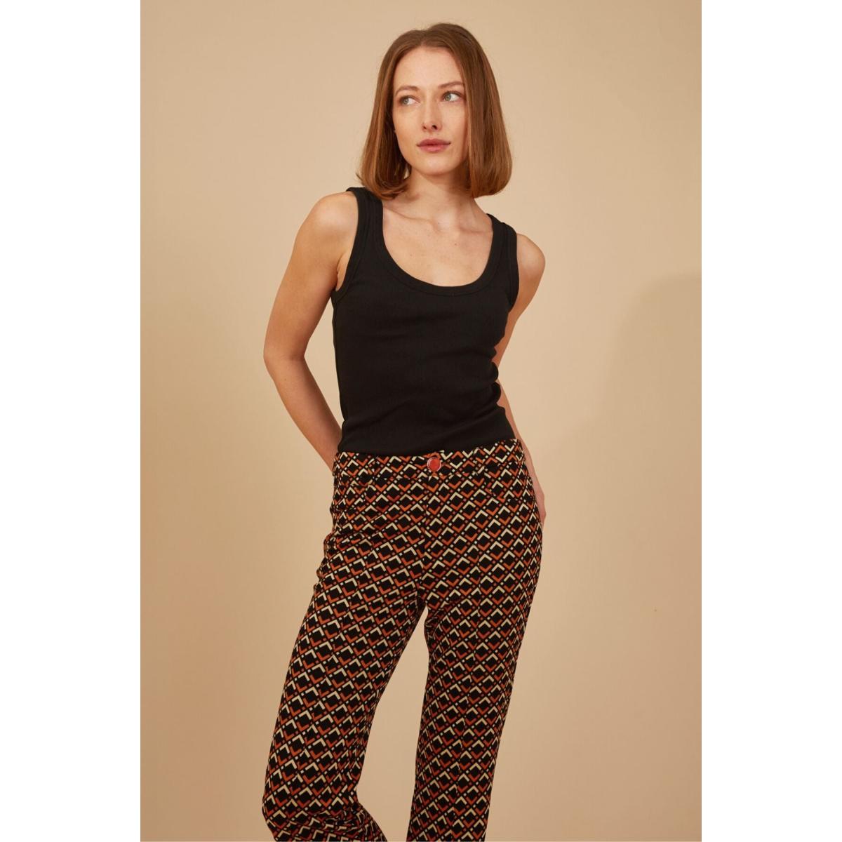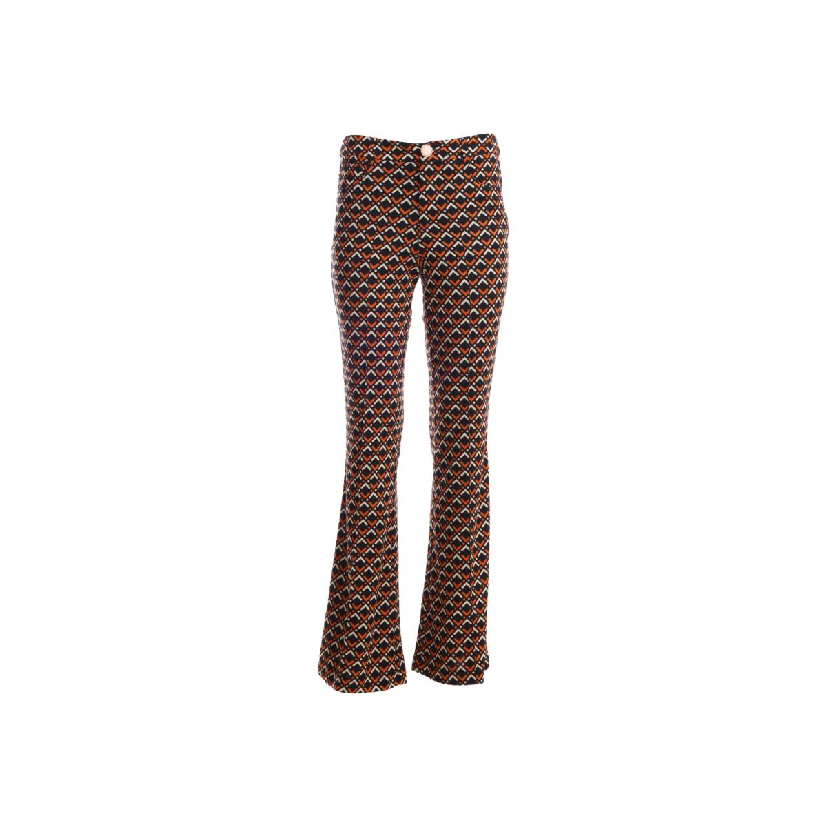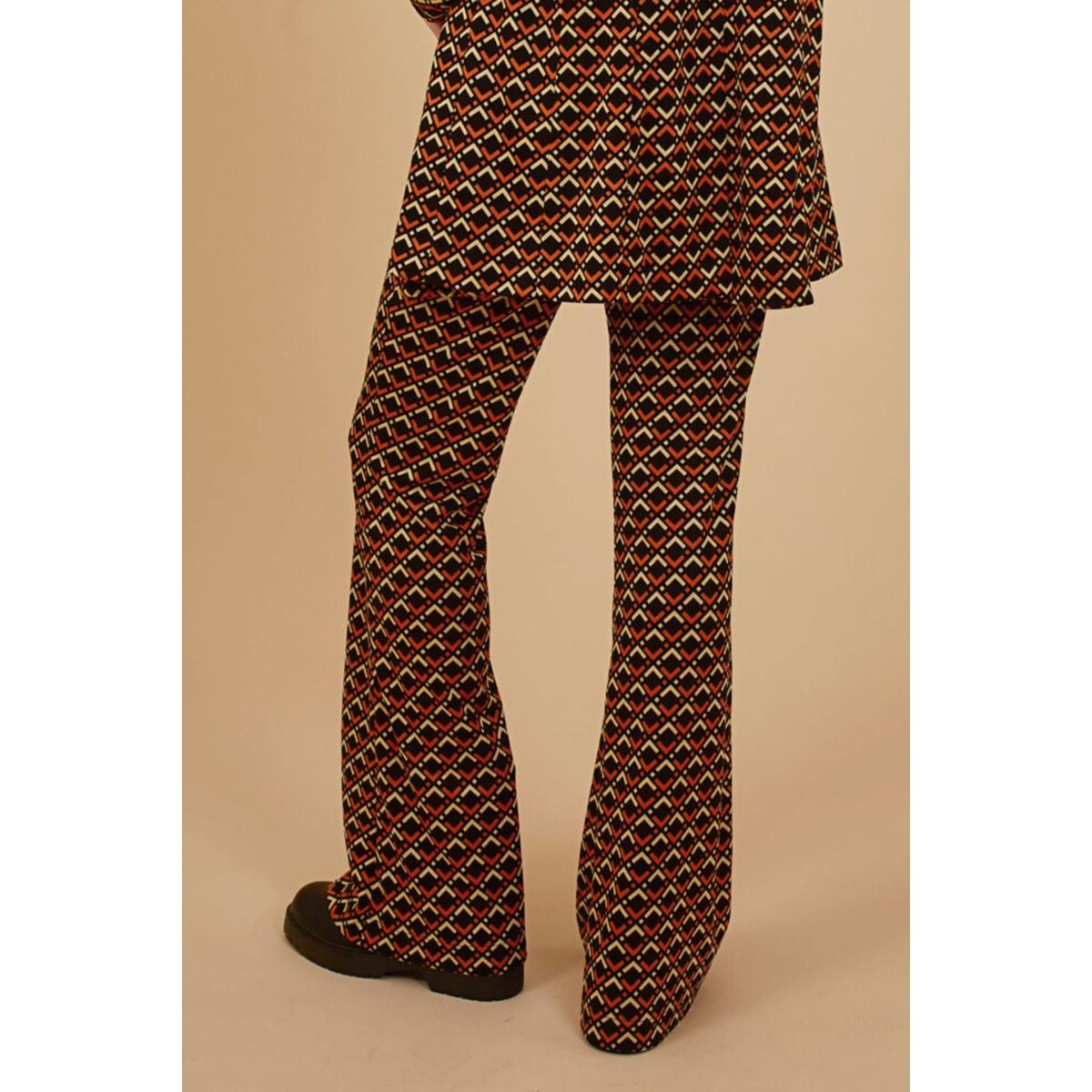 Our kick flare trousers are always a best-seller. They're back and even more fabulous in our black and orange geometric Clock Work Orange print, in a soft cotton blend. Fitted trousers with the perfect flare. Featuring a concealed front zip and button closure, and front and back pockets. Add a pop of pattern and colour to your winter wardrobe.