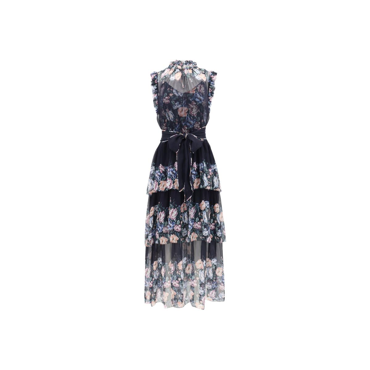 Our classic Christian body newly features a placed floral print for Fall 23. This full length dress is cut in our whimsical silk crinkle chiffon quality. It is lined with a printed jersey slip and finished with an Ebony rhinestone button at the center front neck. Ships with a self-tie belt. Dry clean only