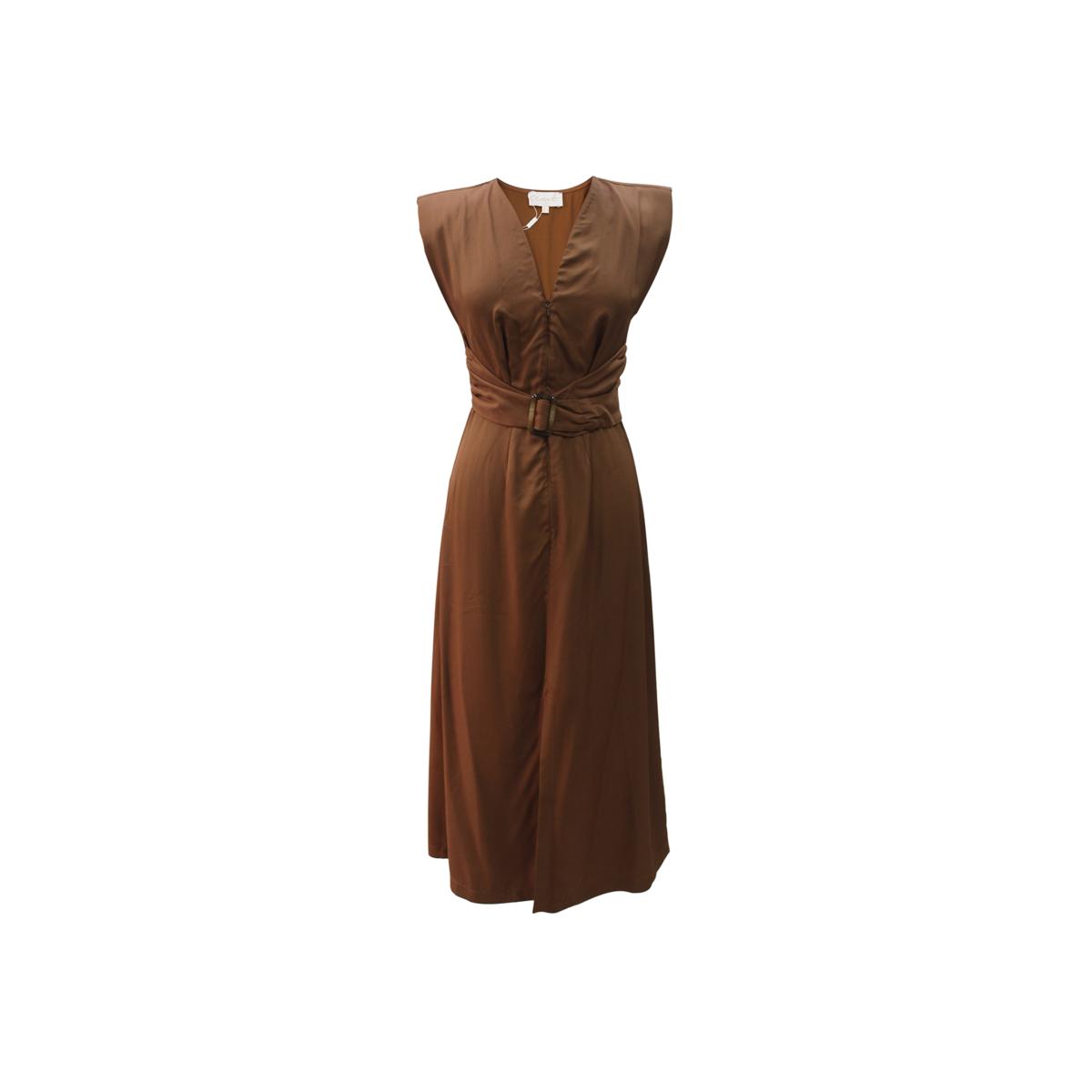 This rust dress features a copper shimmer and an V-neck that can be more plunging depending on how high you zip it up. It has an A-line midi skirt with a centre front split. The shoulder pads and half-belt that cinches at the waist create the perfect hourglass figure.