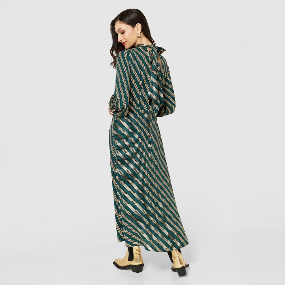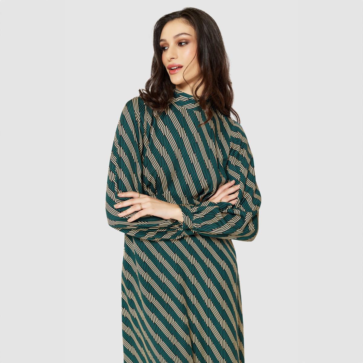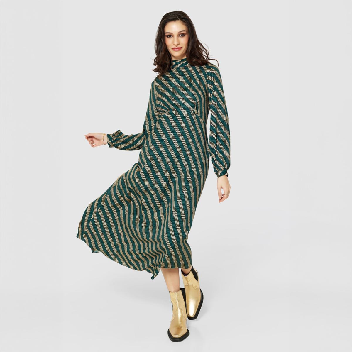 The perfect winter dress, it’s full of possibility, you can dress it up or down to match any occasion in your diary. Here we have teamed it up with statement boots which is both work or weekend appropriate. Add heels for a dressier occasion. The Viscose Twill is printed with a subtle geometric stripe design.