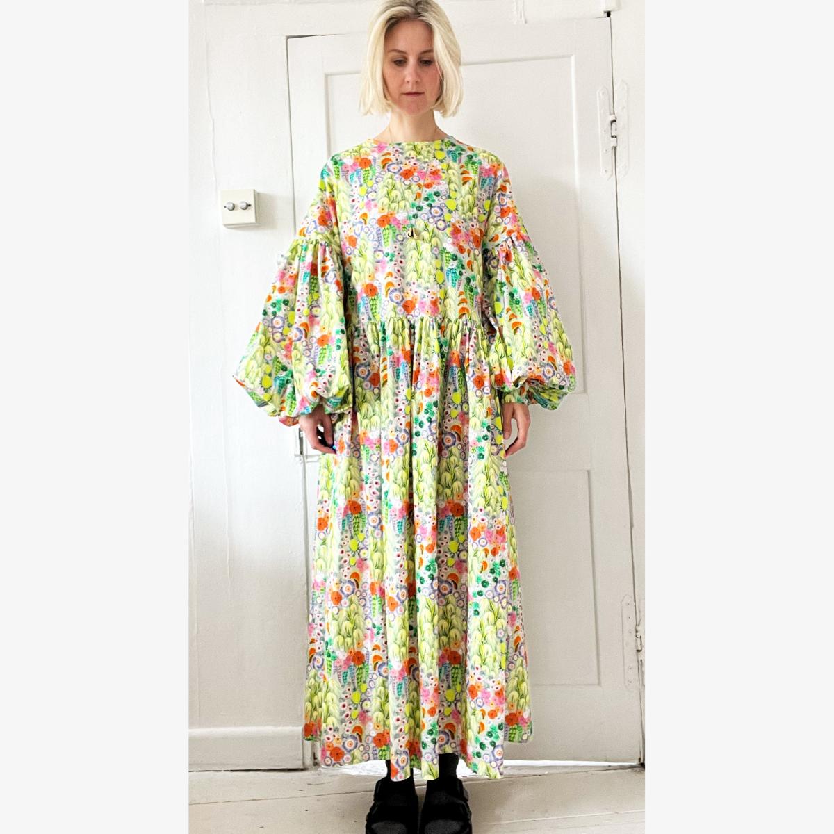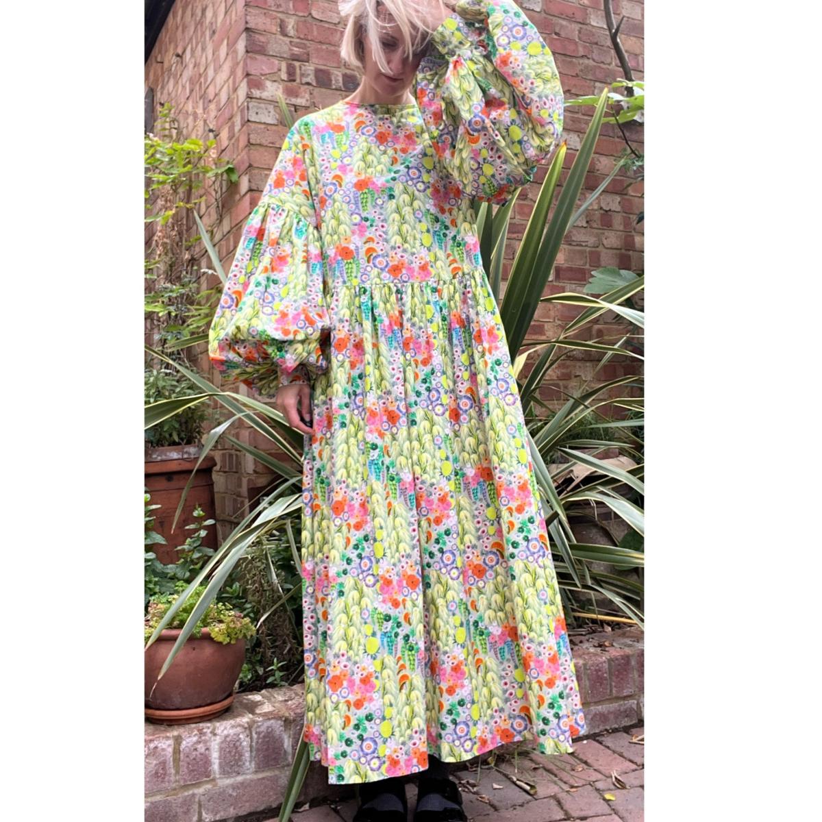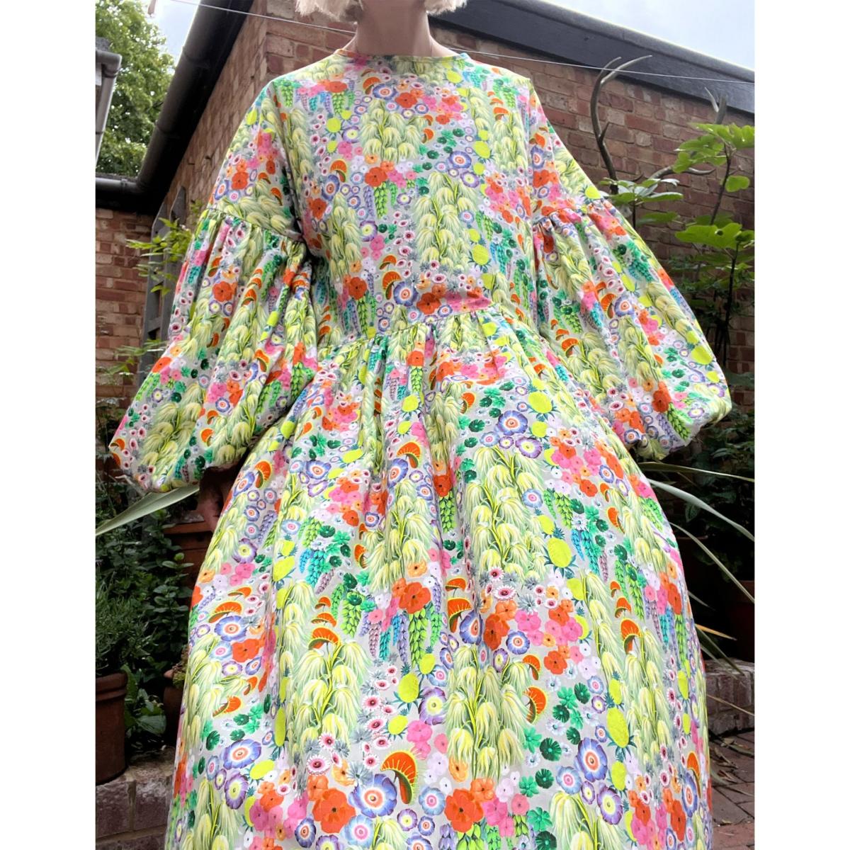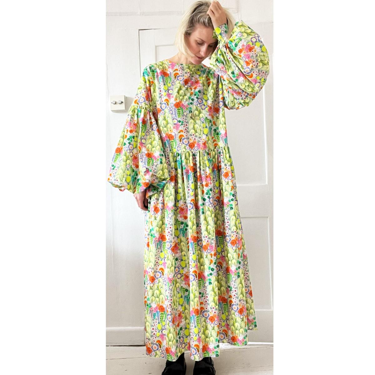 The Dusk dress is our show stopping dress. A romantic, whimsical, loose, over sized, organic cotton dress full of gathers. The dress has large billowing sleeves with button cuffs and a gathered skirt. The Flowers of the Nile are paintings of unusual & rare fauna we imagined thriving along the banks of the river Nile. We like to keep our floral prints trippy and subversive. Model (First picture) is 5 '10 uk size 8 and wears the size Small (Very oversized fit on model). Size small measures 137cm in length from highest shoulder point, waist measures 106cm. There is 5cm grading between sizes on the width. UK Sizing (Oversized style means flexibility in sizing, and very generous sizing)