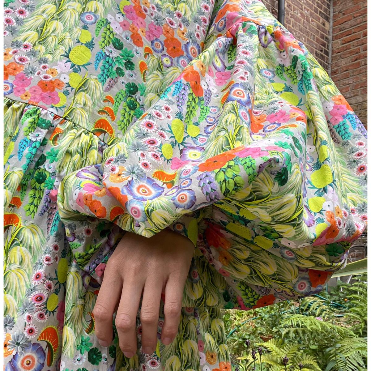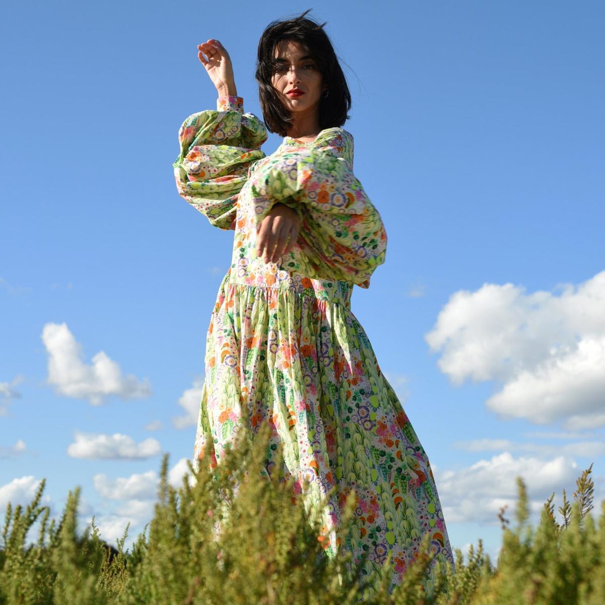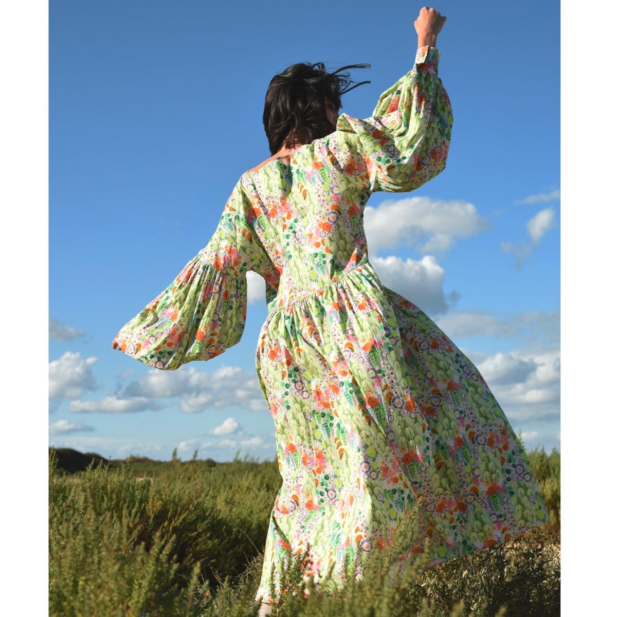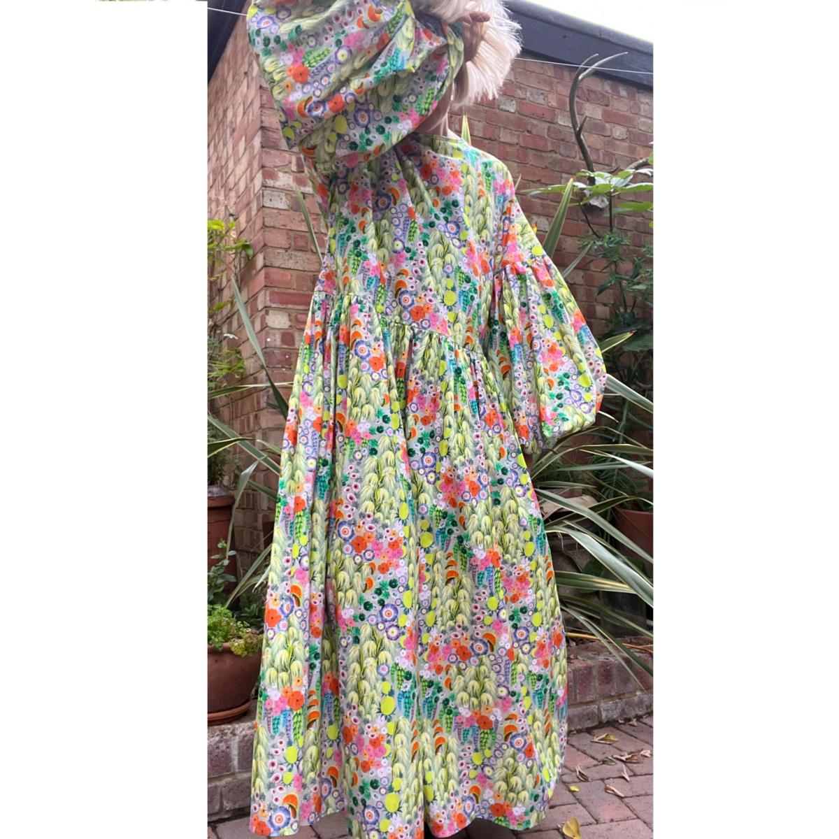 The Dusk dress is our show stopping dress. A romantic, whimsical, loose, over sized, organic cotton dress full of gathers. The dress has large billowing sleeves with button cuffs and a gathered skirt. The Flowers of the Nile are paintings of unusual & rare fauna we imagined thriving along the banks of the river Nile. We like to keep our floral prints trippy and subversive. Model (First picture) is 5 '10 uk size 8 and wears the size Small (Very oversized fit on model). Size small measures 137cm in length from highest shoulder point, waist measures 106cm. There is 5cm grading between sizes on the width. UK Sizing (Oversized style means flexibility in sizing, and very generous sizing)