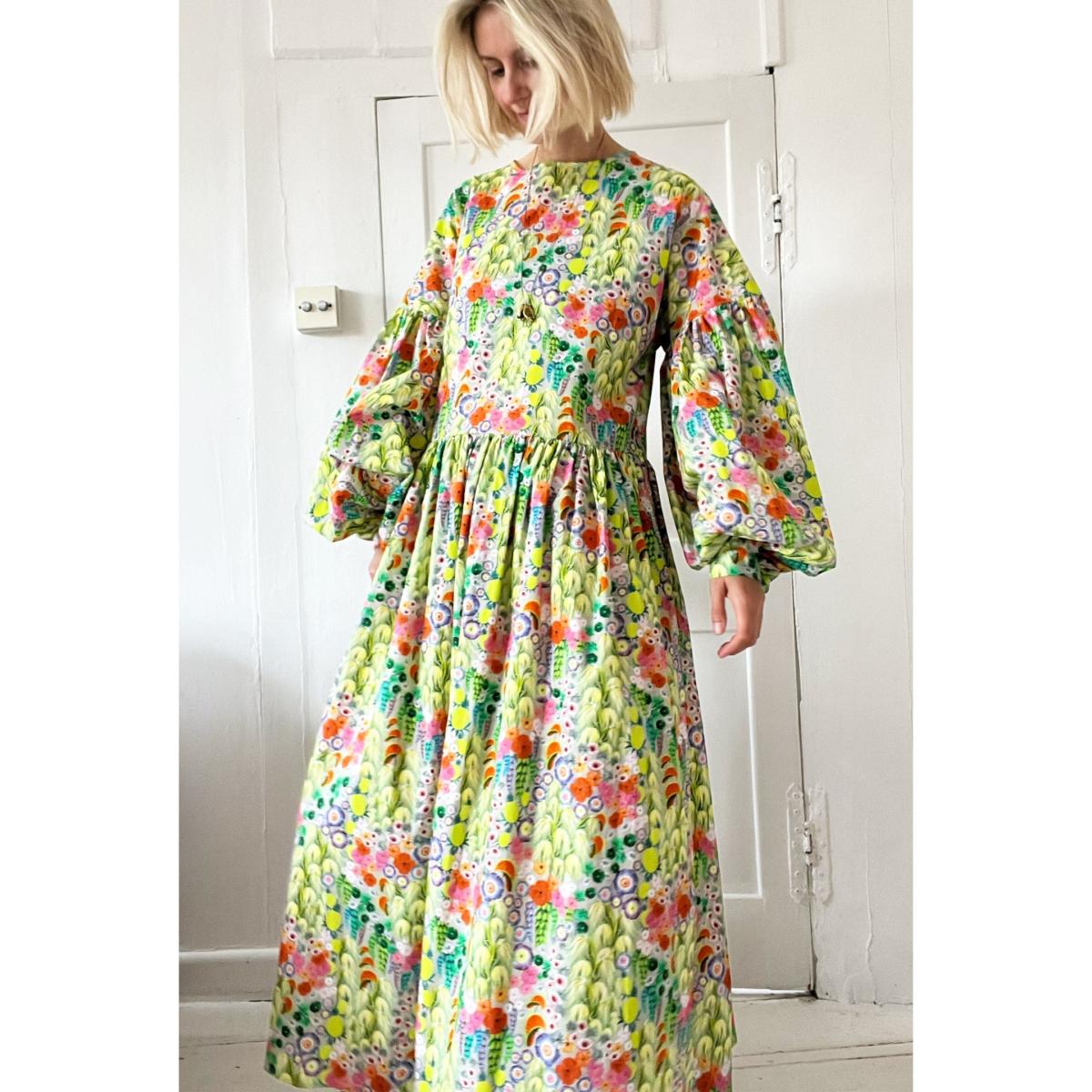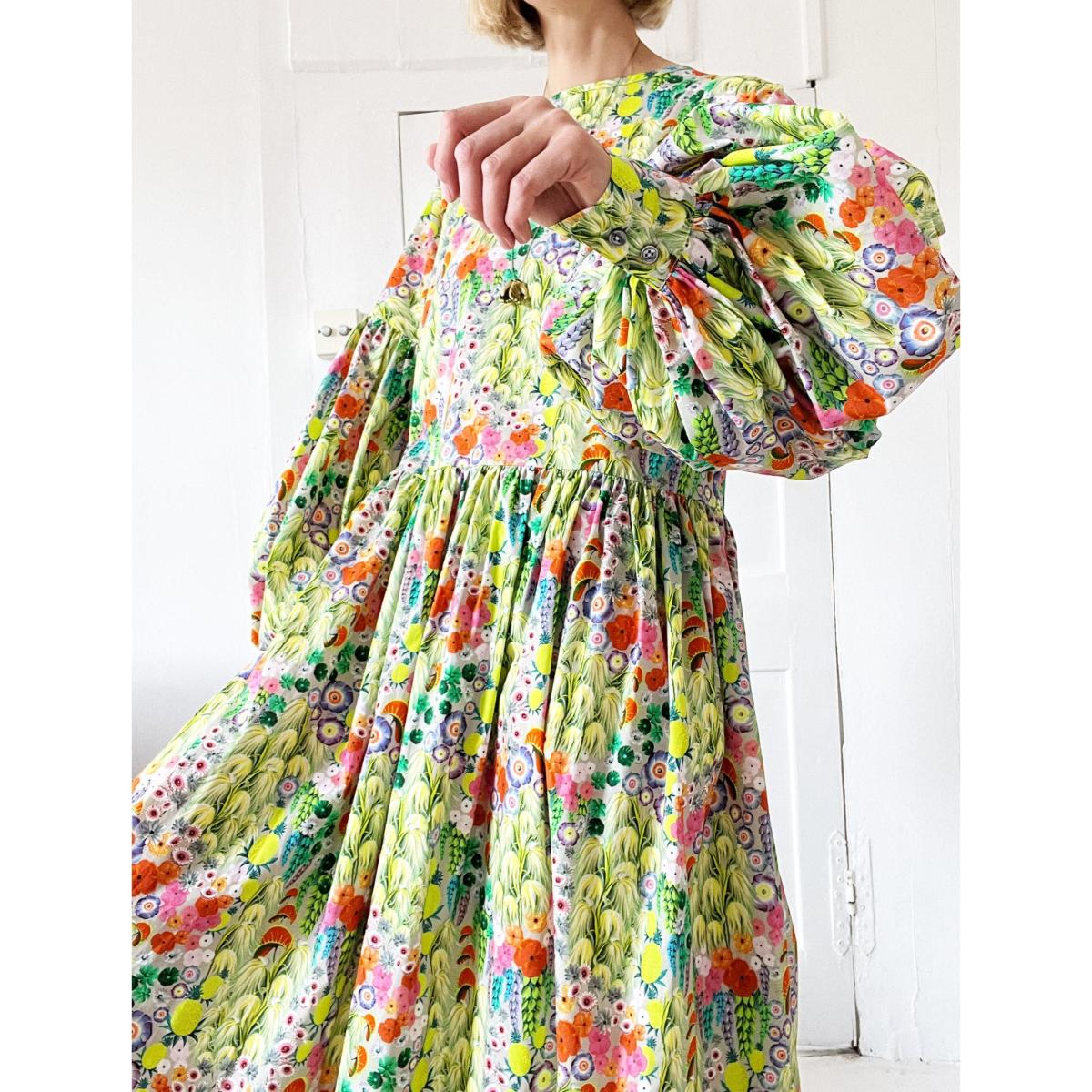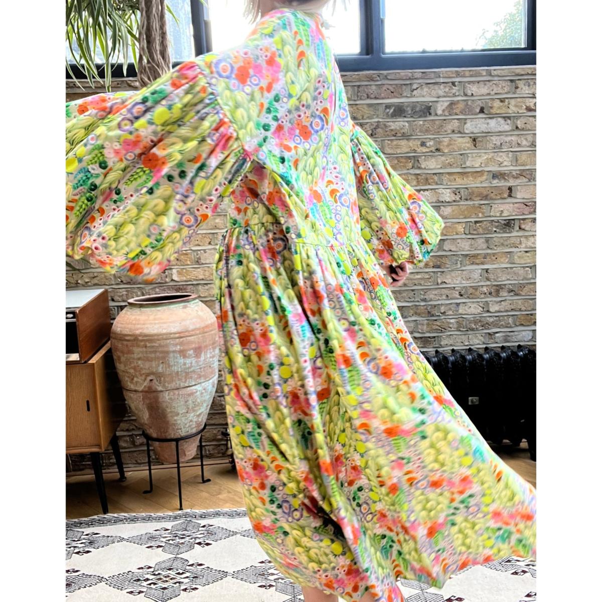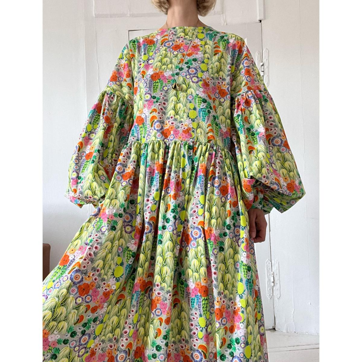 The Dusk dress is our show stopping dress. A romantic, whimsical, loose, over sized, organic cotton dress full of gathers. The dress has large billowing sleeves with button cuffs and a gathered skirt. The Flowers of the Nile are paintings of unusual & rare fauna we imagined thriving along the banks of the river Nile. We like to keep our floral prints trippy and subversive. Model (First picture) is 5 '10 uk size 8 and wears the size Small (Very oversized fit on model). Size small measures 137cm in length from highest shoulder point, waist measures 106cm. There is 5cm grading between sizes on the width. UK Sizing (Oversized style means flexibility in sizing, and very generous sizing)