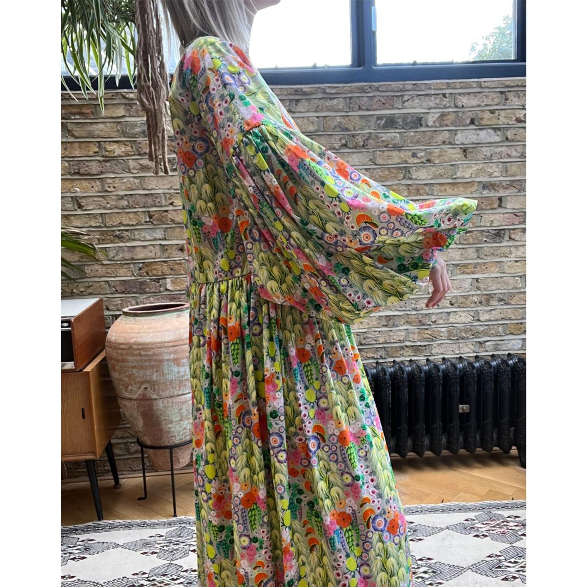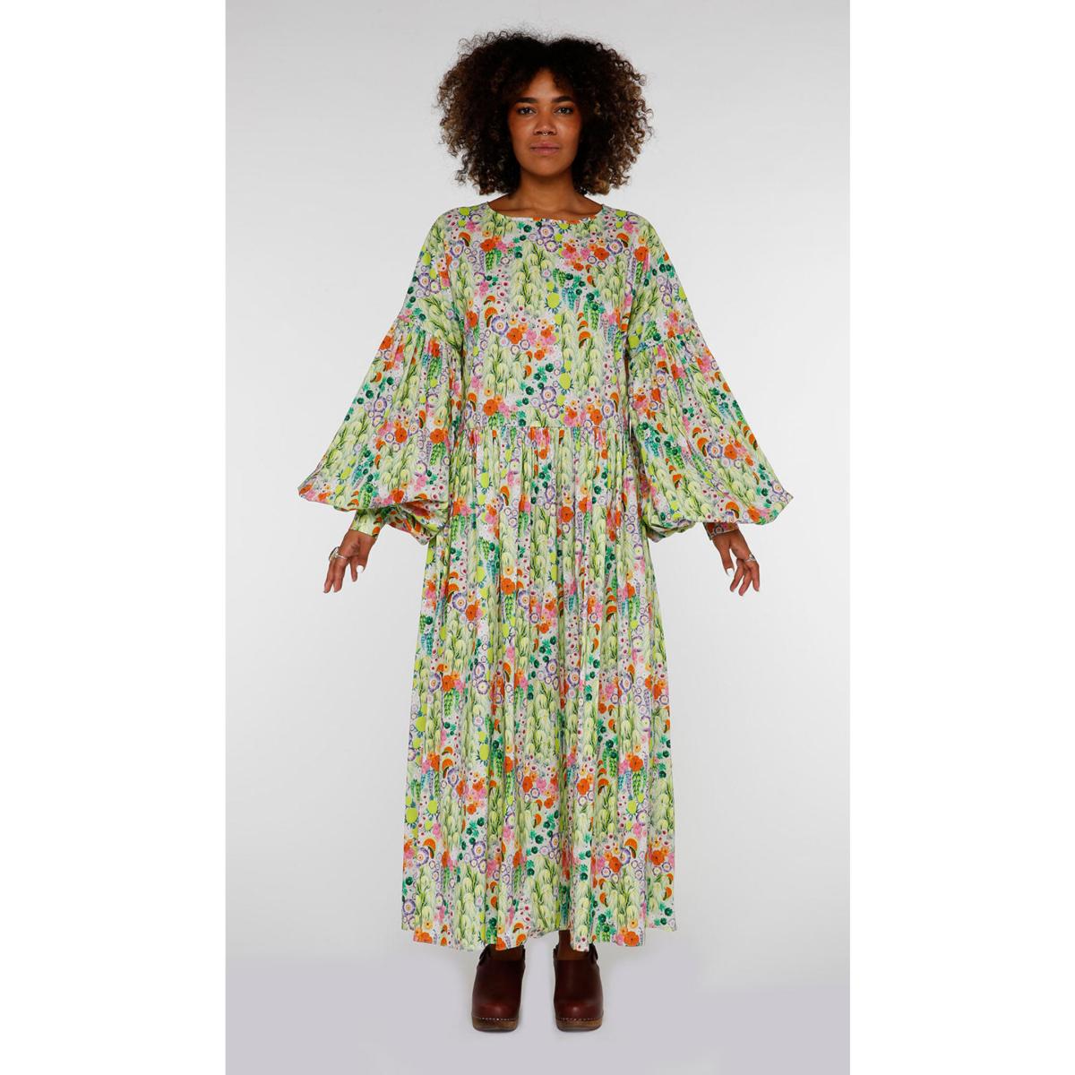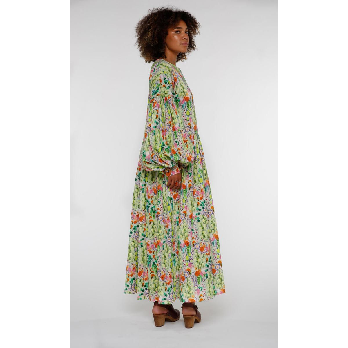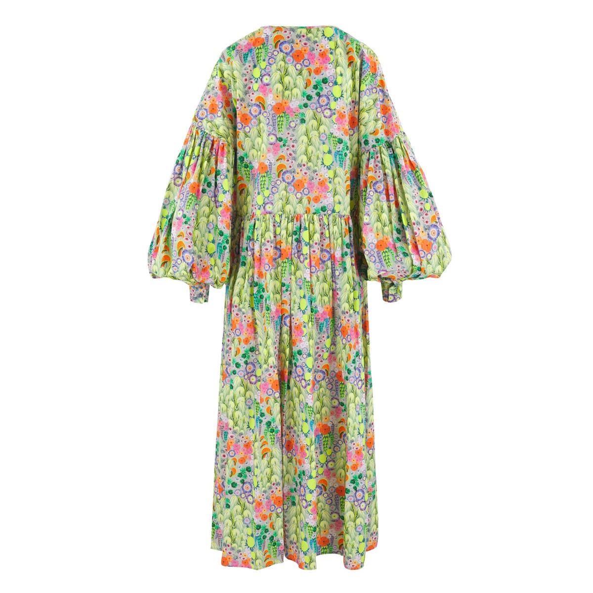 The Dusk dress is our show stopping dress. A romantic, whimsical, loose, over sized, organic cotton dress full of gathers. The dress has large billowing sleeves with button cuffs and a gathered skirt. The Flowers of the Nile are paintings of unusual & rare fauna we imagined thriving along the banks of the river Nile. We like to keep our floral prints trippy and subversive. Model (First picture) is 5 '10 uk size 8 and wears the size Small (Very oversized fit on model). Size small measures 137cm in length from highest shoulder point, waist measures 106cm. There is 5cm grading between sizes on the width. UK Sizing (Oversized style means flexibility in sizing, and very generous sizing)