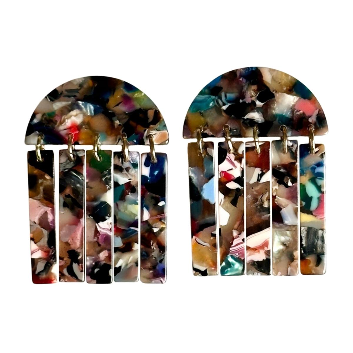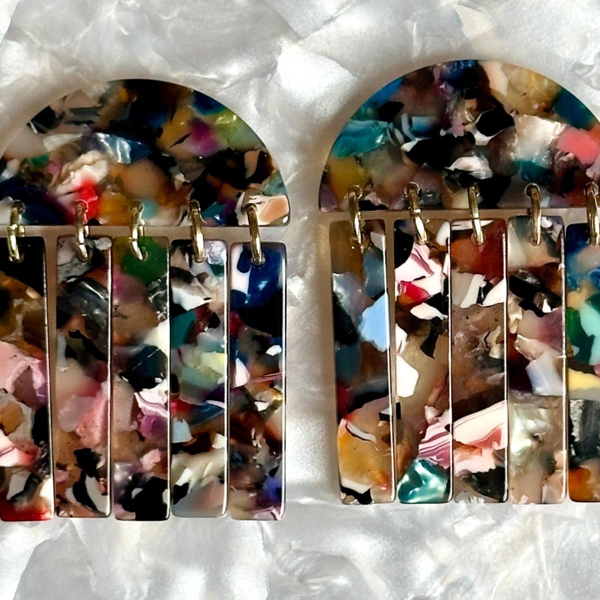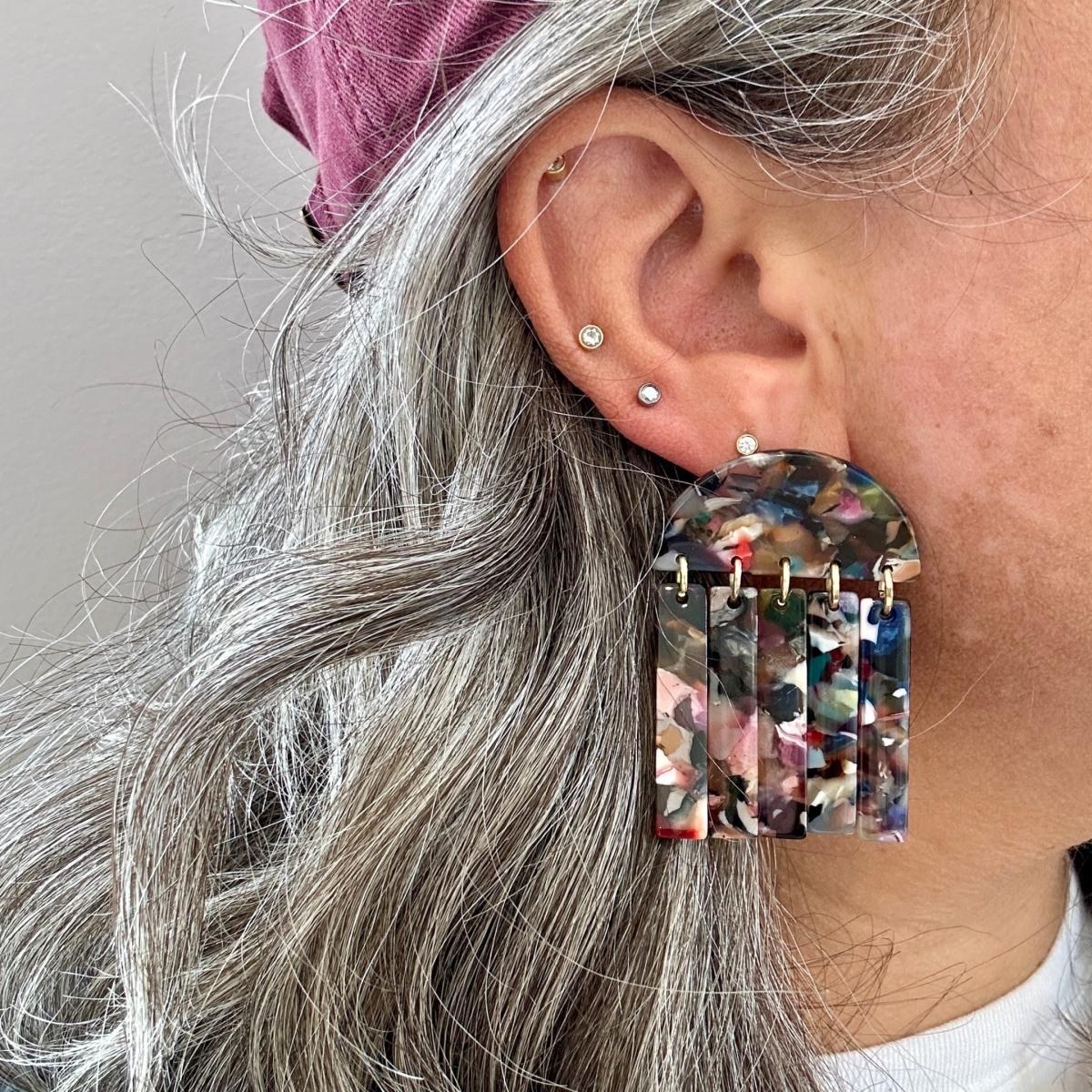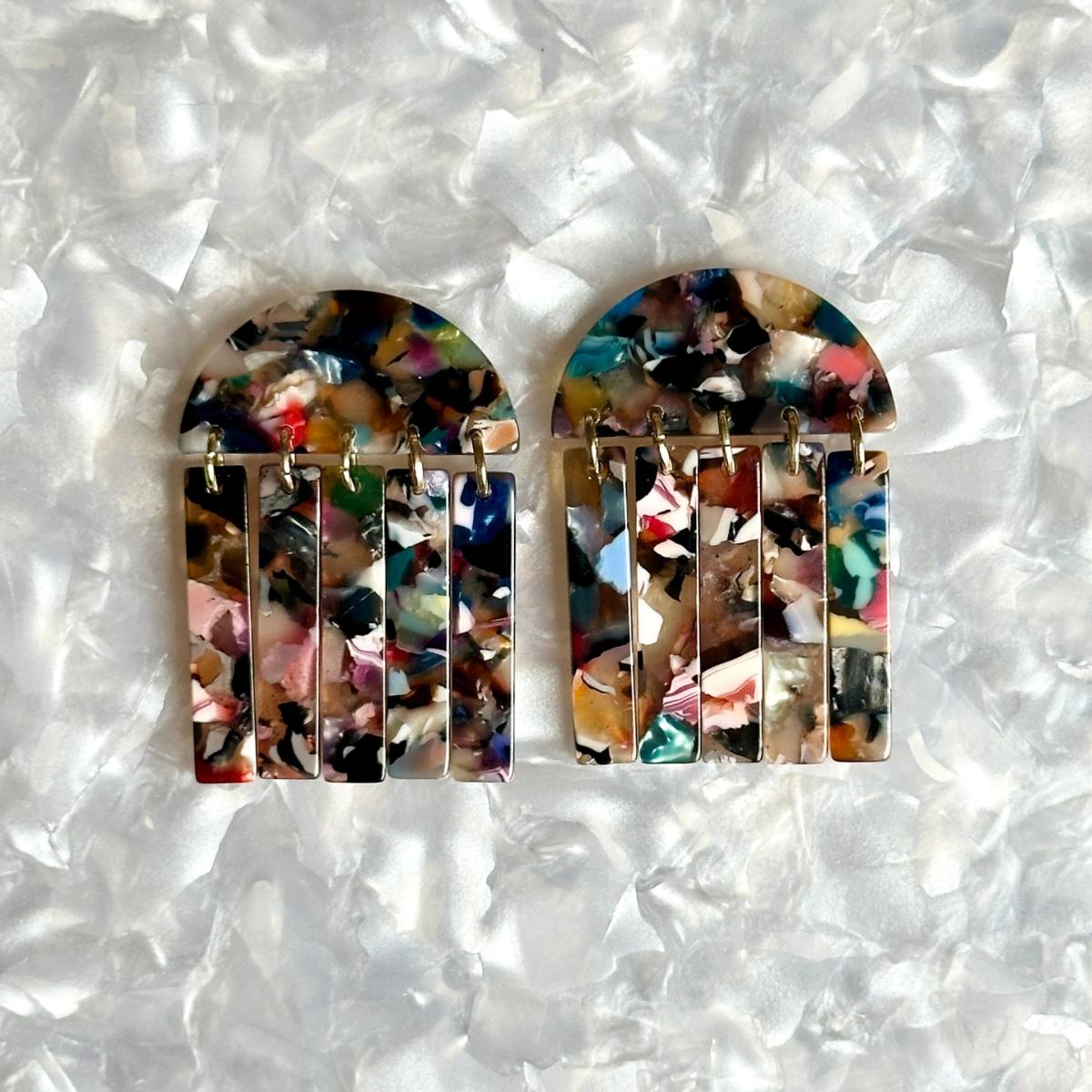 These earrings are all about movement! Features a unique half moon stud in a multicolor hand-swirled acrylic with a matching flirty fringe detail. Designed for Closet Rehab. Handmade in Pittsburgh, PA. Made in the USA.