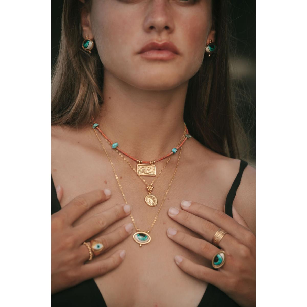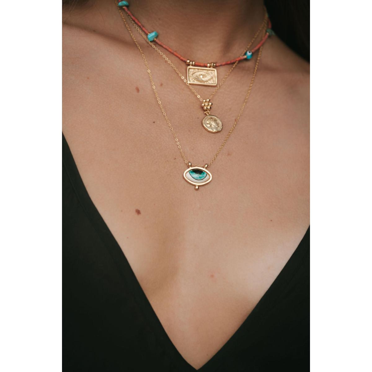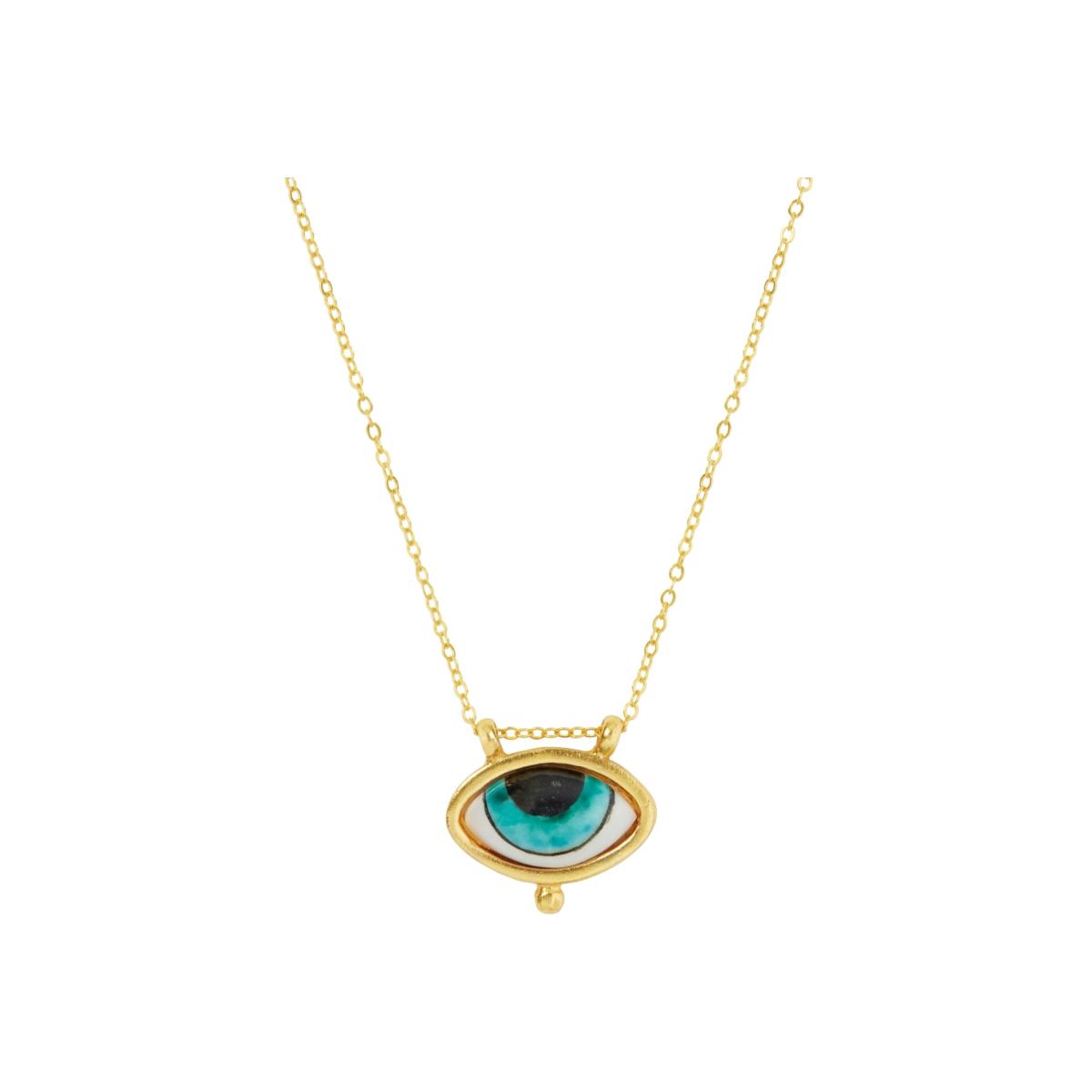 This 21ct gold-plated necklace features a turquoise evil eye pendant hand-painted on smooth porcelain. The length of this gold necklace can be adjusted to the perfect length to layer and style with your favourite necklaces.