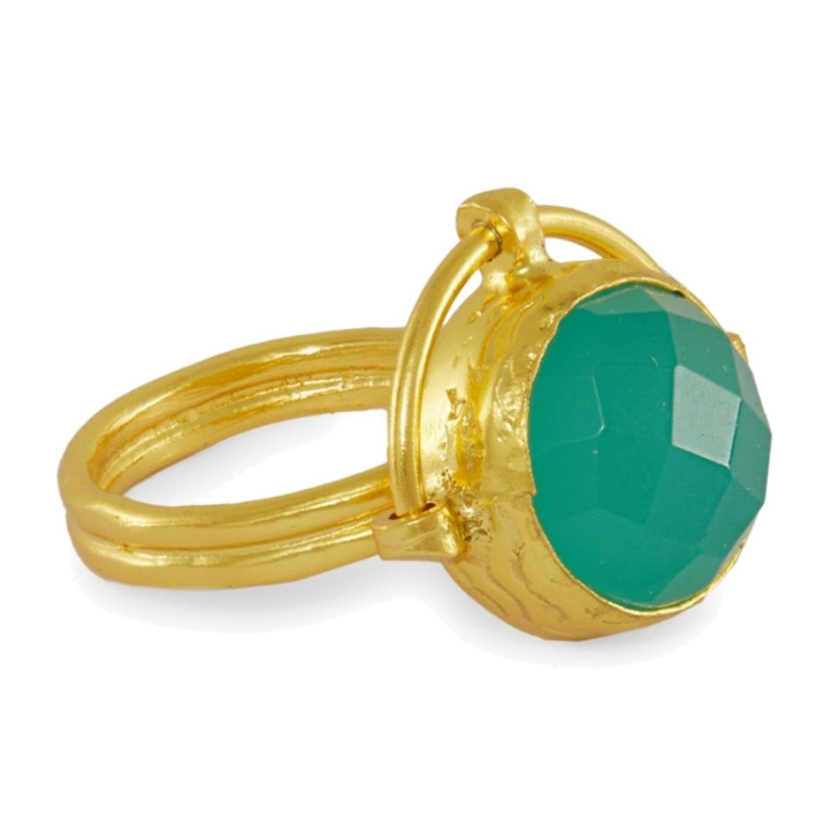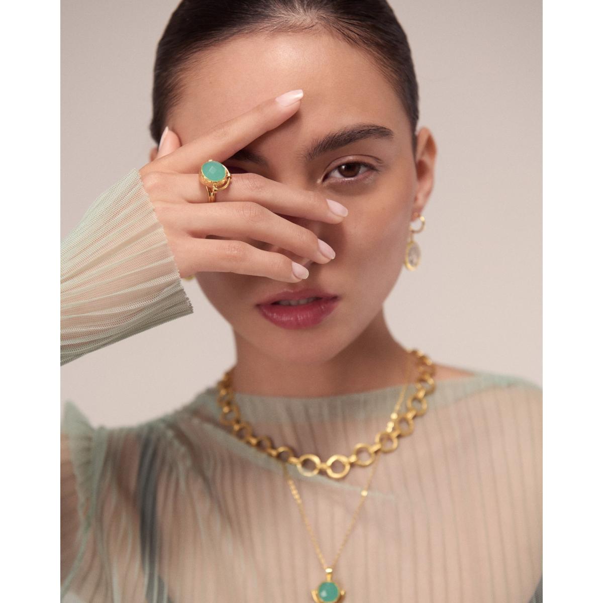 Discover the captivating charm of the Domna Aqua Chalcedony Cocktail Ring. The serene hues of aqua chalcedony are elegantly framed in a gold halo ring, creating a piece that radiates style and sophistication. The Domna gemstone ring is handcrafted from 21ct gold-plated brass at our Istanbul workshop and is adjustable for the perfect fit.