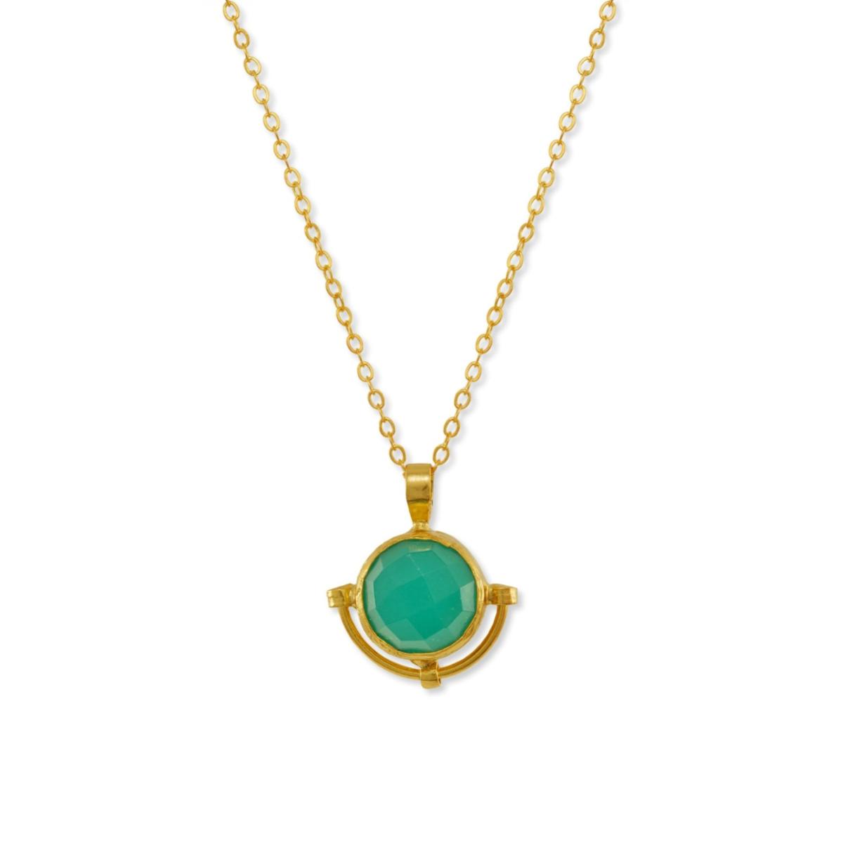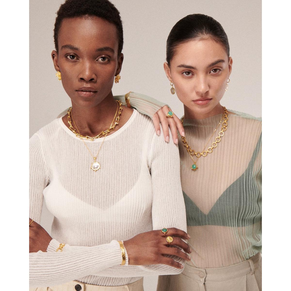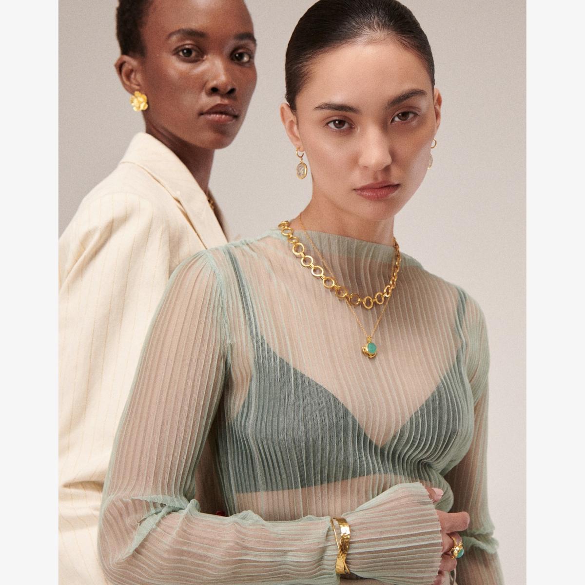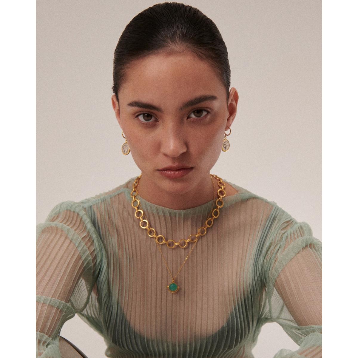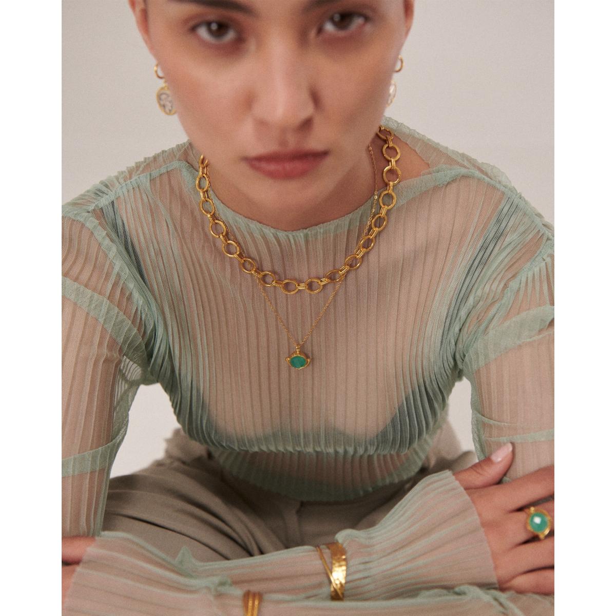 The Domna Aqua Chalcedony Pendant Necklace is a vibrant and sophisticated layering piece, the perfect modern addition to your look. The tranquil shades of the aqua chalcedony are beautifully encased in a gold ring, exuding serenity and elegance. Handcrafted with care from 21ct gold-plated recycled brass in our Istanbul workshop, this gemstone necklace adds vibrant colour to any necklace stack.