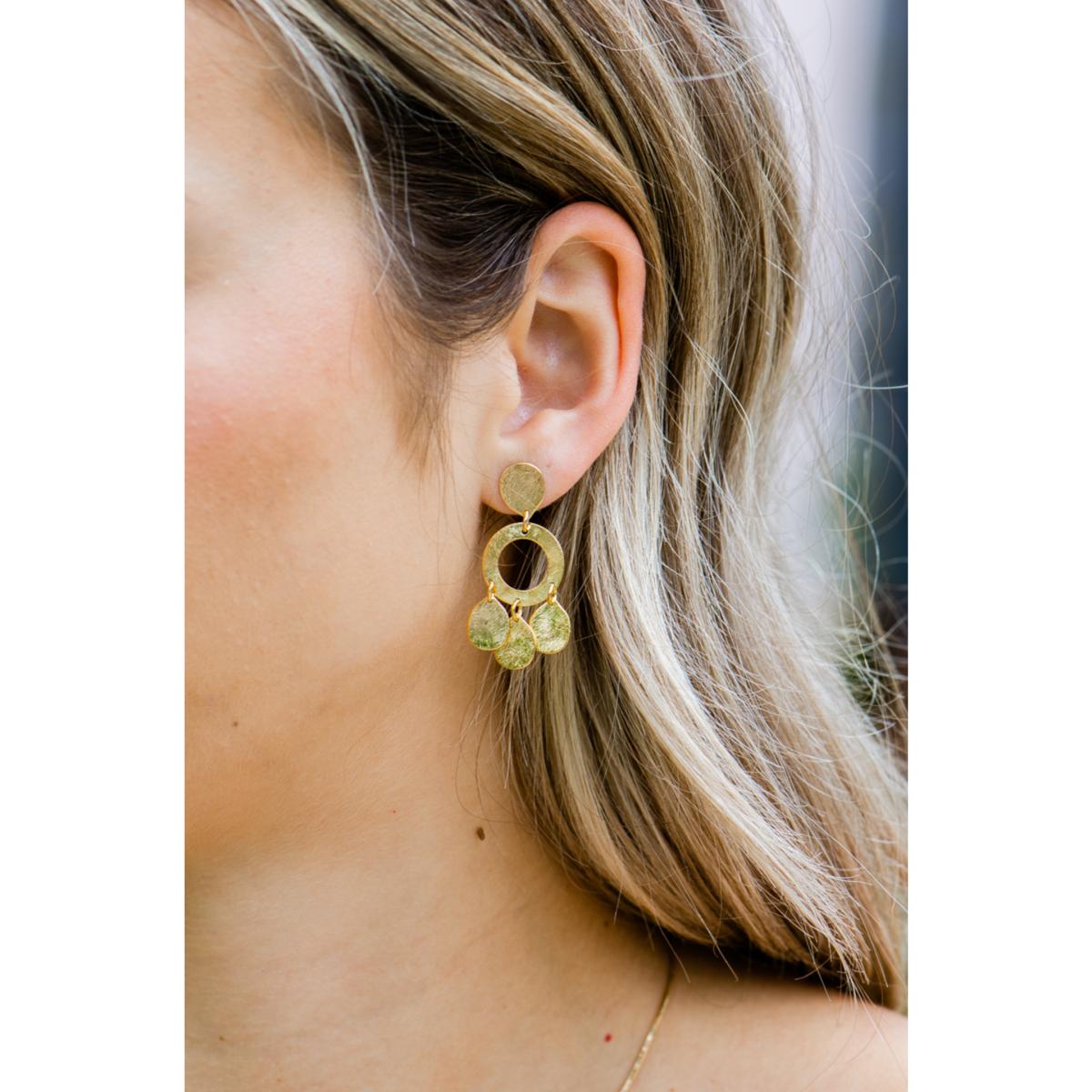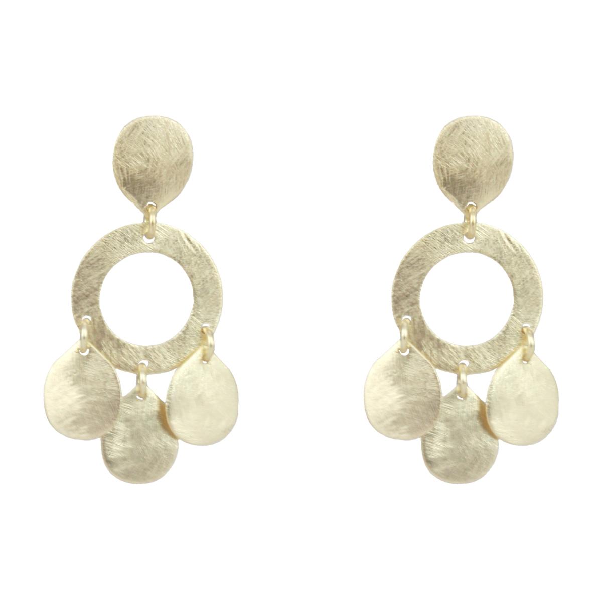 8k gold-plated post earrings with a brushed texture sound elegant and stylish. The combination of the textured circle with the dangling drops adds a dynamic element to the design, making them both modern and eye-catching. Being made in Brazil suggests high-quality craftsmanship and attention to detail.