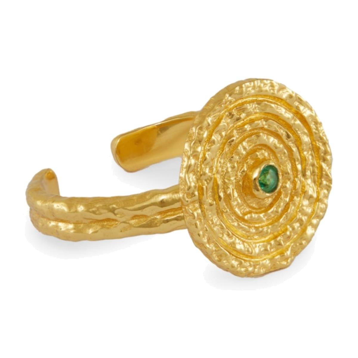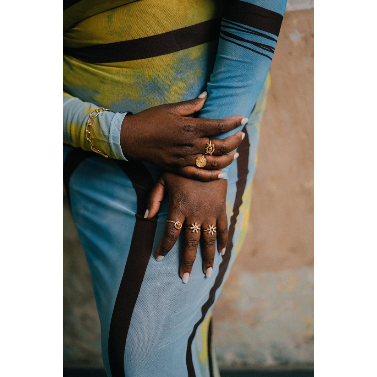 Stephanie Yeboah x Ottoman Hands, a collaboration collection of jewellery inspired by Ghanaian symbolism. The Adinkrahene symbol, translating to 'King of the Adinkra symbols' represents authority, leadership and charisma. This powerful Adinkra symbol is cast in a beautiful statement cocktail ring crafted from shimmering 18ct gold-plated recycled brass and set with a vibrant green onyx semi-precious gemstone at its core, with delicate engraved rings cascading out. The Adinkrahene ring is fully adjustable to get your perfect fit. Wear alone for a bold, yet minimal aesthetic, or stack with your favourite rings for an added element of drama, steeped in powerful symbolism.