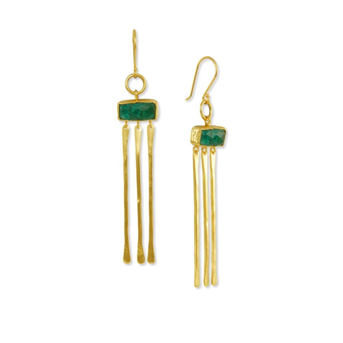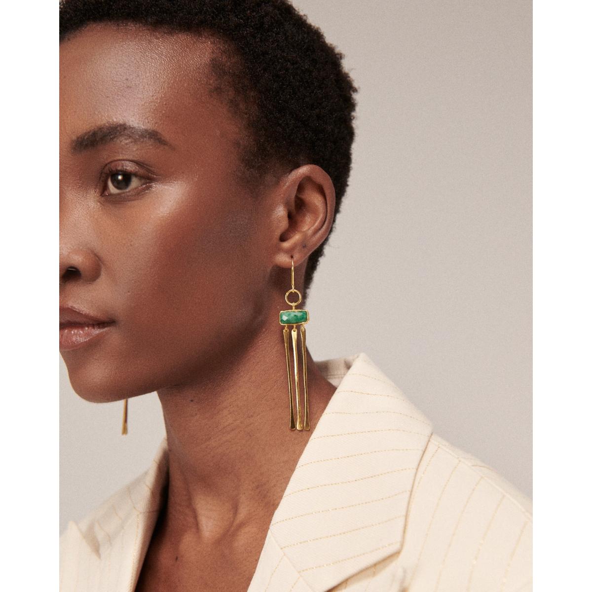 Drama like you've never seen it, the Yasmin Emerald Drop Earrings from Ottoman Hands are bound to turn heads. Opulent emerald semi-precious gemstones are paired with elongated gold drops for added movement and shine. These faceted gemstone drop earrings are expertly handcrafted from 21ct gold-plated recycled brass with gold-plated sterling silver ear posts at our Istanbul workshop.