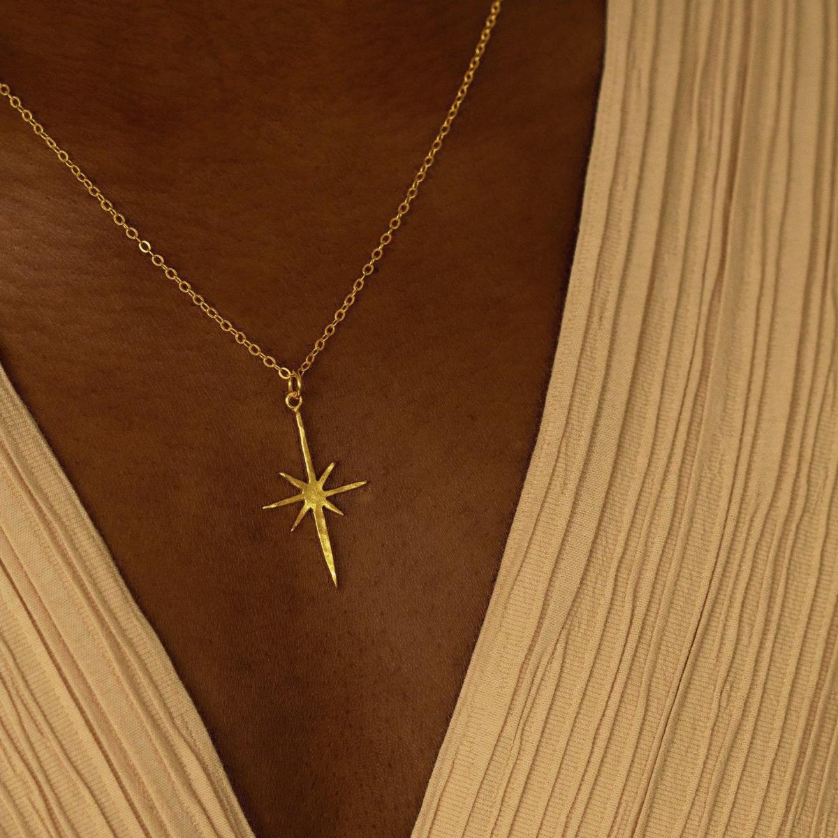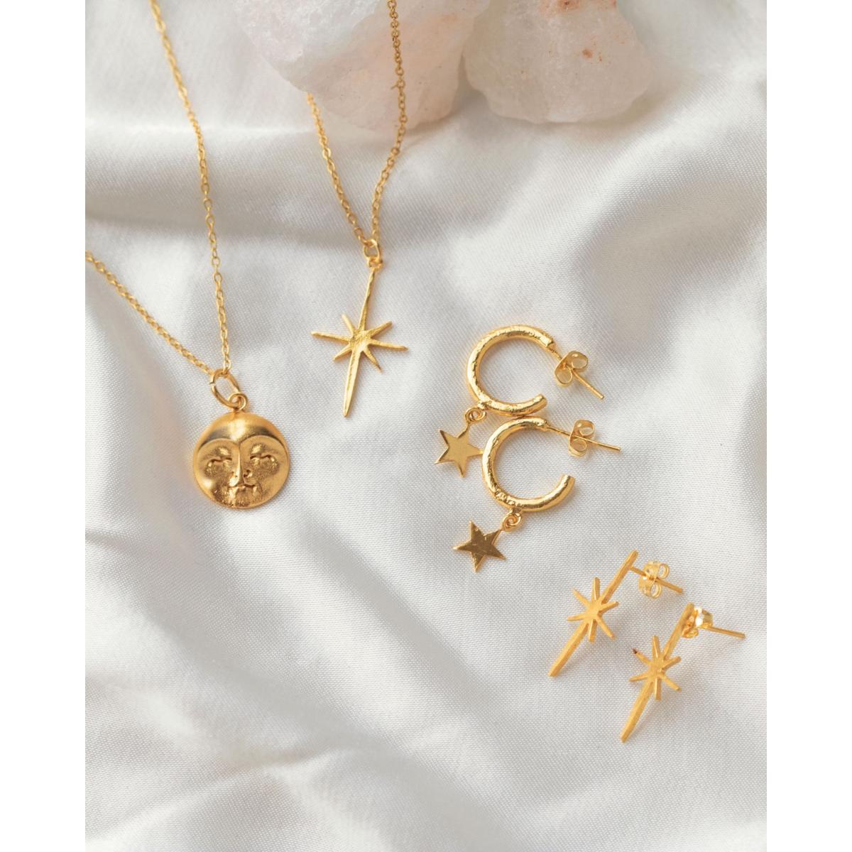 The Gold Northern Star Necklace will enchant you this season with its beautiful shaped pendant. Handmade in 21ct gold plated recycled brass, this gold pendant is best styled with our Northern Star Stud Earrings. Gift your loved one with these beauties as a stunning jewellery set. 21ct gold plated on recycled brass length of the star pendant - 2.7 cm necklace can be adjusted to the following lengths - 18, 21.5 , 25 cm