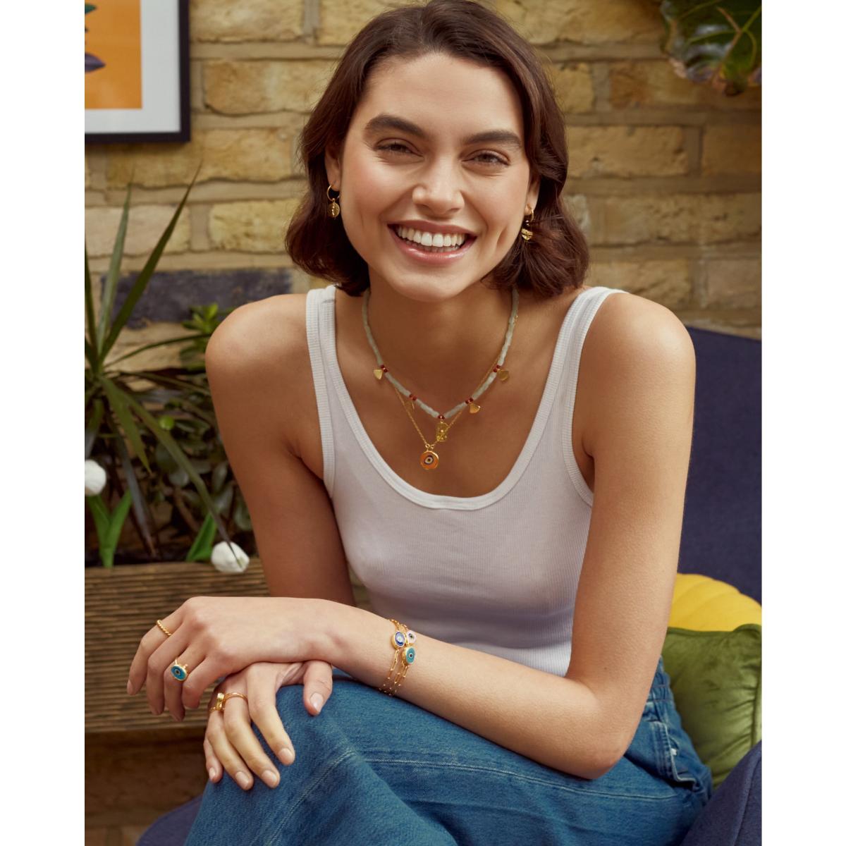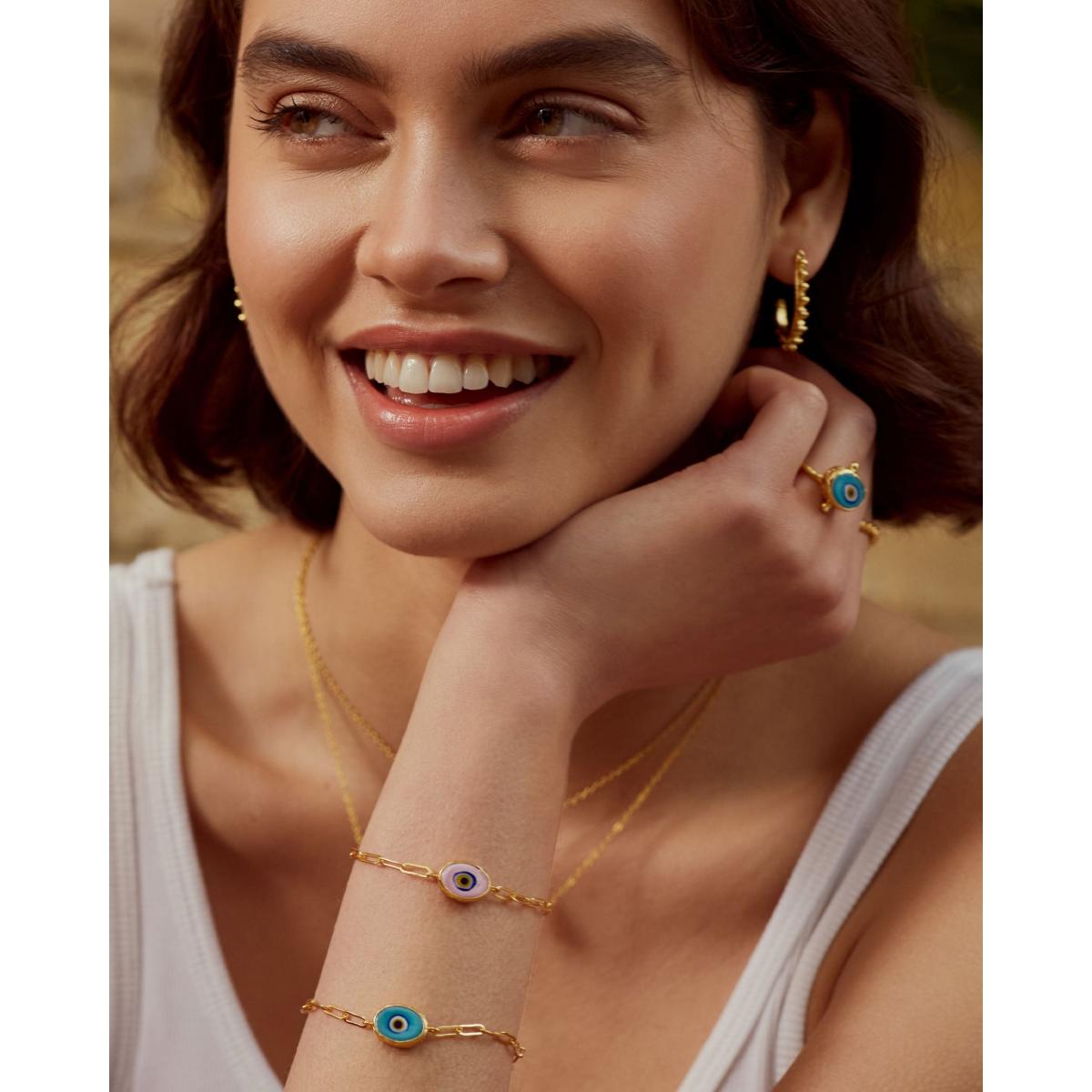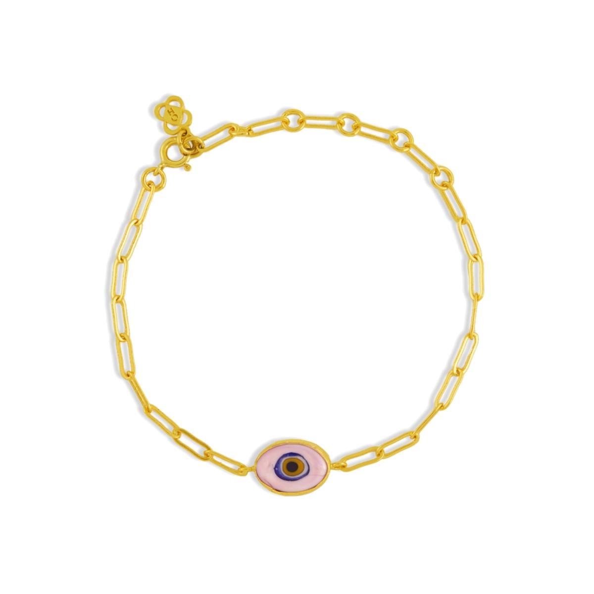 Protect your style with our handmade evil eye bracelet. This stylish pink chain bracelet, created with 21ct gold plated recycled brass, adds the perfect touch of playful protection to any outfit. Inspired by the colours of the Californian sky, this evil eye bracelet is perfect for layering. Pair it with the pieces of our Evil Eye jewellery collection for the ultimate good vibes stack. Created with hand-painted glass, each piece is unique and imperfect.