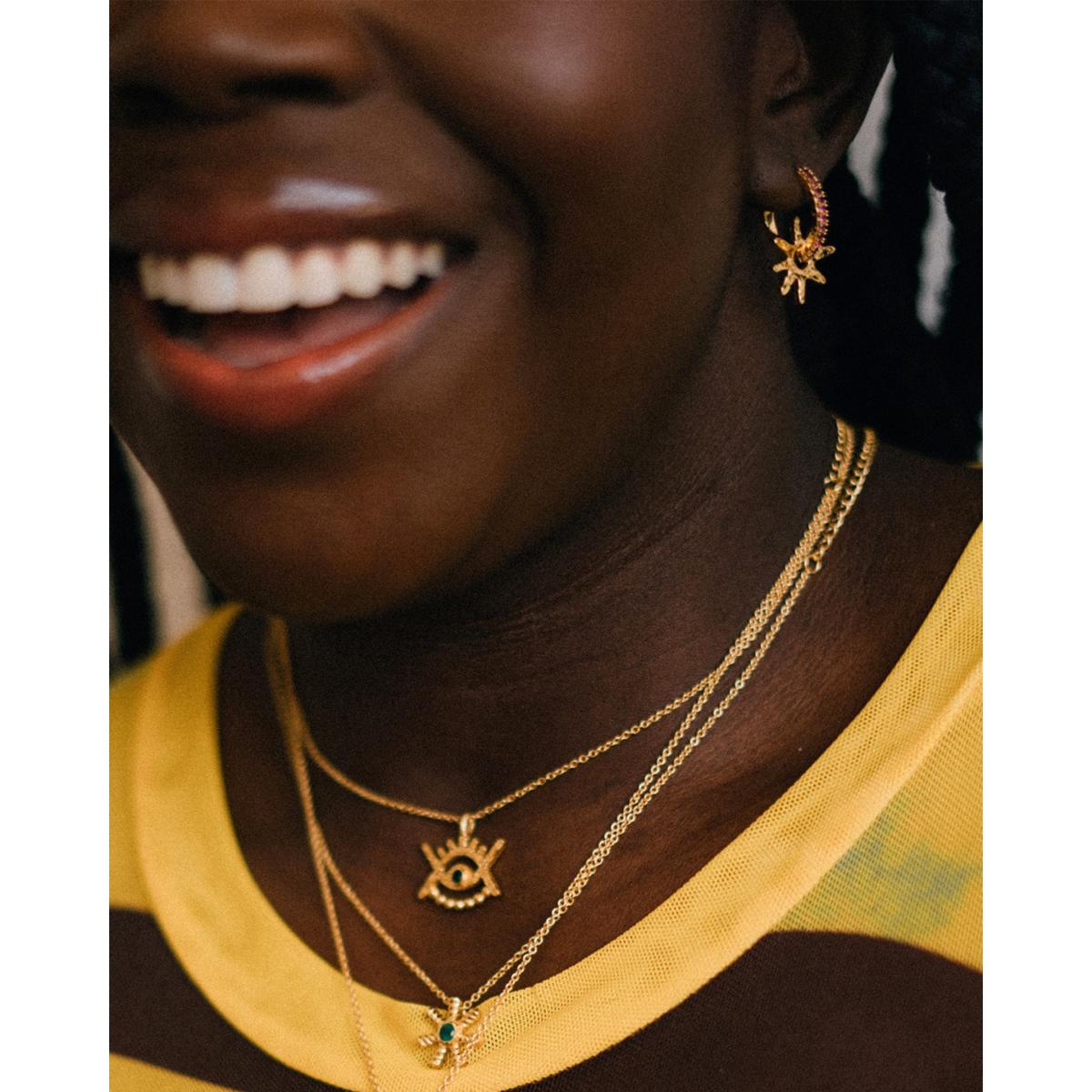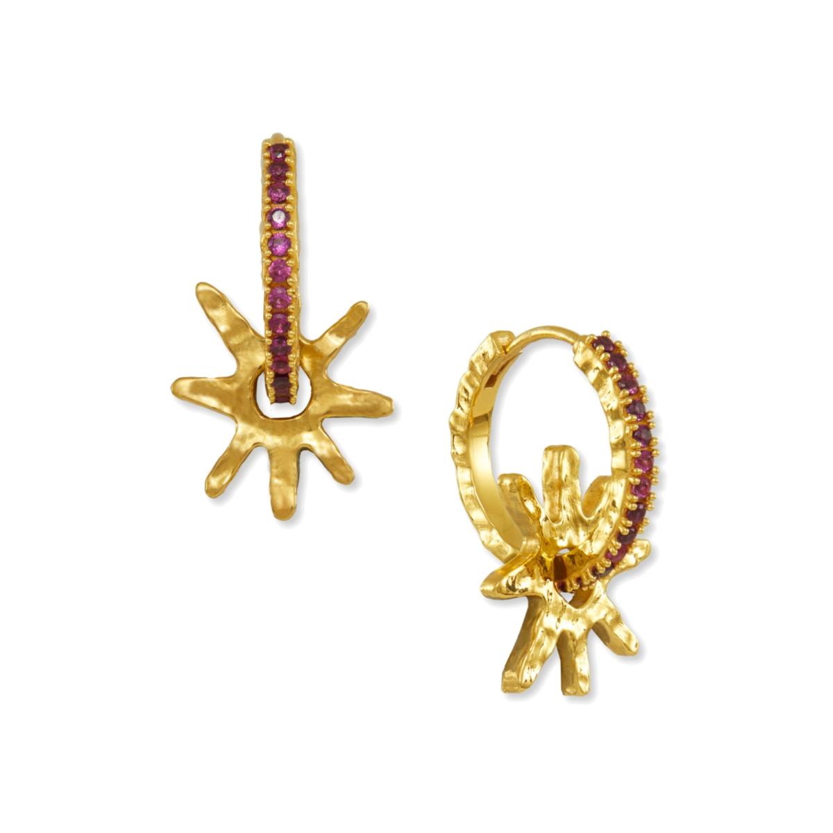 Stephanie Yeboah x Ottoman Hands, a collaboration collection of jewellery inspired by Ghanaian symbolism. Nsoromma is the Akan word for ‘star’, also meaning ‘Child of the Heavens’; a symbol of faith. The Nsoromma Star Earrings feature this important Adinkra symbol as golden star charms, hanging from golden hoops studded with rich red crystals. The Nsoromma Star Hoop Earrings are set in 18ct gold-plated recycled brass.