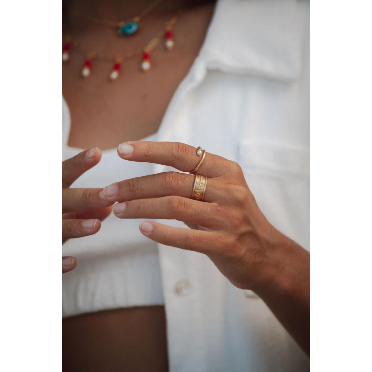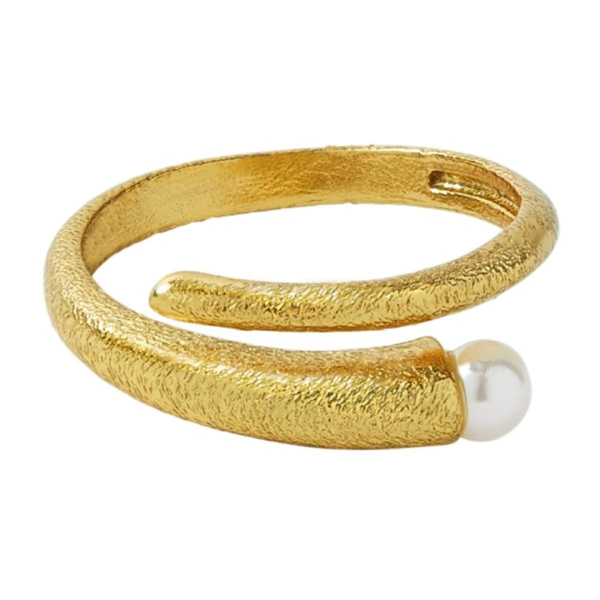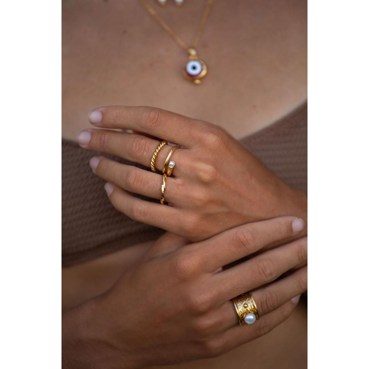 Handcrafted with an elegant swirl detail, this adjustable gold-plated ring is created with a unique brushed feel and features a single freshwater pearl for instant gem factor. Its versatile design will compliment any look. Perfect for stacking, style it with our gemstone rings or match it with the Avalon Pearl Pull Through Earrings. 21ct gold-plated recycled brass freshwater pearl the band is adjustable for a perfect fit