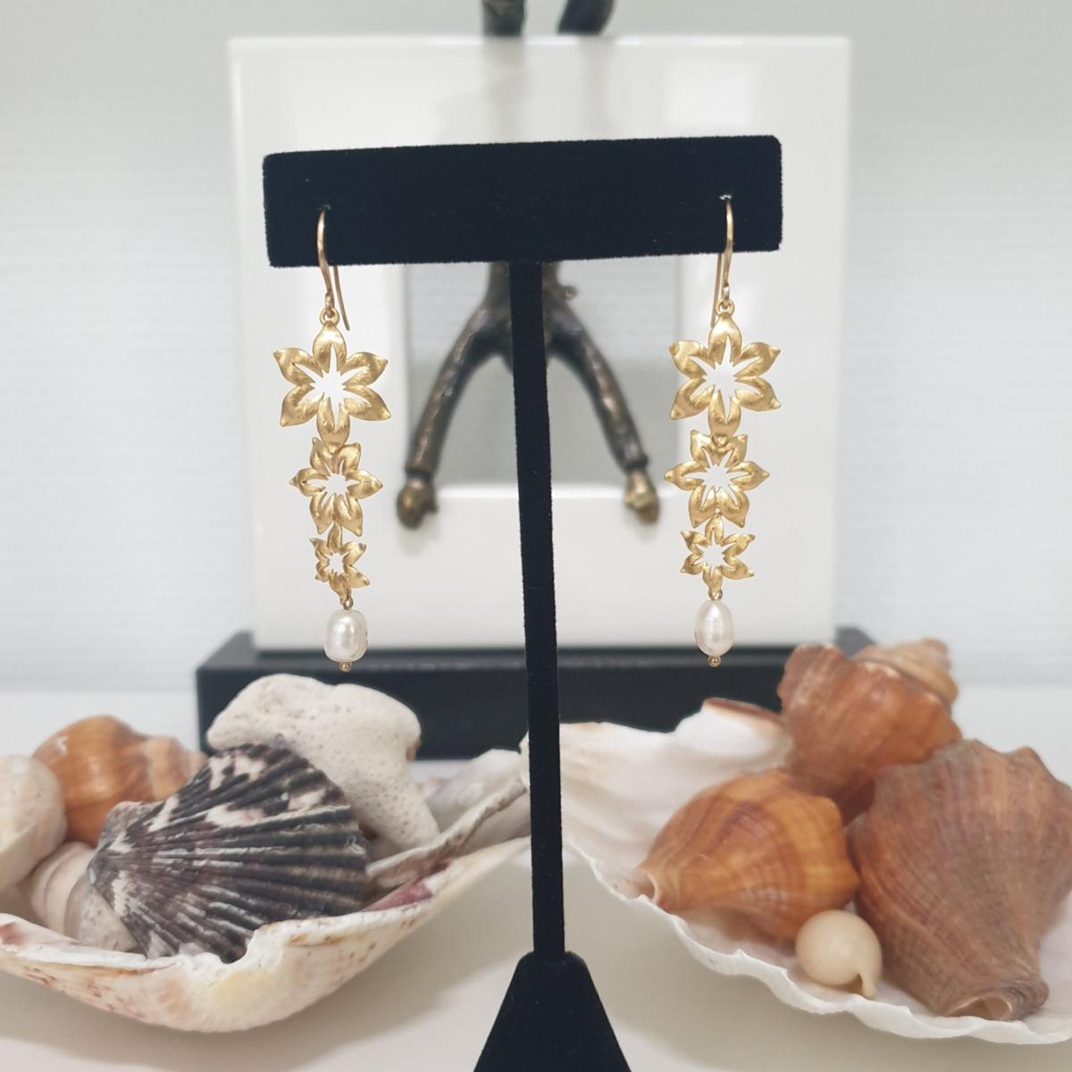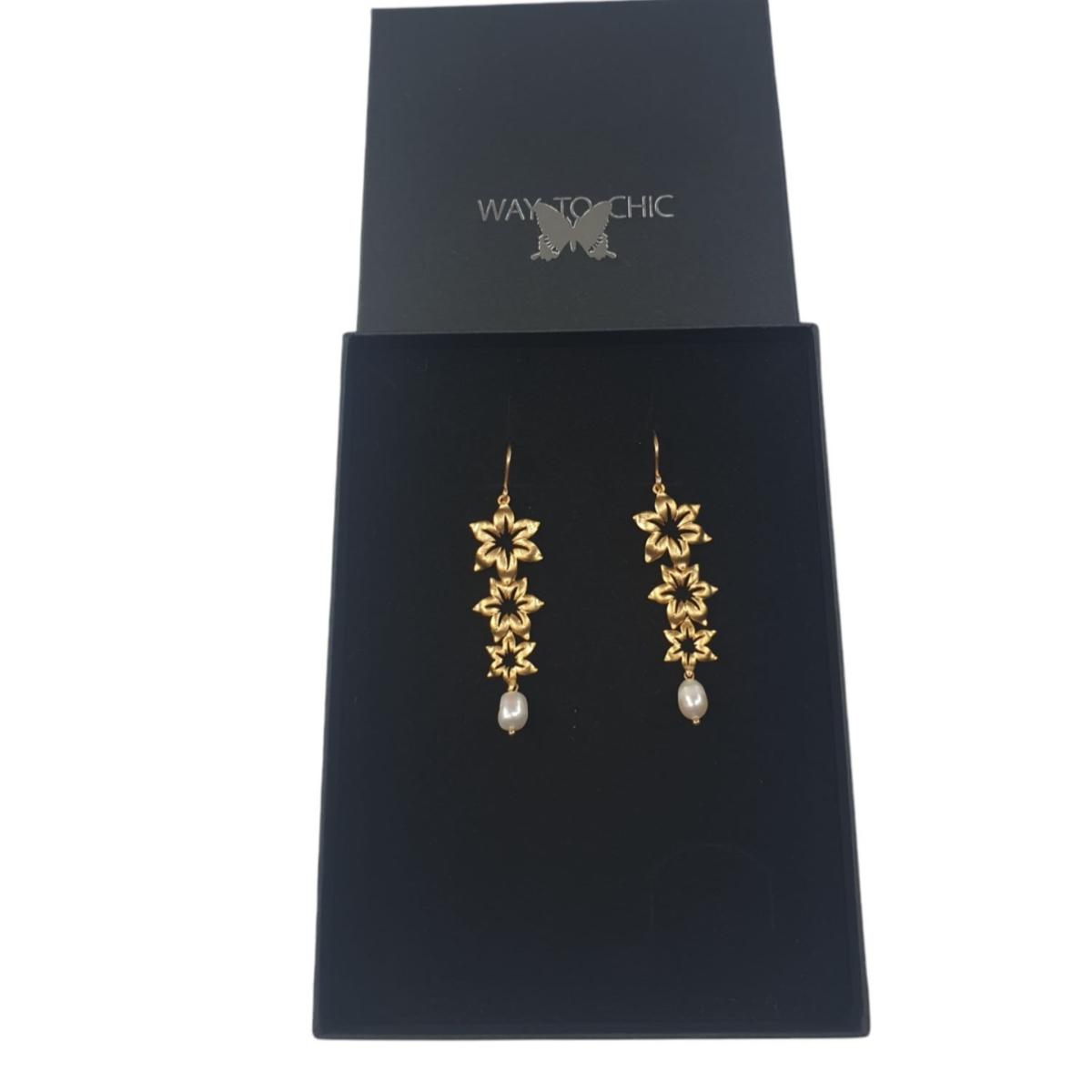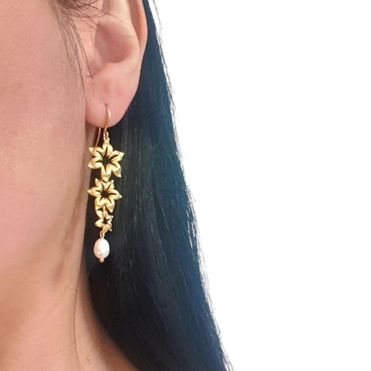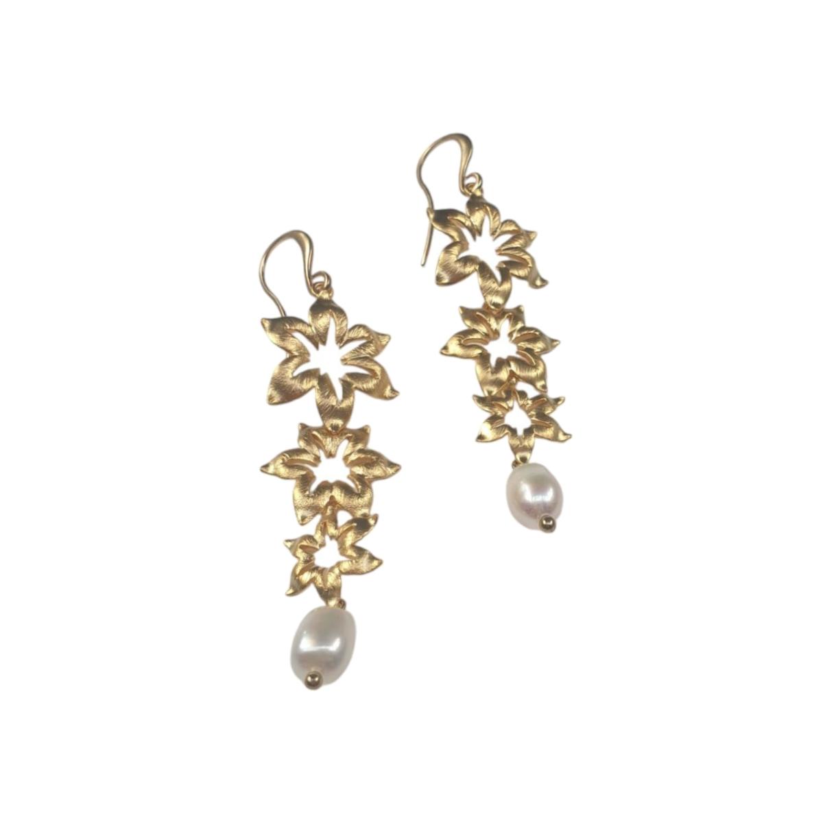 These exquisite bridal earrings feature a delicate cascade of three intricately crafted flowers arranged in a graceful descent, creating a gentle flow that complements the bride's elegance. Suspended from the final flower is a lustrous freshwater pearl, shimmering with a soft, iridescent glow that reflects the purity and grace of the occasion. The earrings are designed with a secure hook, ensuring a stable and comfortable fit while allowing the stunning design to sway gently with each movement.