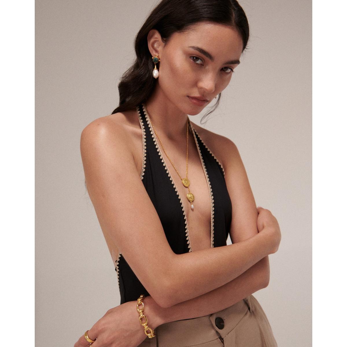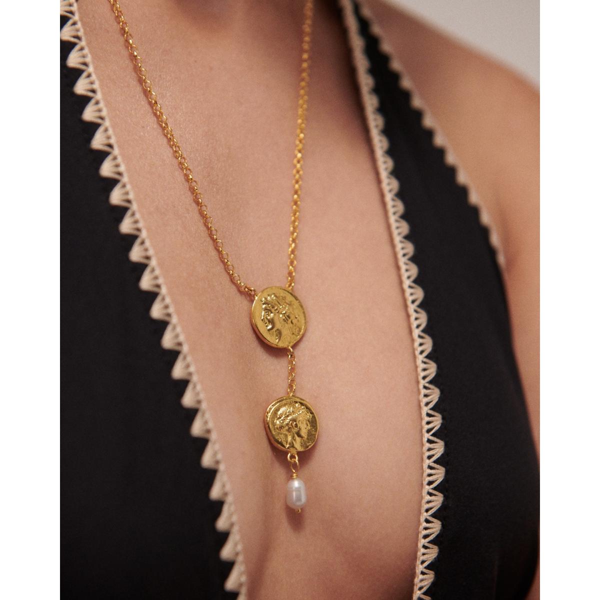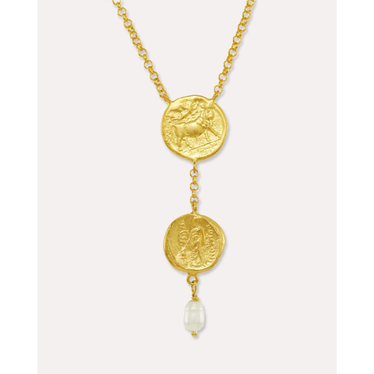 The Odella Coin and Pearl pendant necklace blends luxury with historical elegance in this simple, yet striking style. Featuring two antique coins embossed at the front with the Roman heads and a bull motif at the back, as well as a freshwater pearl drop, this necklace is adjustable and can be worn solo or layered. The Odella necklace is hand cast from antique coins and handcrafted from sustainable 21ct gold-plated recycled brass at our Istanbul workshop.