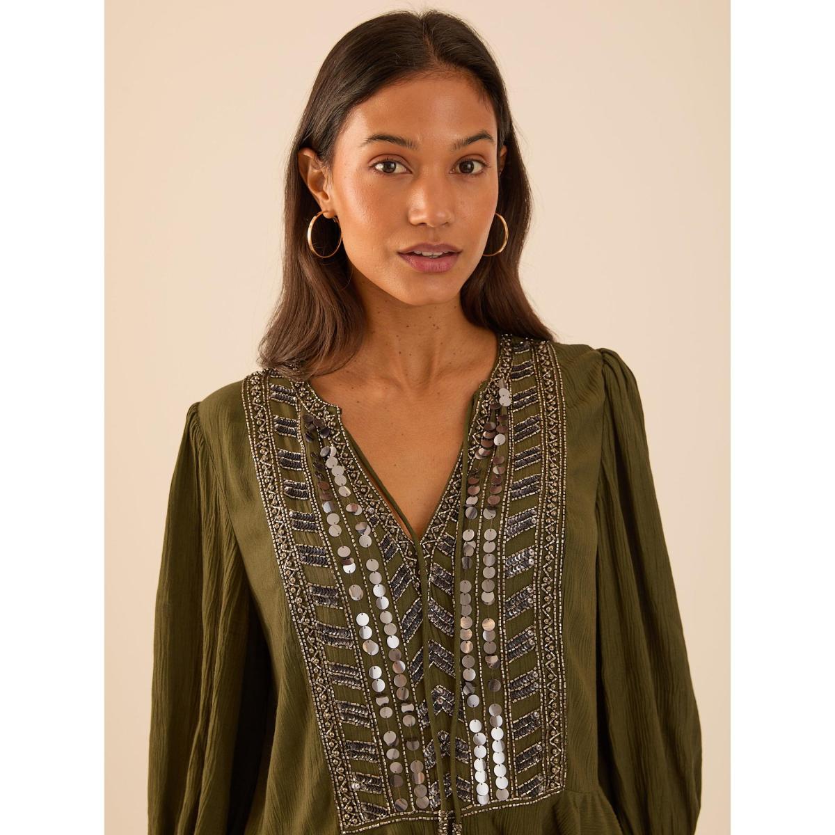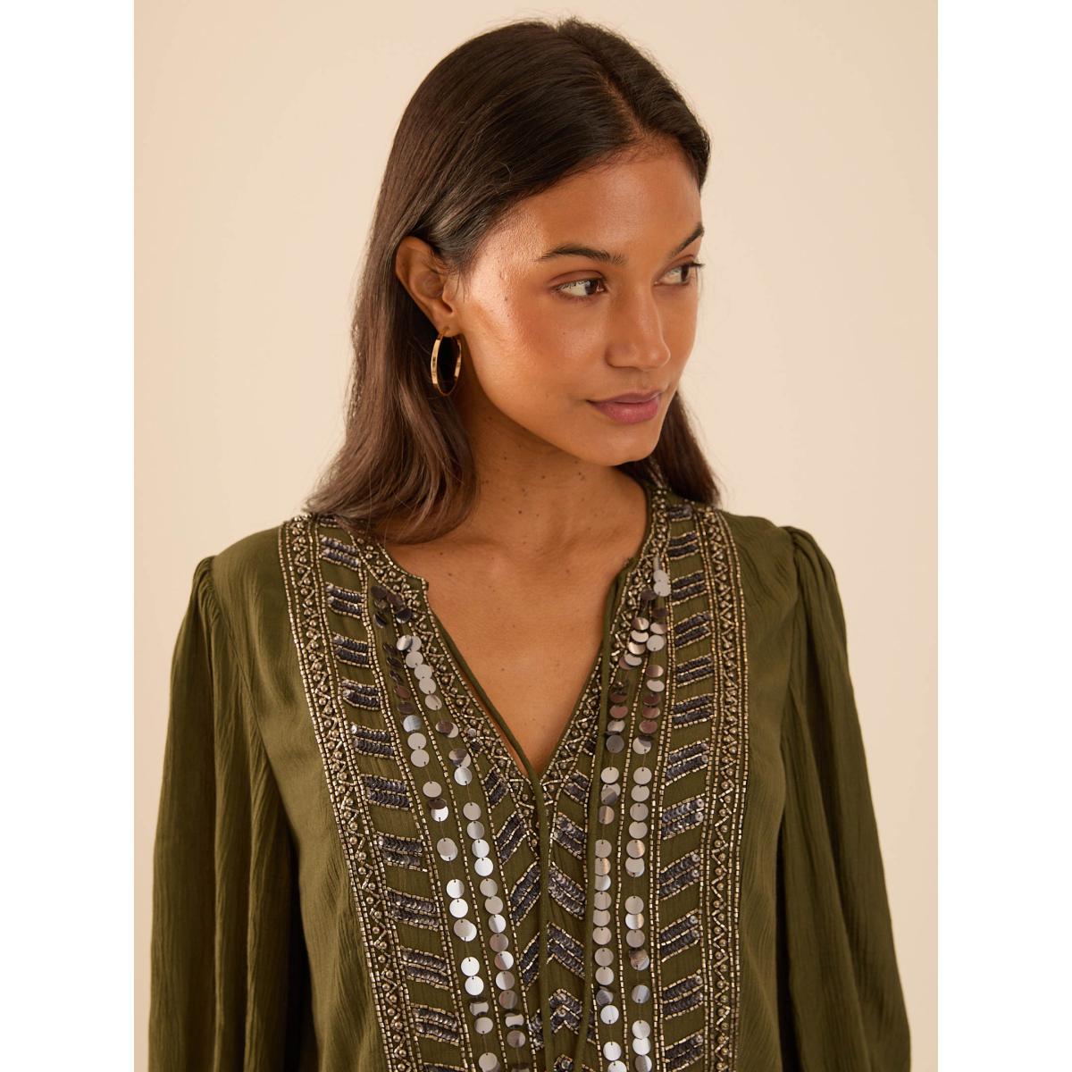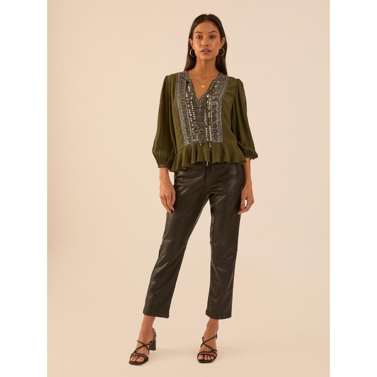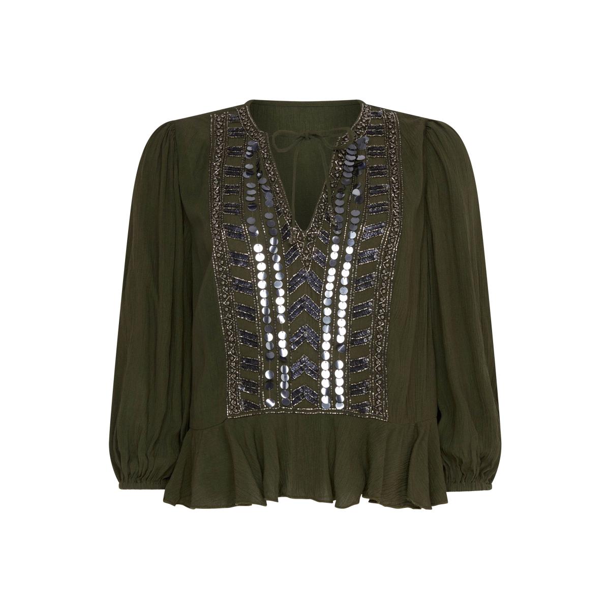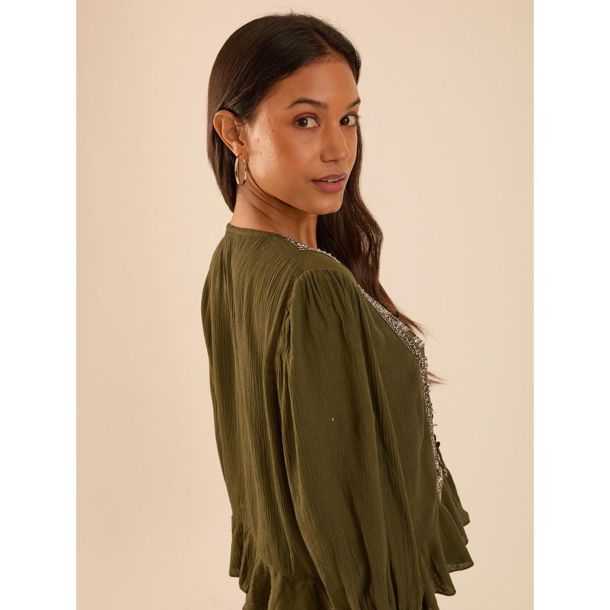 Hailey Khaki Frill Mirror Embellished Blouse Why it r★cks: The Hailey Khaki Frill Mirror Embellished Blouse is the perfect blend of effortless style and statement detailing. Crafted from premium crinkle viscose, this easy-wear blouse features a relaxed overhead shape with a flattering V-neckline. Intricate mirror embellishments add just the right touch of sparkle, while delicate tie details and a soft frill hem enhance its boho-chic appeal. A standout piece that works from day to night with ease.