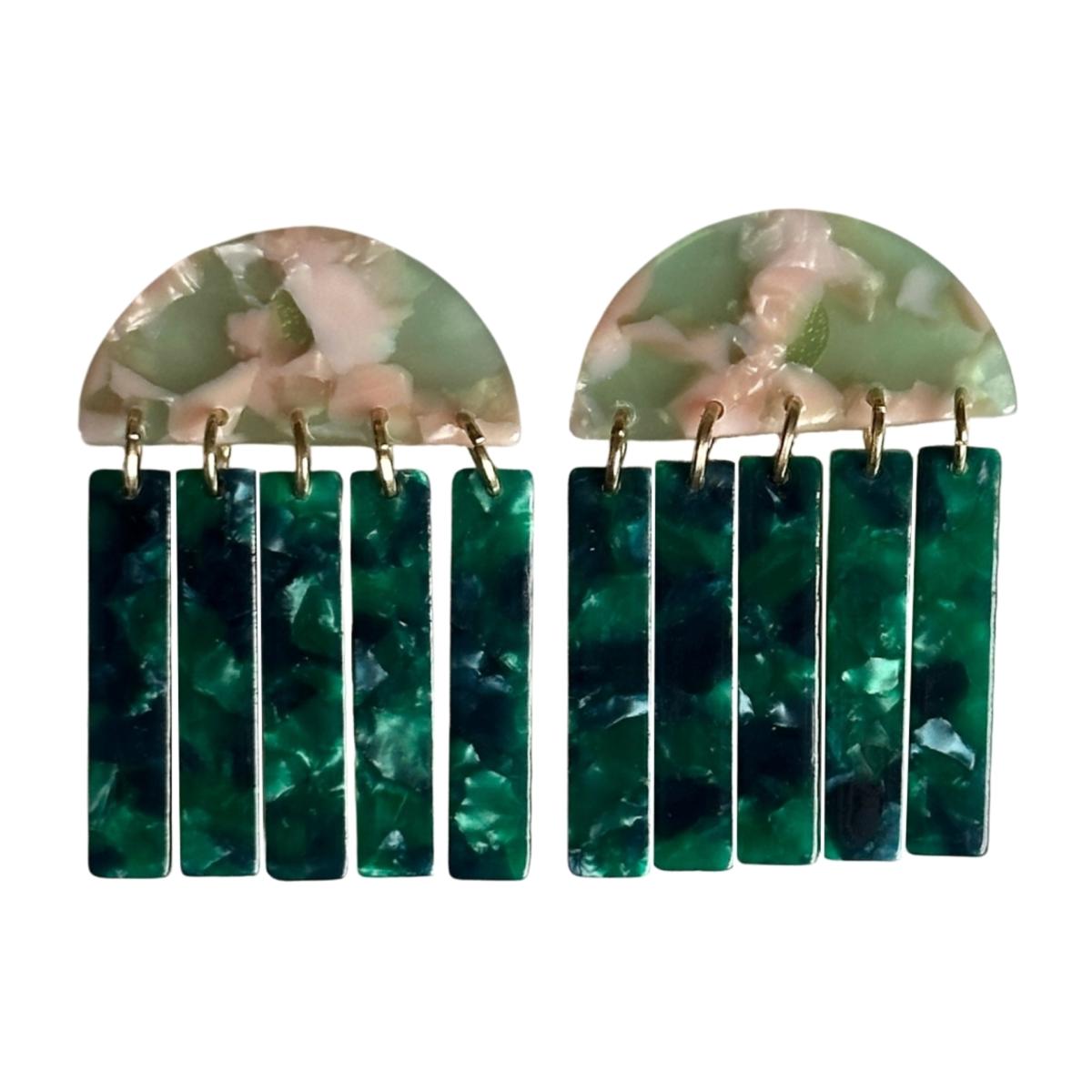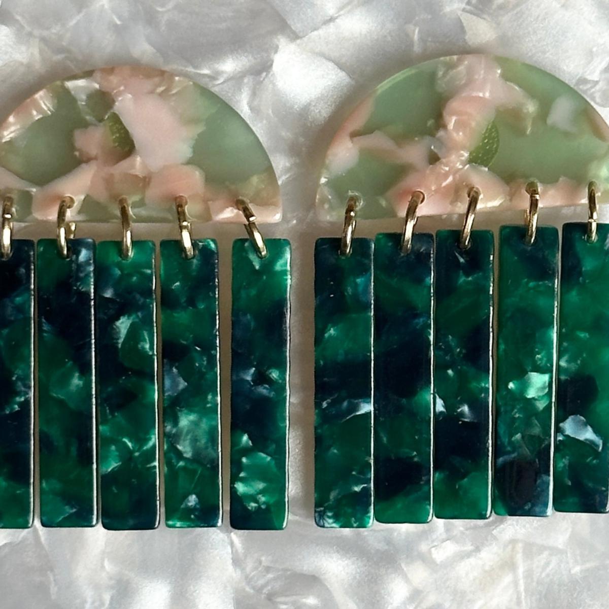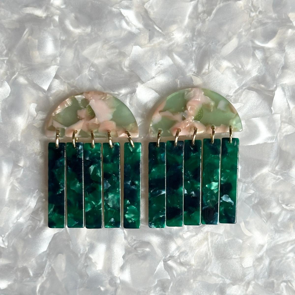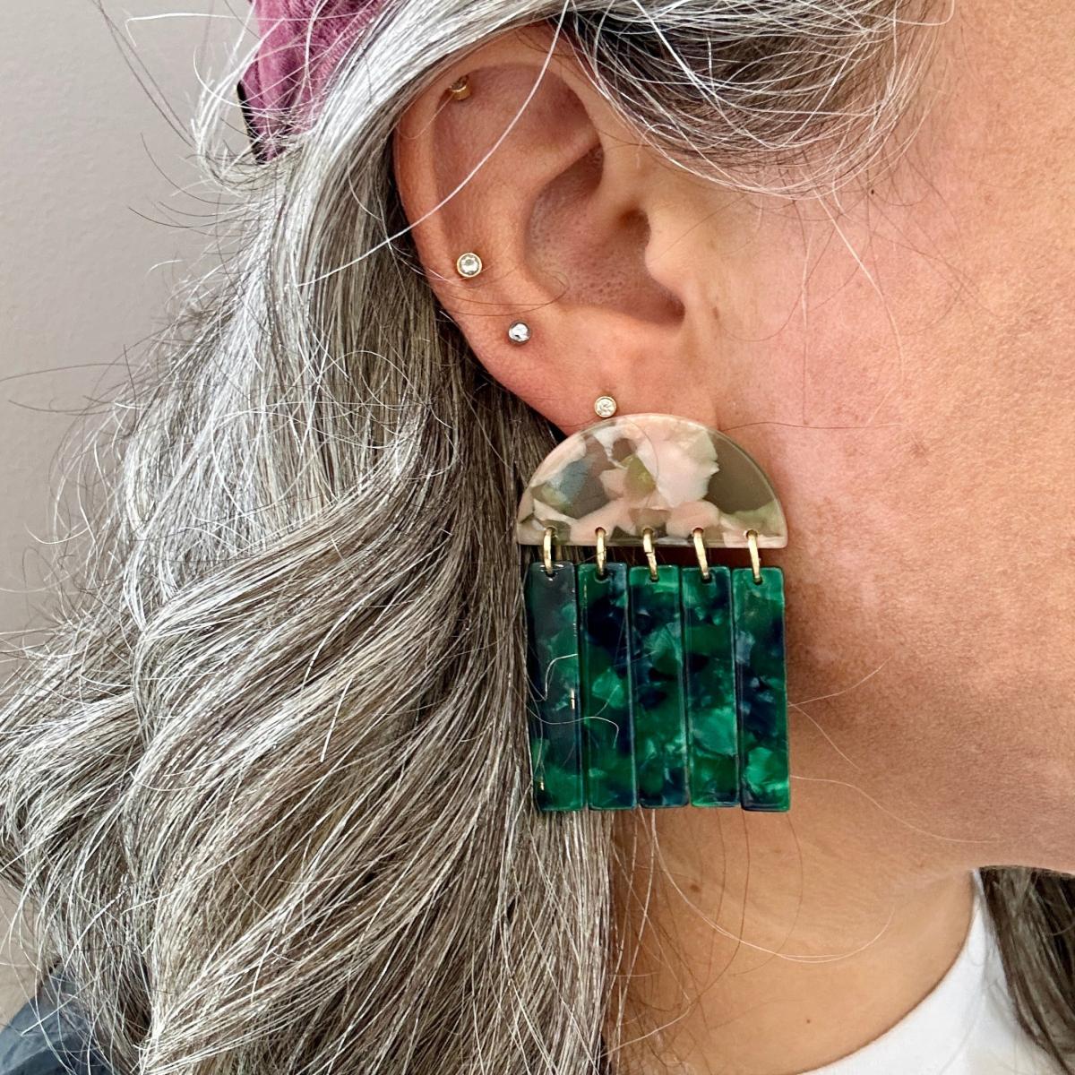 These earrings are all about movement! Features a unique half moon stud in a mix of light pink and mint green hand-swirled acrylic with a contrasting flirty fringe detail in emerald green. Designed for Closet Rehab. Handmade in Pittsburgh, PA. Made in the USA.