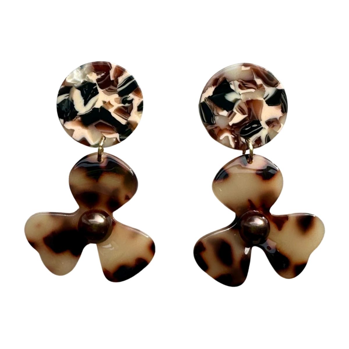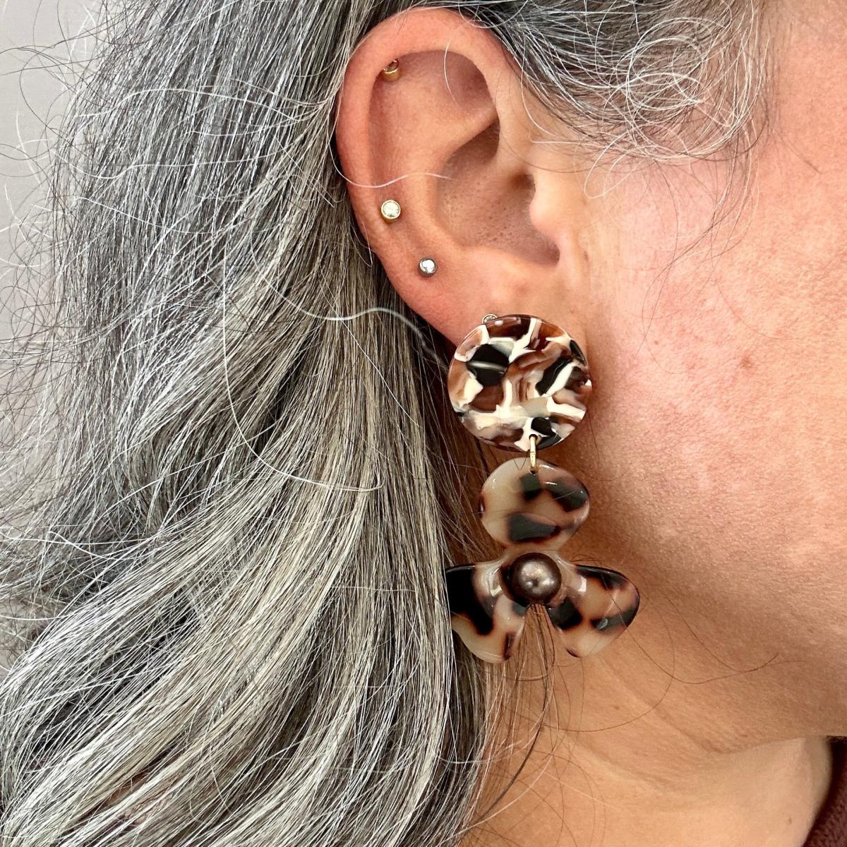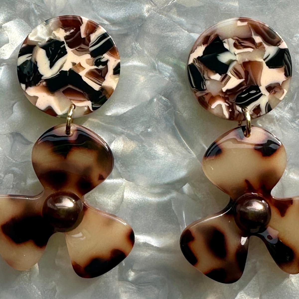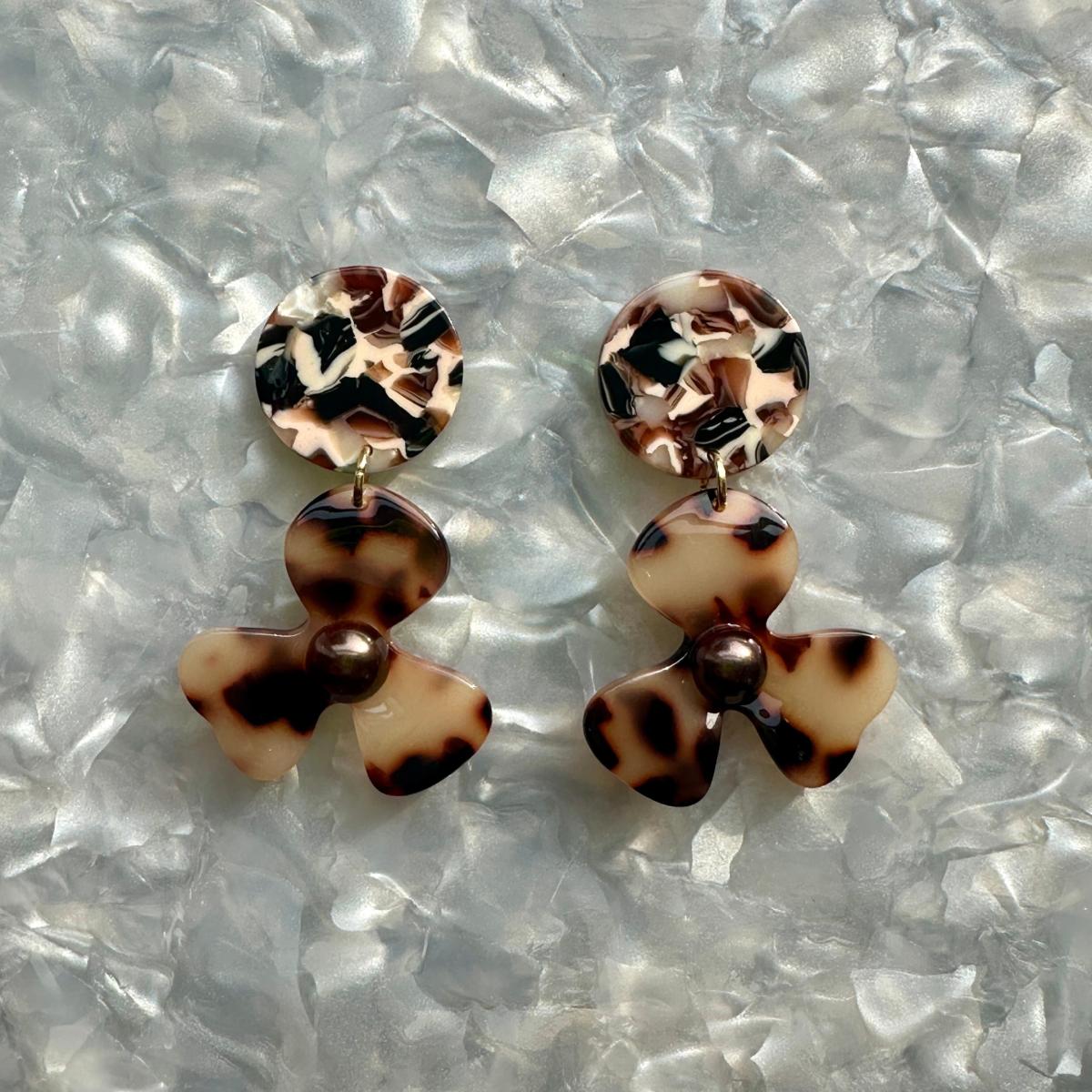 Our three-petal pearl water poppy drop earring is a must-have for any stylish babe. This lightweight, sweet pair features a blonde tortoise acrylic flower with a deep brown pearl-studded center, and a complementary cream, black, brown and white hand-swirled acrylic stud. Designed for Closet Rehab. Handmade in Pittsburgh, PA. Made in the USA.