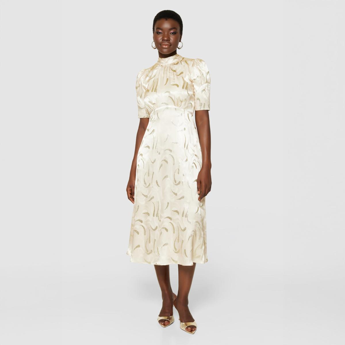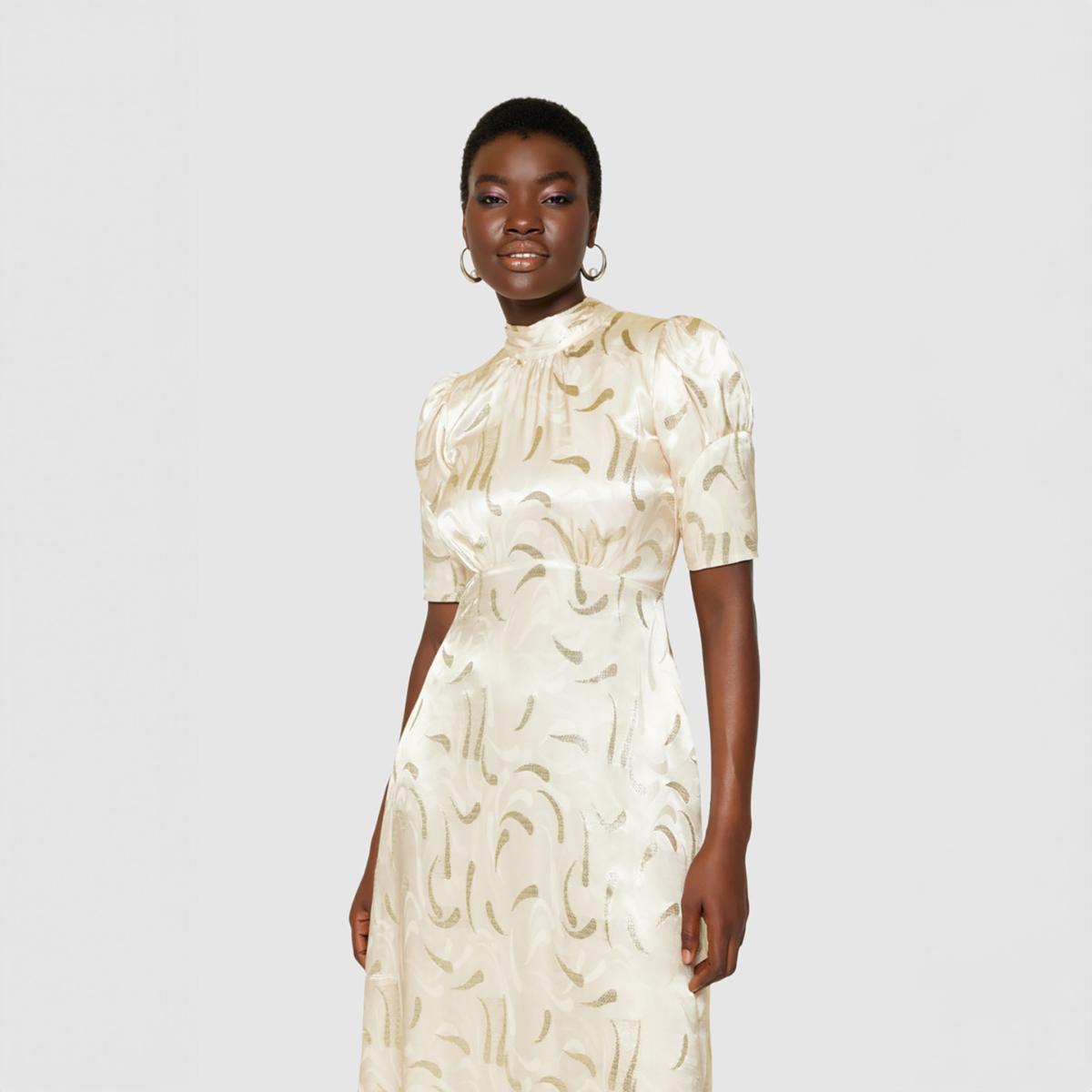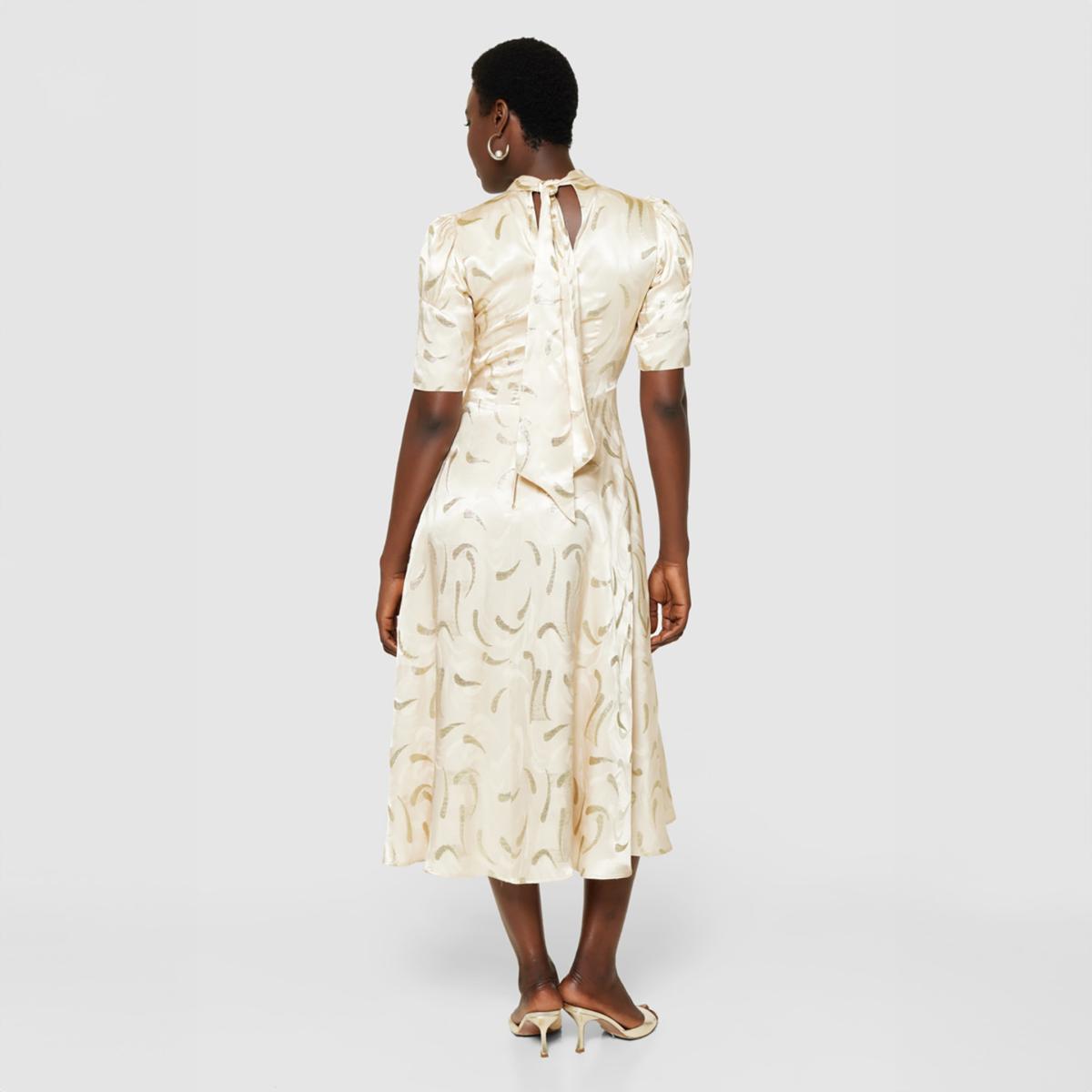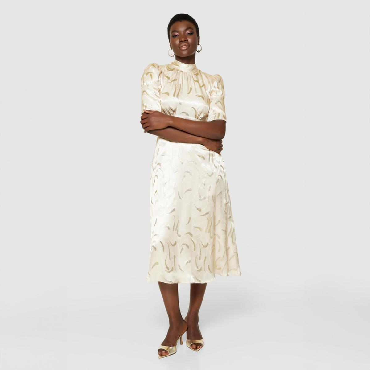 Introducing the Closet London Champagne Satin Midi Dress, a timeless piece for your special occasions. This elegant dress is crafted from luxurious satin with a subtle sheen, featuring an abstract metallic brushstroke pattern that adds a touch of sophistication. Designed with short puff sleeves and a high neckline, it offers a graceful silhouette that flatters any figure. The midi length provides a refined look, making it perfect for weddings, parties, or formal events. Complete the ensemble with heels and delicate jewellery for a polished appearance.