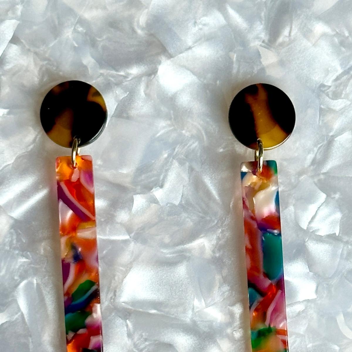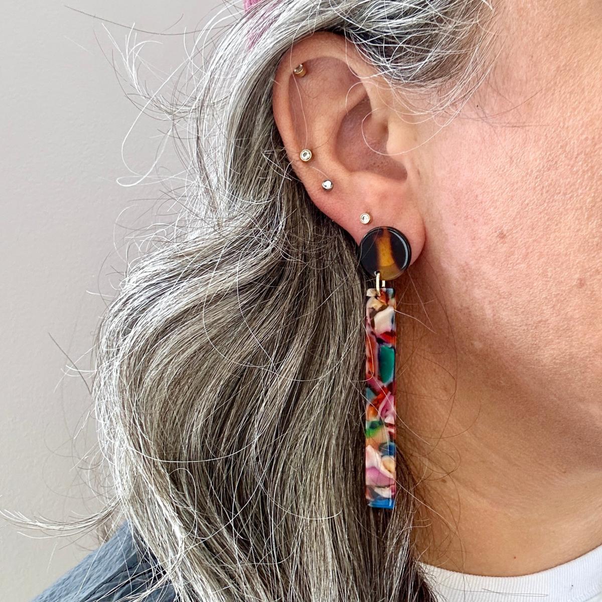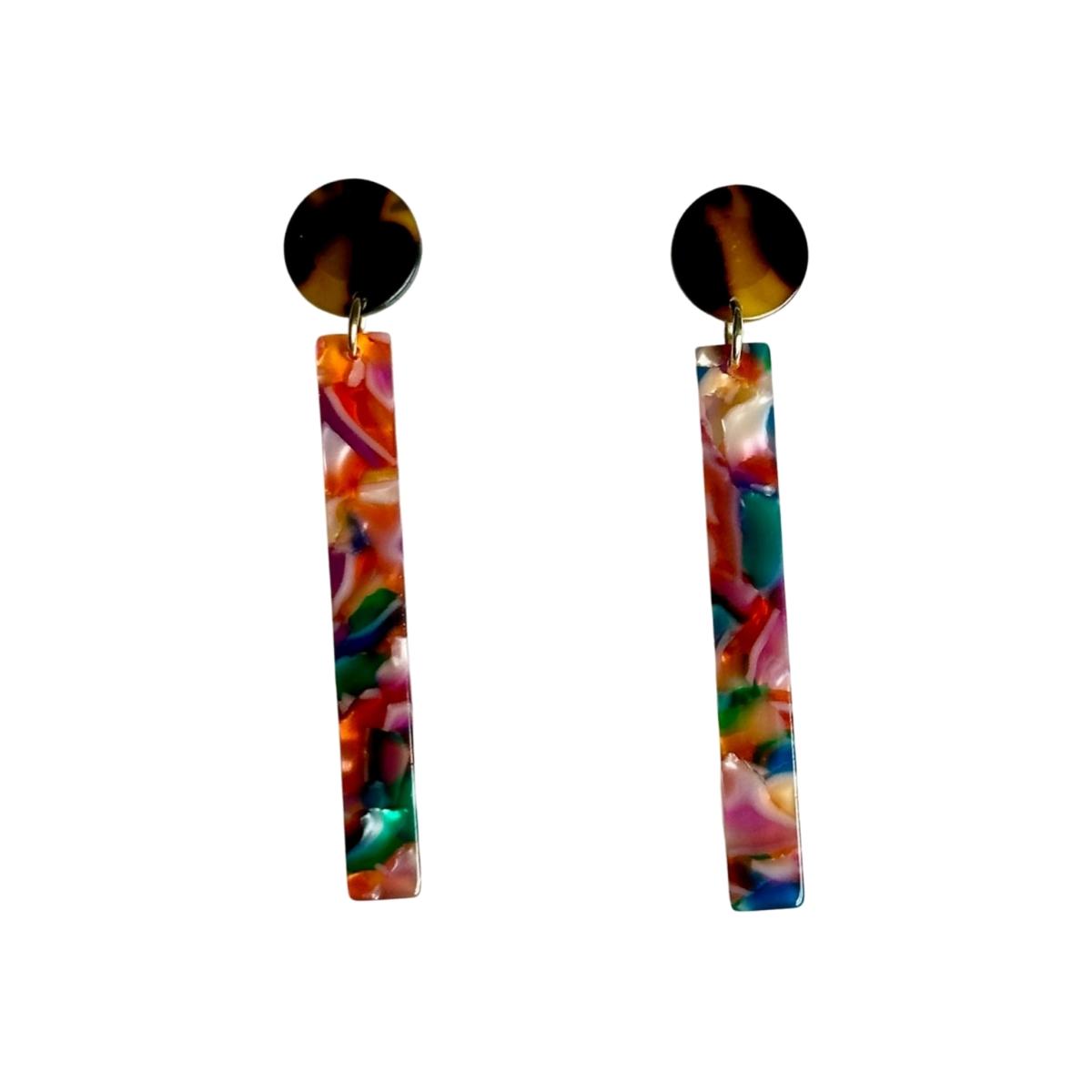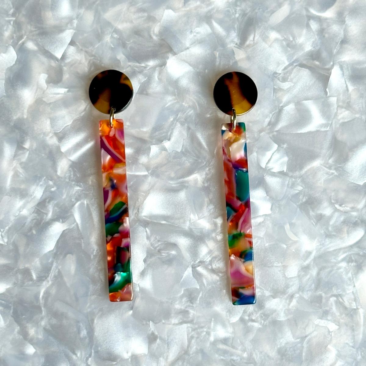 For the simple but stylish babe! Lightweight matchstick drop earrings in a multicolor hand-swirled acrylic with a complementary tortoise stud. Designed for Closet Rehab. Handmade in Pittsburgh, PA. Made in the USA.