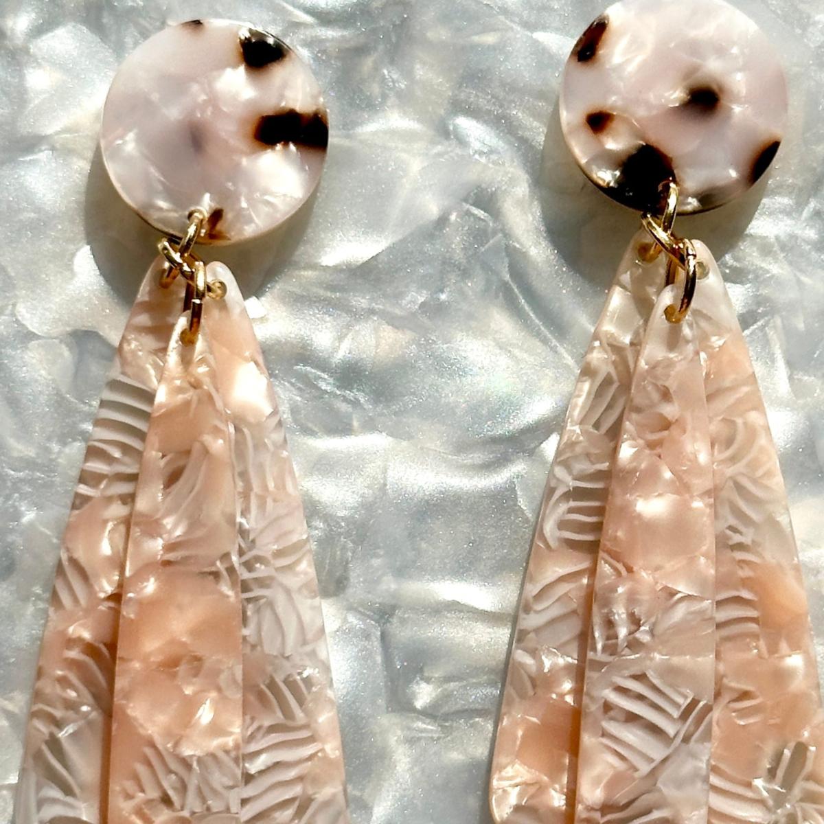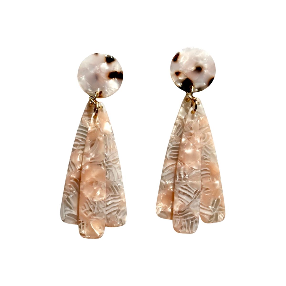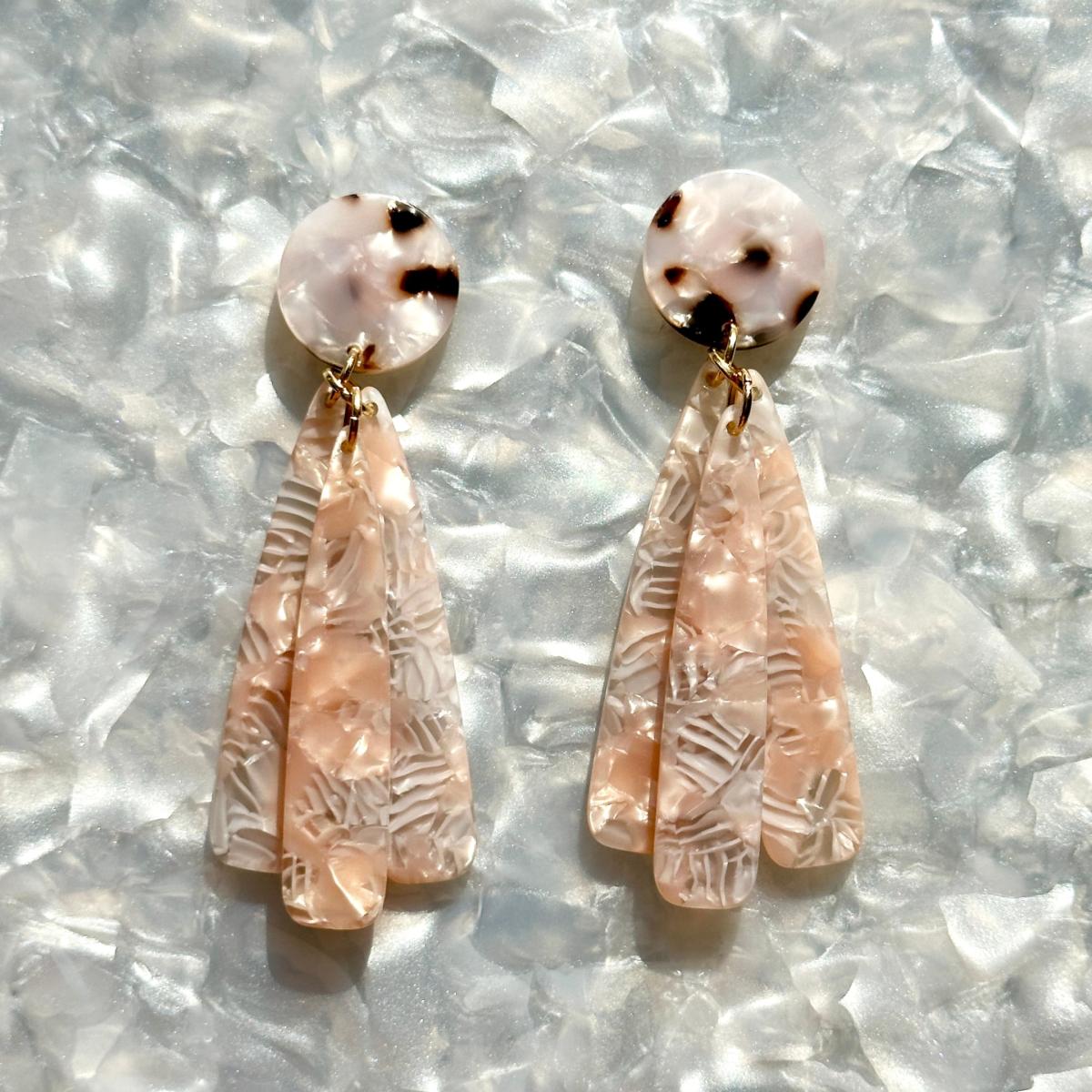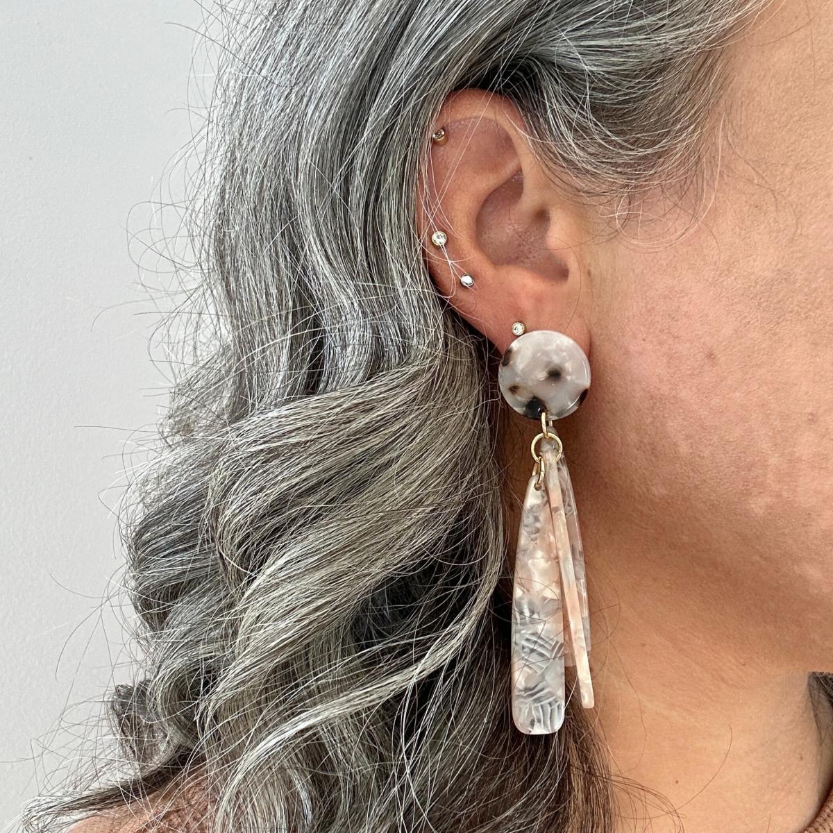 Add a feminine and flirty touch to your look with our petal drop earrings. These unique earrings feature a playful trio of blush pink and light grey hand-swirled acrylic petals, dangling from a pearly tortoise circle stud. Designed for Closet Rehab. Handmade in Pittsburgh, PA. Made in the USA.