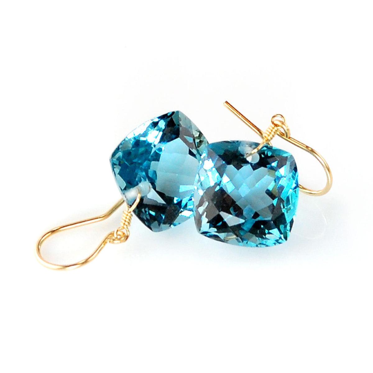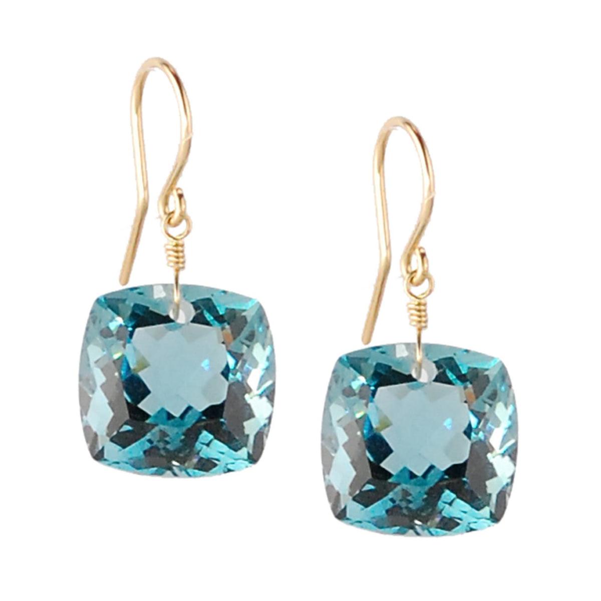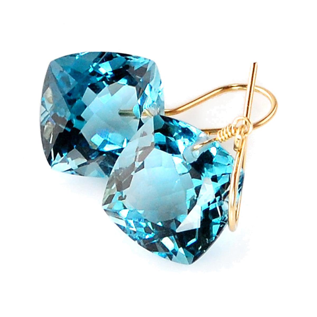 A stunning pair of cushion cut blue topaz dangle from a hand-crafted French ear wires. Stones are 14mm x 14mm. Available in 18 karat yellow or white gold, 14 karat yellow or white gold, 14 karat gold-fill and.930 Argentium sterling silver.