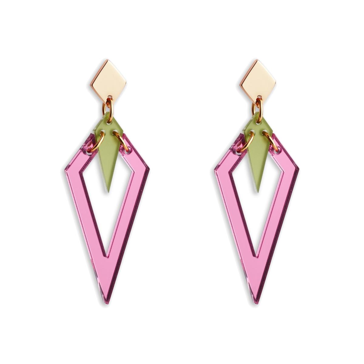 Designed for the daring sophisticate, our Arrowheads in Pink Mirror and Green bring a sharp impact to the simplest outfit. Pair with a blazer and jeans for a striking look at work or play. Sharp, angular and elegant. The Arrowheads hang from unique, diamond-shaped ear studs before plunging down into the shape twice more. The repetition of the diamond makes them the perfect accomplice to a round face shape as the sleek, geometrical design enhances the jawline and elongates the neck. The Pink Mirror and Green colour combo provides an effortless, carefree vibe without sacrificing the dramatic nature of the design.