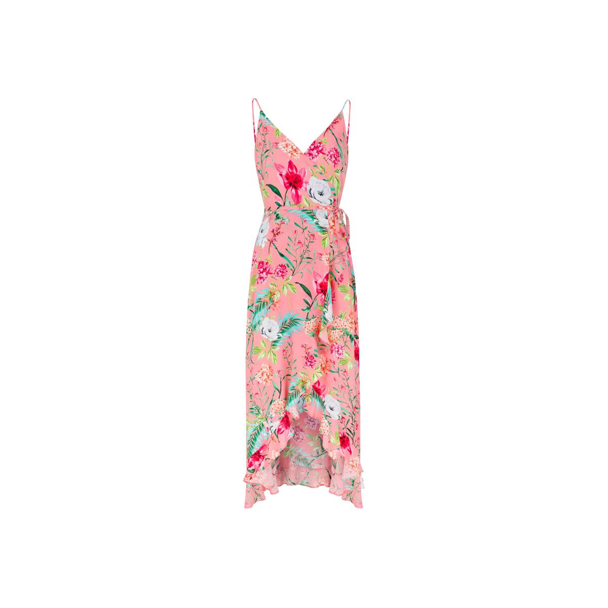Very sensual and extremely feminine. With a deep, seductive V-neck and a flared bottom finished with a decorative, tempting frill. Without a doubt, summer this year promises to be hot. Diana Pink Flowers dress is a light, strappy dress made of 100% viscose, delicate for the body, suggested for women who want to emphasis their summer image in an original and elegant way. The dress from Saint. By is of wrap dress type and features adjustable straps, allowing for a comfortable fit of the dress to your figure. Its asymmetrical cut is a leading trend in the fashion world. And the ethereal fabric, decorated with a wonderful floral pattern against a girlish pink background, is very impressive. Composition: 100% viscose Hand wash in cold water Cool Iron Do not bleach Do not tumble dry