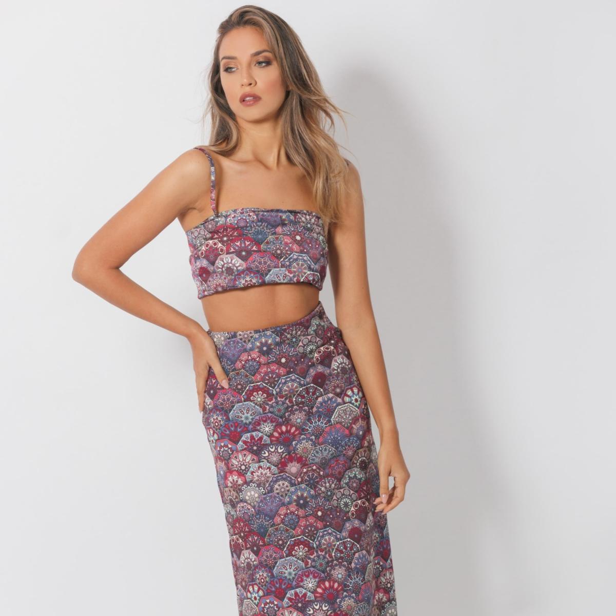 This bustier is a must-have for your summer wardrobe! It has thin straps and is made of fabric with a colorful print. You can combine it either with the skirt of the same print or with white or denim pants