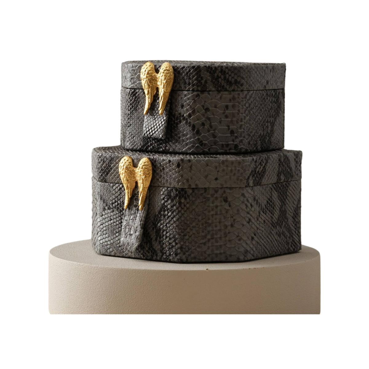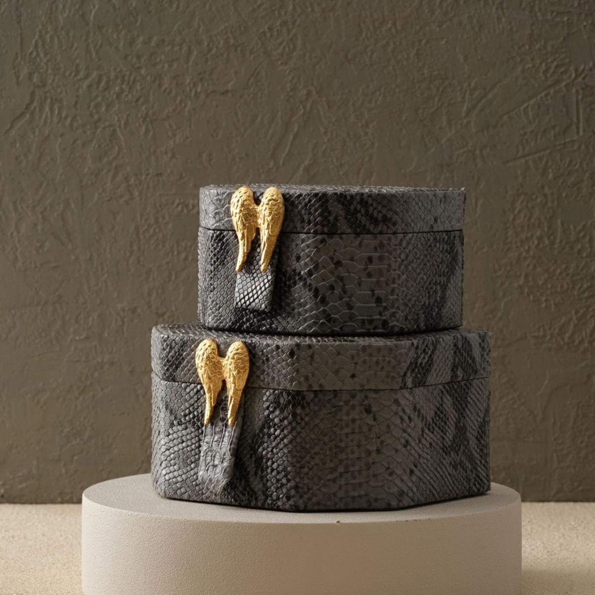 Refined and opulent, this two-piece grey snake-embossed leather storage box set features stunning gold angel wing accents. The textured grey leather exudes timeless sophistication, while the golden embellishments add a regal touch. These versatile storage boxes are perfect for organizing your treasures or serving as chic decor accents in modern and classic interiors alike.